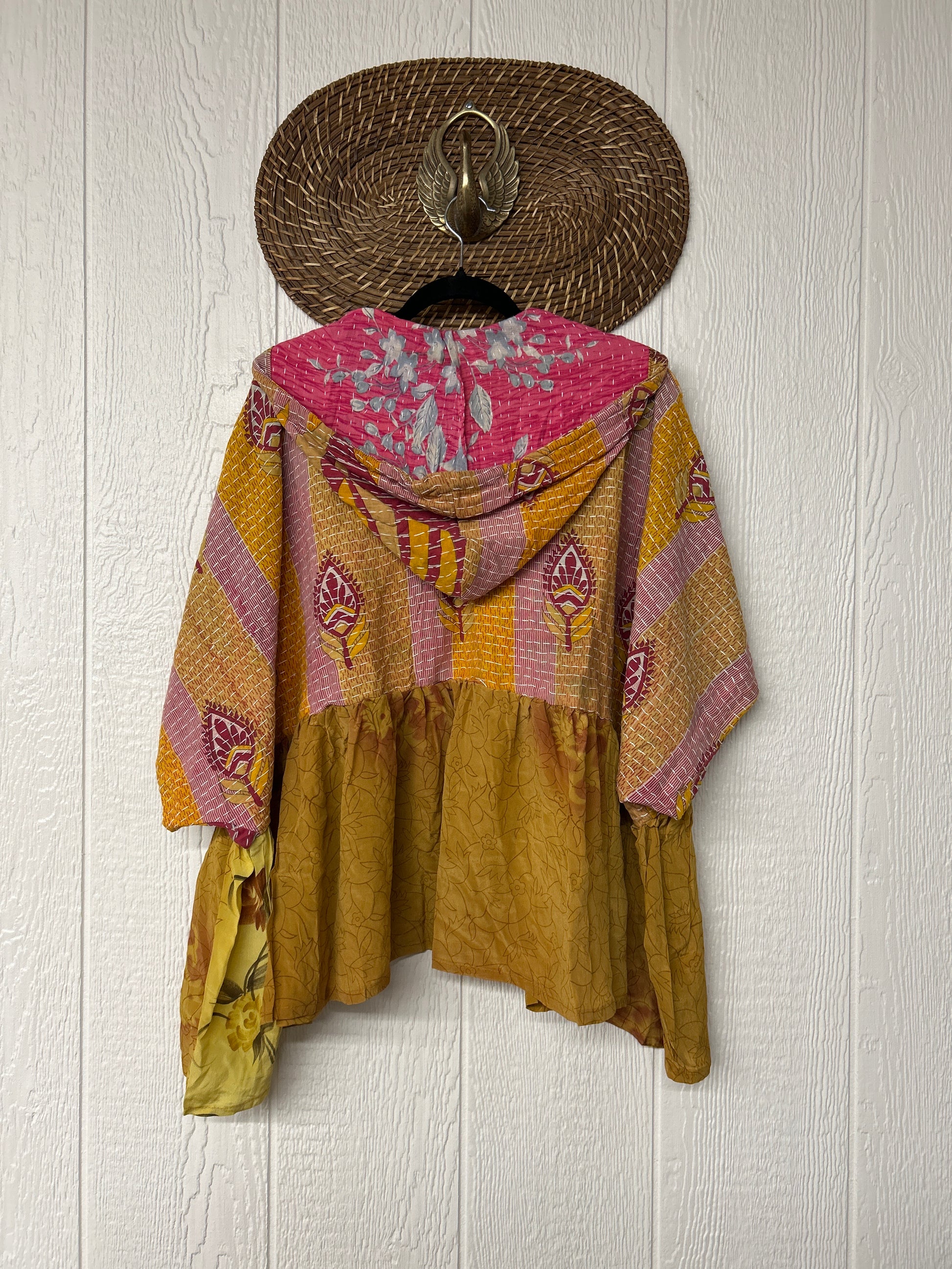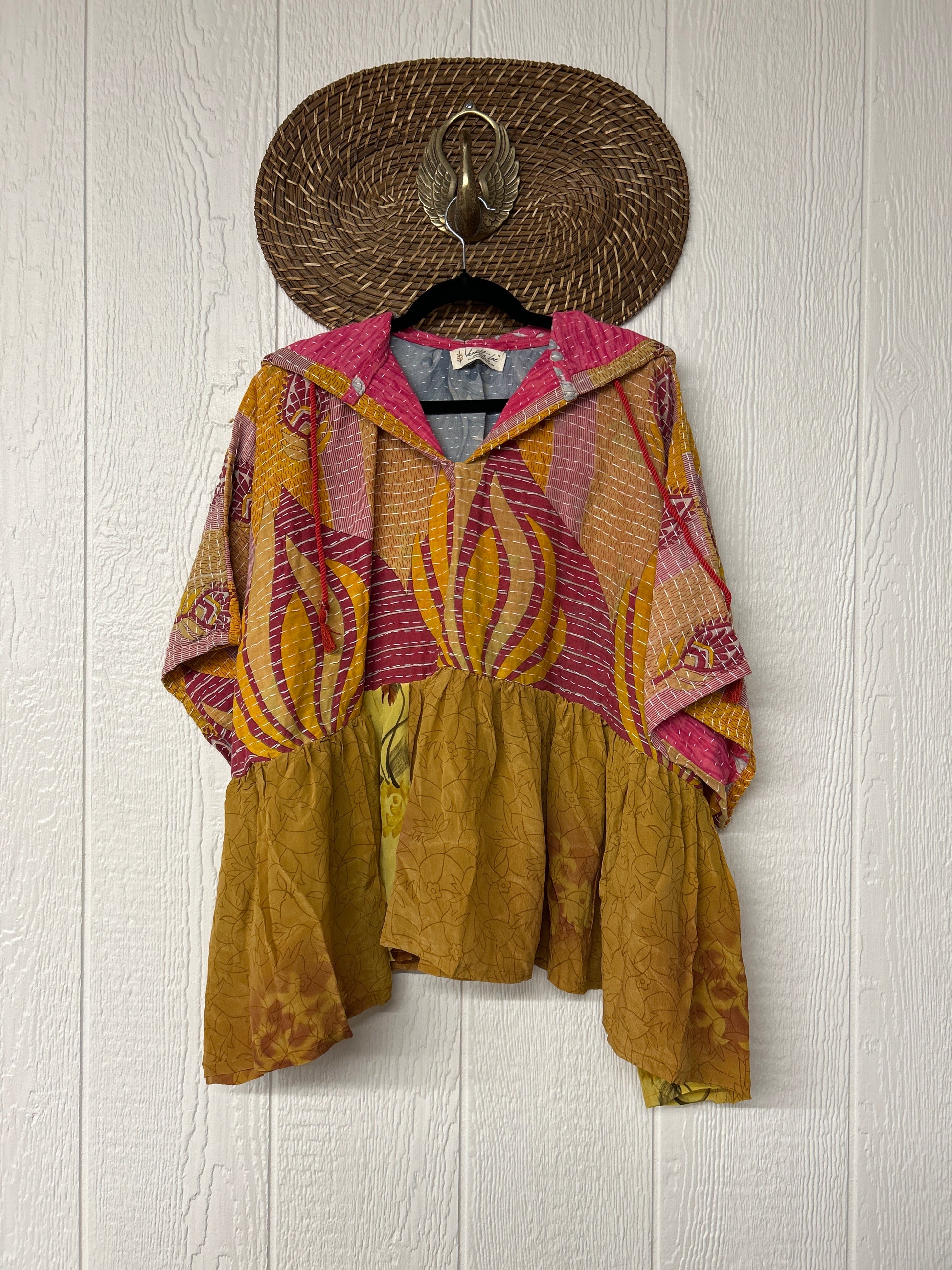 Your favorite throw on and go piece is made out of our vintage kantha embroidered sari with a crepe sari flounce. This poncho like silhouette is a flowy floaty dream.