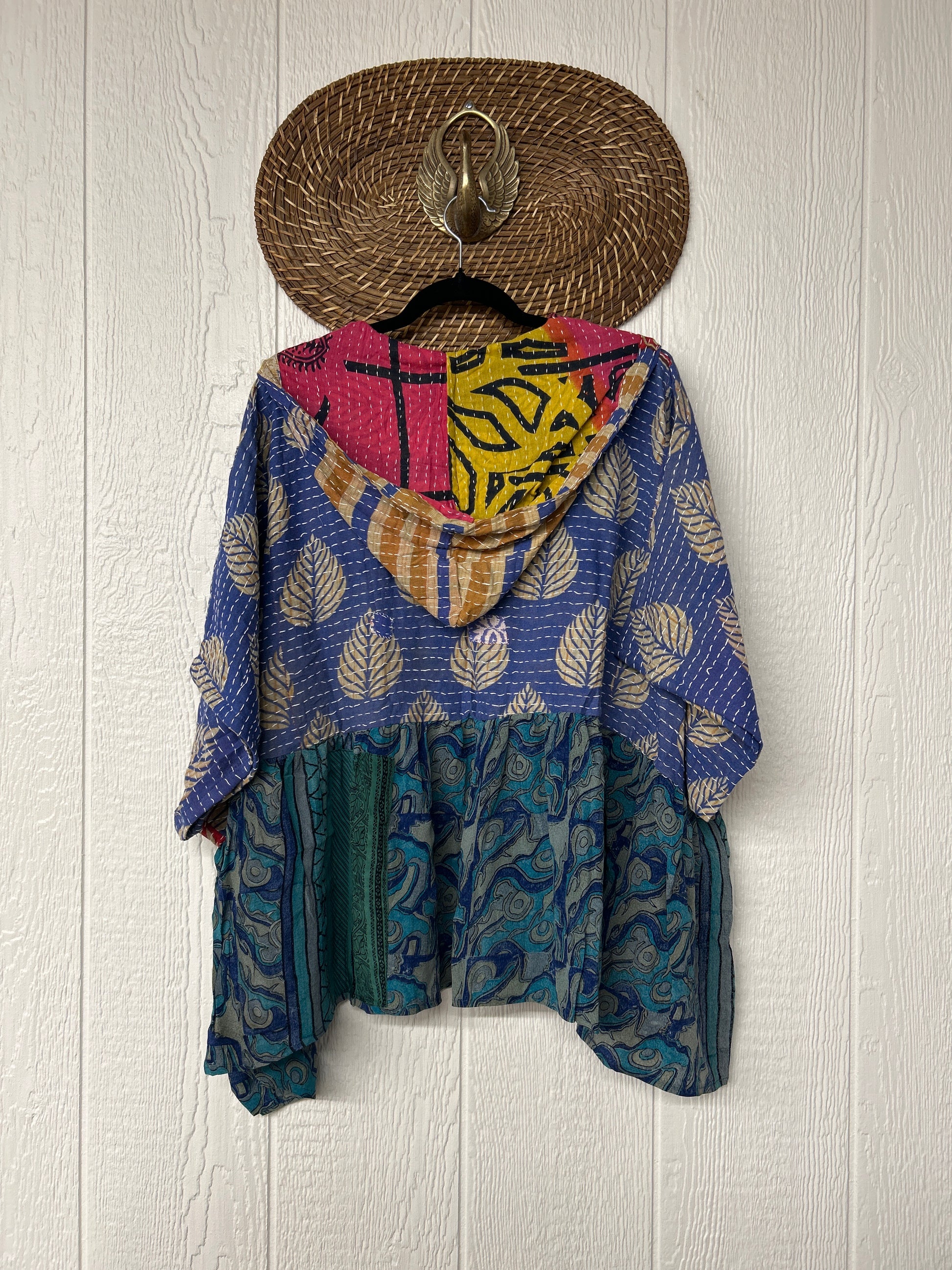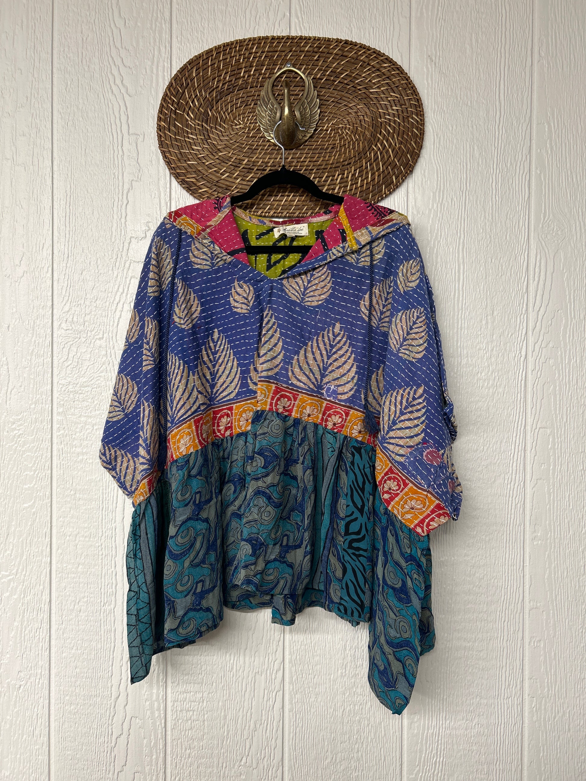 Your favorite throw on and go piece is made out of our vintage kantha embroidered sari with a crepe sari flounce. This poncho like silhouette is a flowy floaty dream.