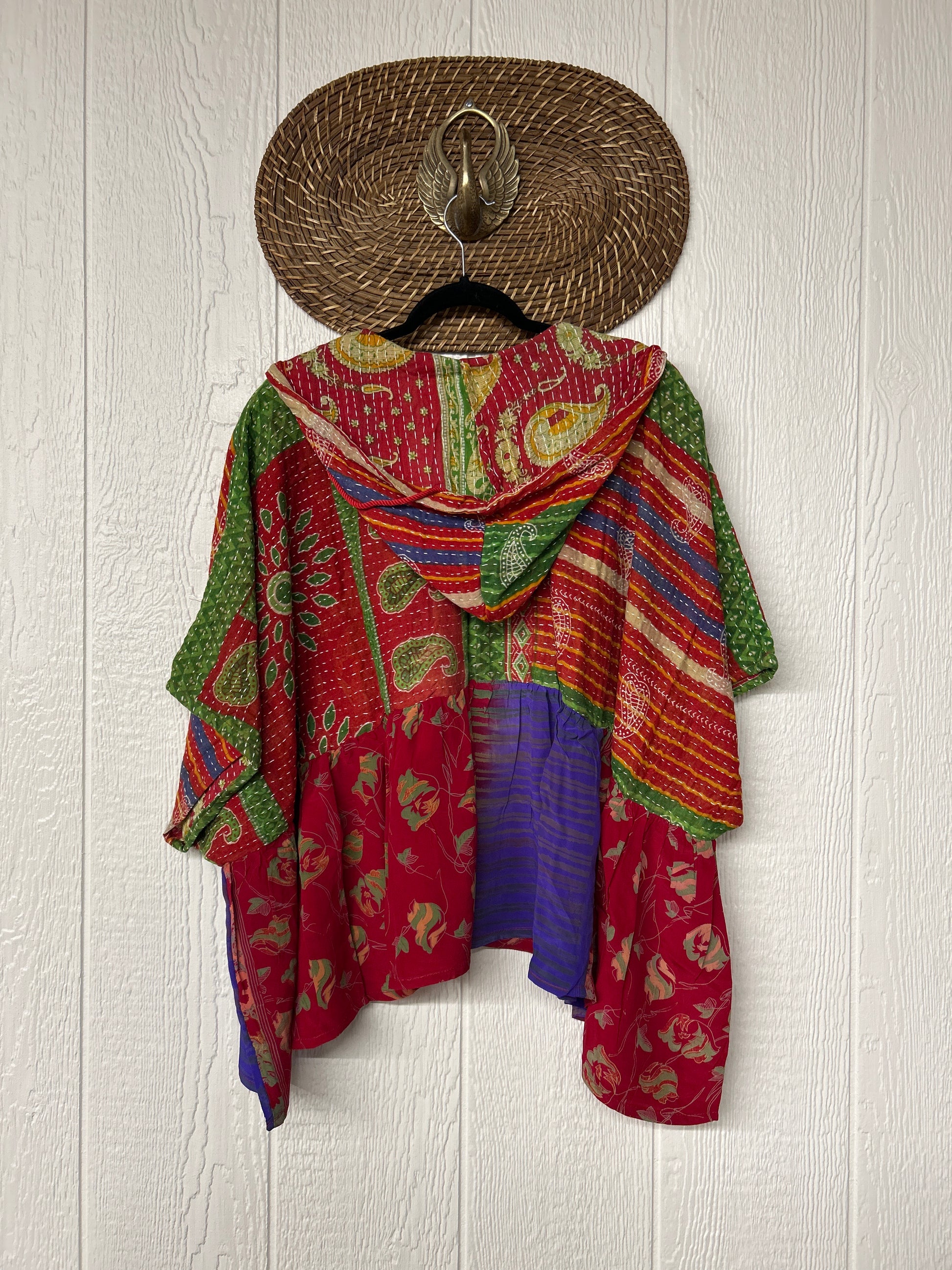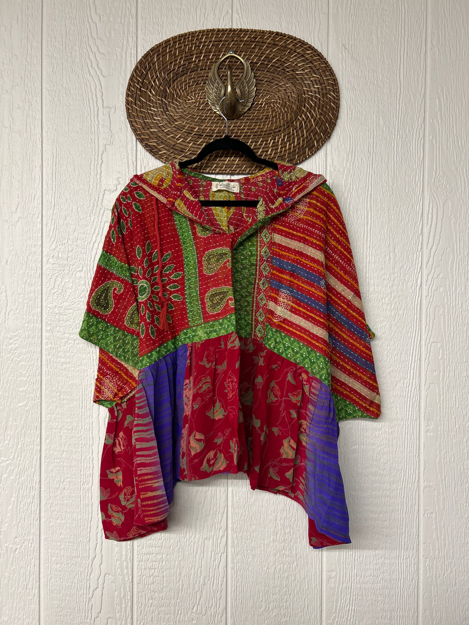 Your favorite throw on and go piece is made out of our vintage kantha embroidered sari with a crepe sari flounce. This poncho like silhouette is a flowy floaty dream.