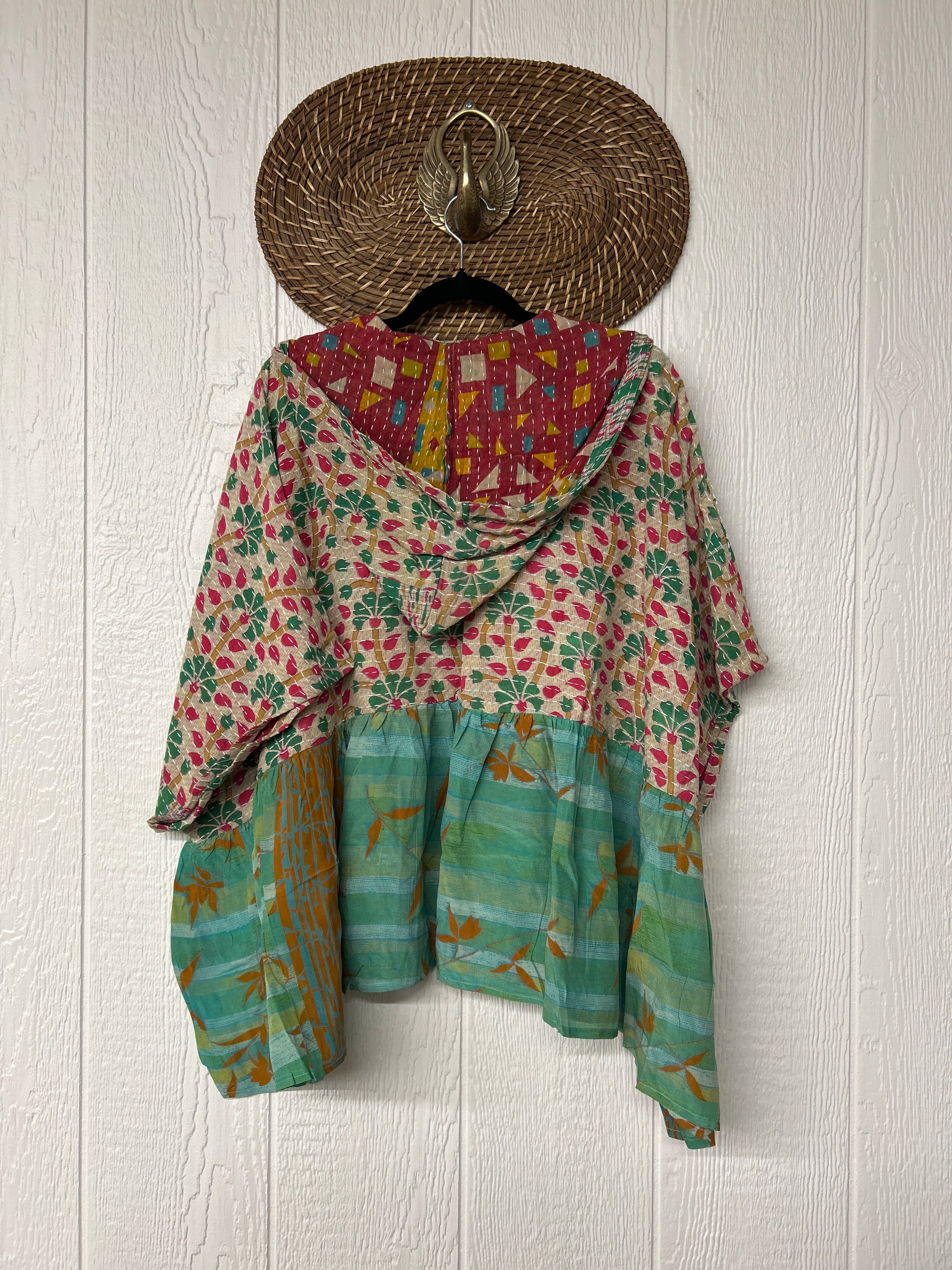 Your favorite throw on and go piece is made out of our vintage kantha embroidered sari with a crepe sari flounce. This poncho like silhouette is a flowy floaty dream.