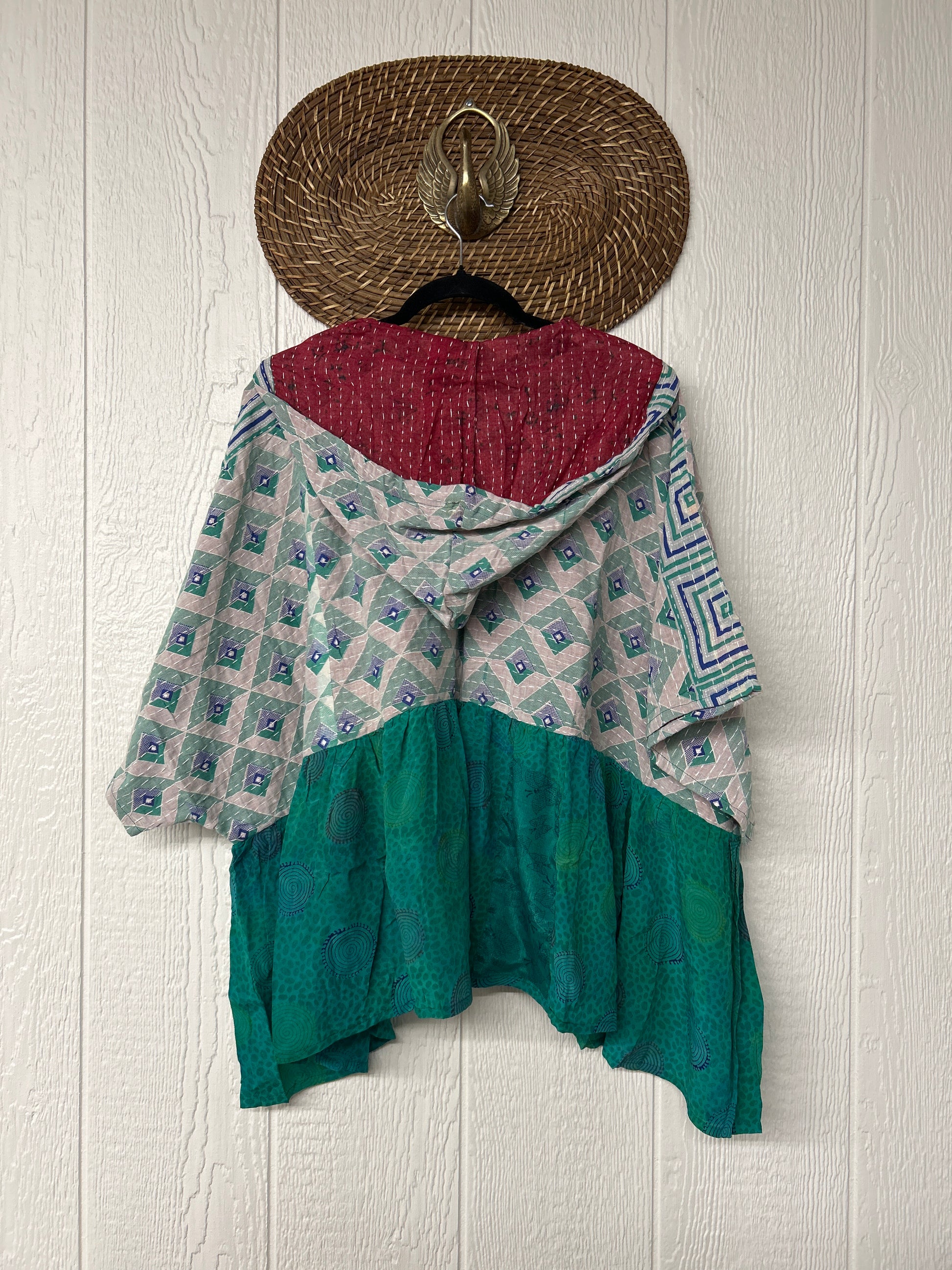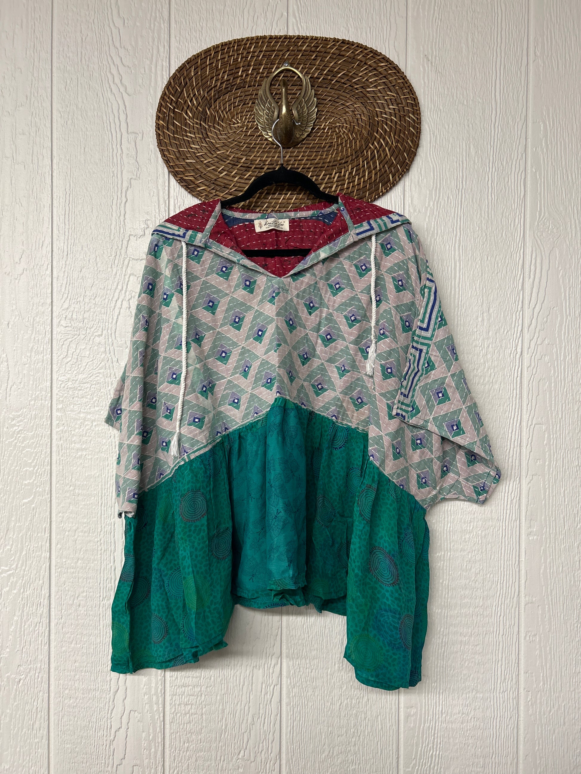 Your favorite throw on and go piece is made out of our vintage kantha embroidered sari with a crepe sari flounce. This poncho like silhouette is a flowy floaty dream.