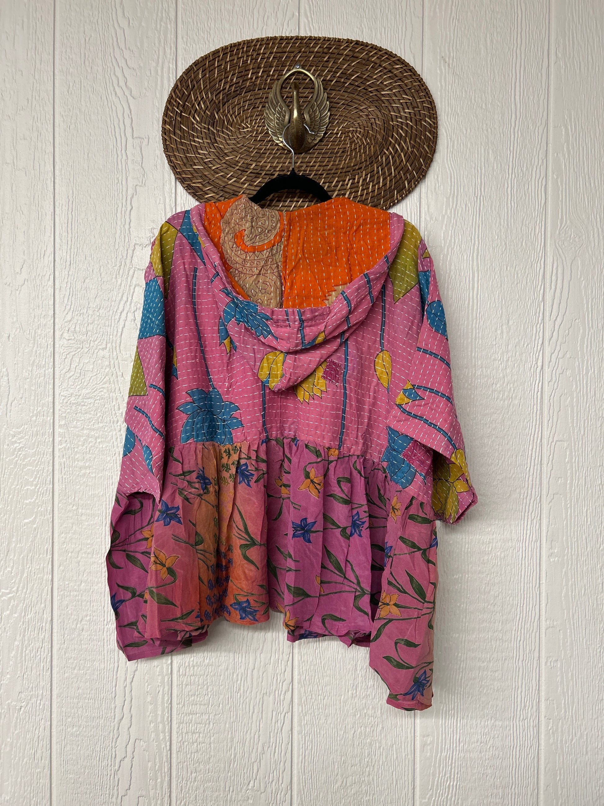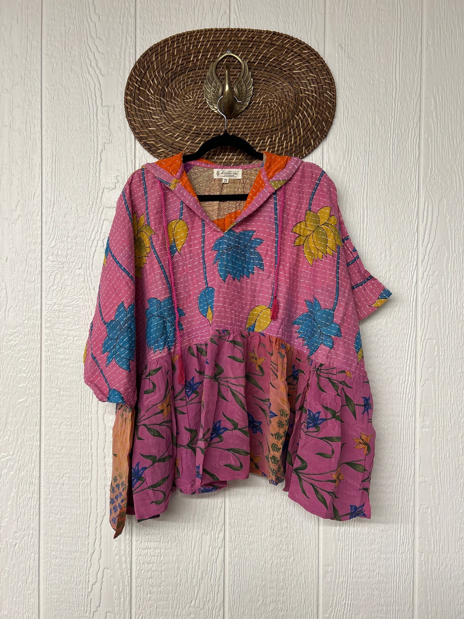 Your favorite throw on and go piece is made out of our vintage kantha embroidered sari with a crepe sari flounce. This poncho like silhouette is a flowy floaty dream.
