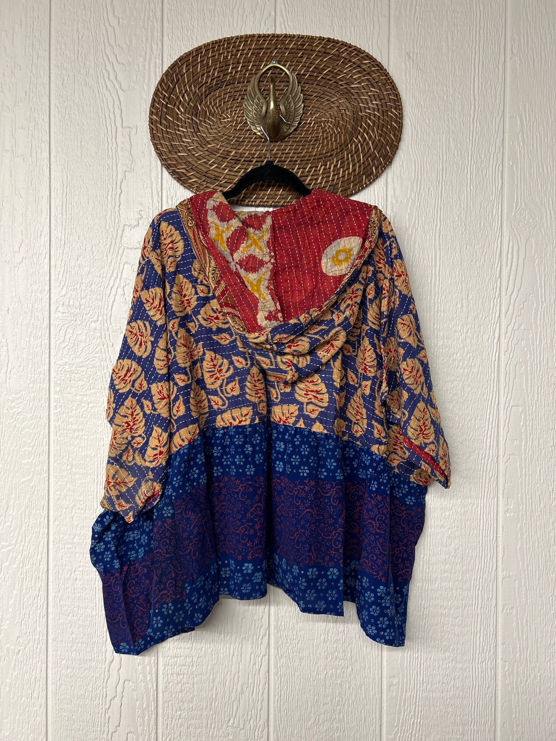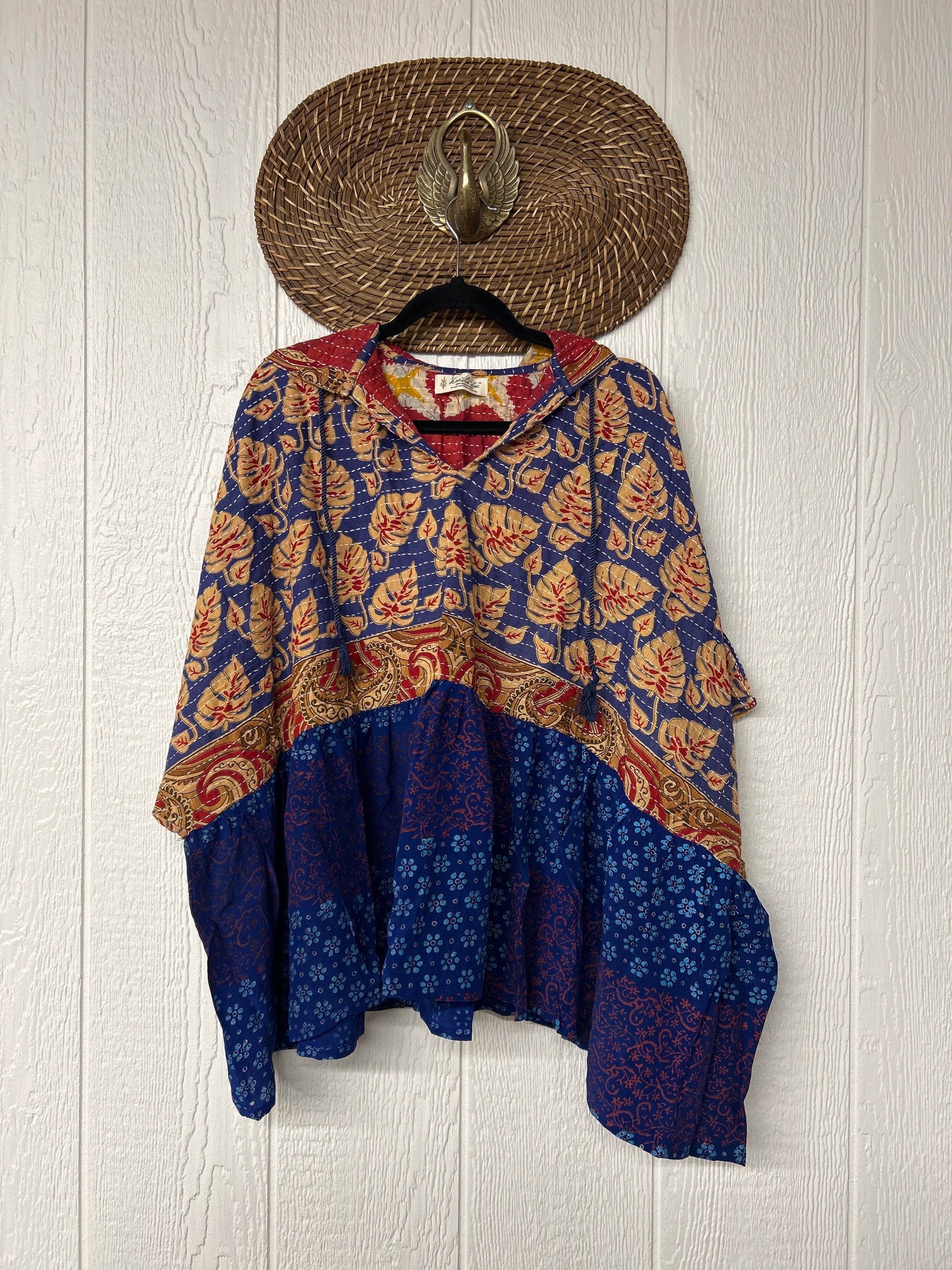 Your favorite throw on and go piece is made out of our vintage kantha embroidered sari with a crepe sari flounce. This poncho like silhouette is a flowy floaty dream.