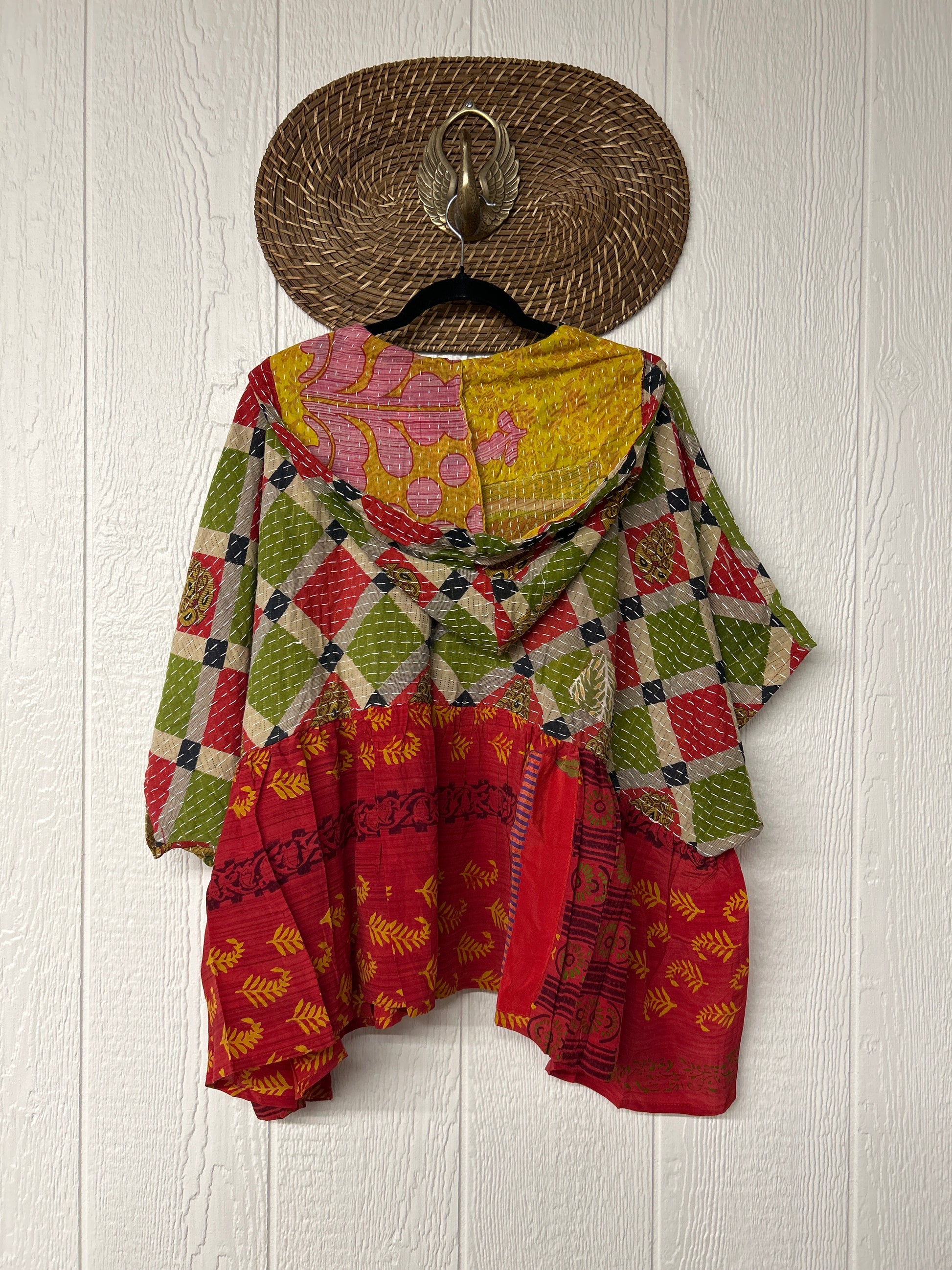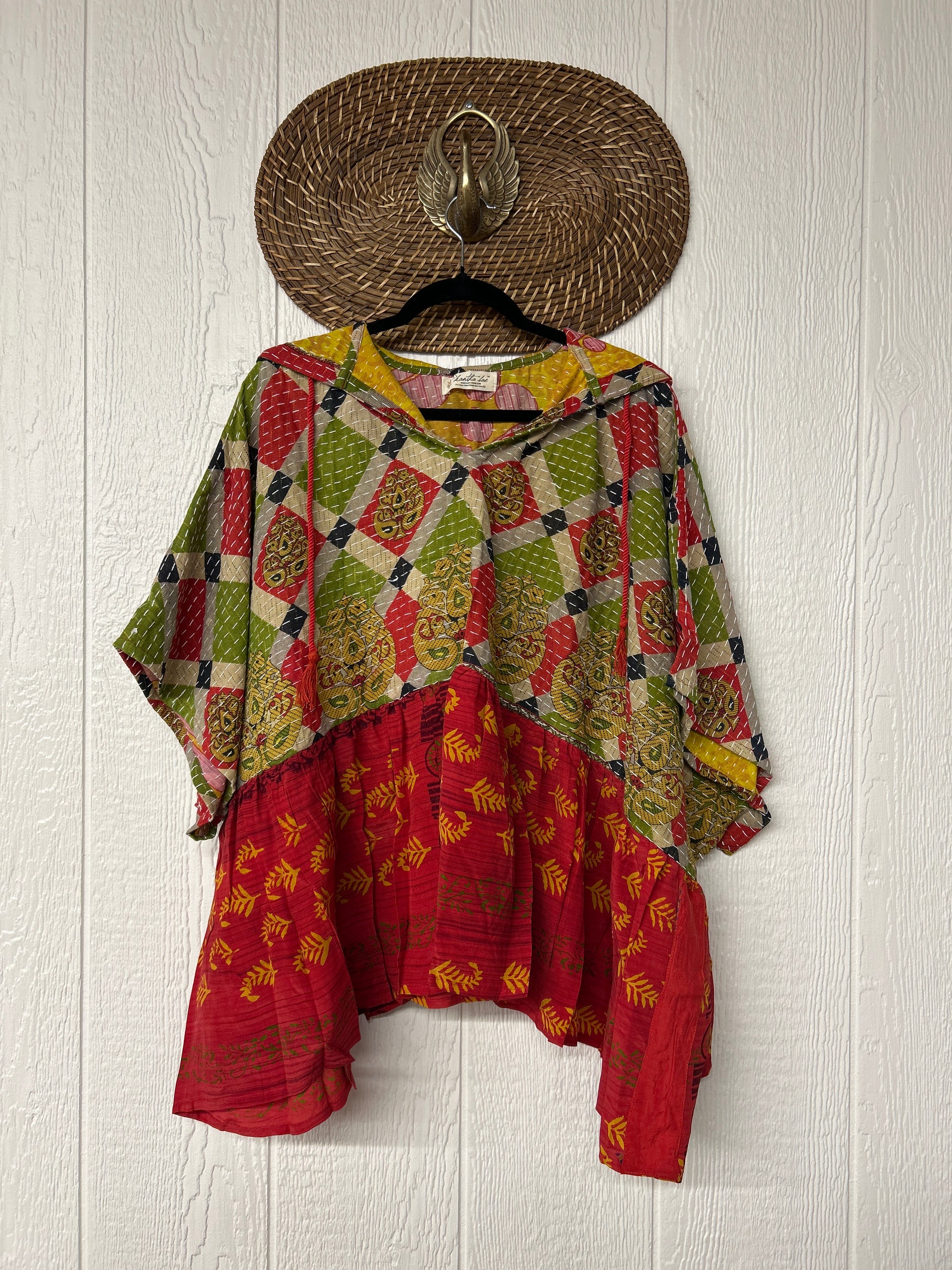 Your favorite throw on and go piece is made out of our vintage kantha embroidered sari with a crepe sari flounce. This poncho like silhouette is a flowy floaty dream.