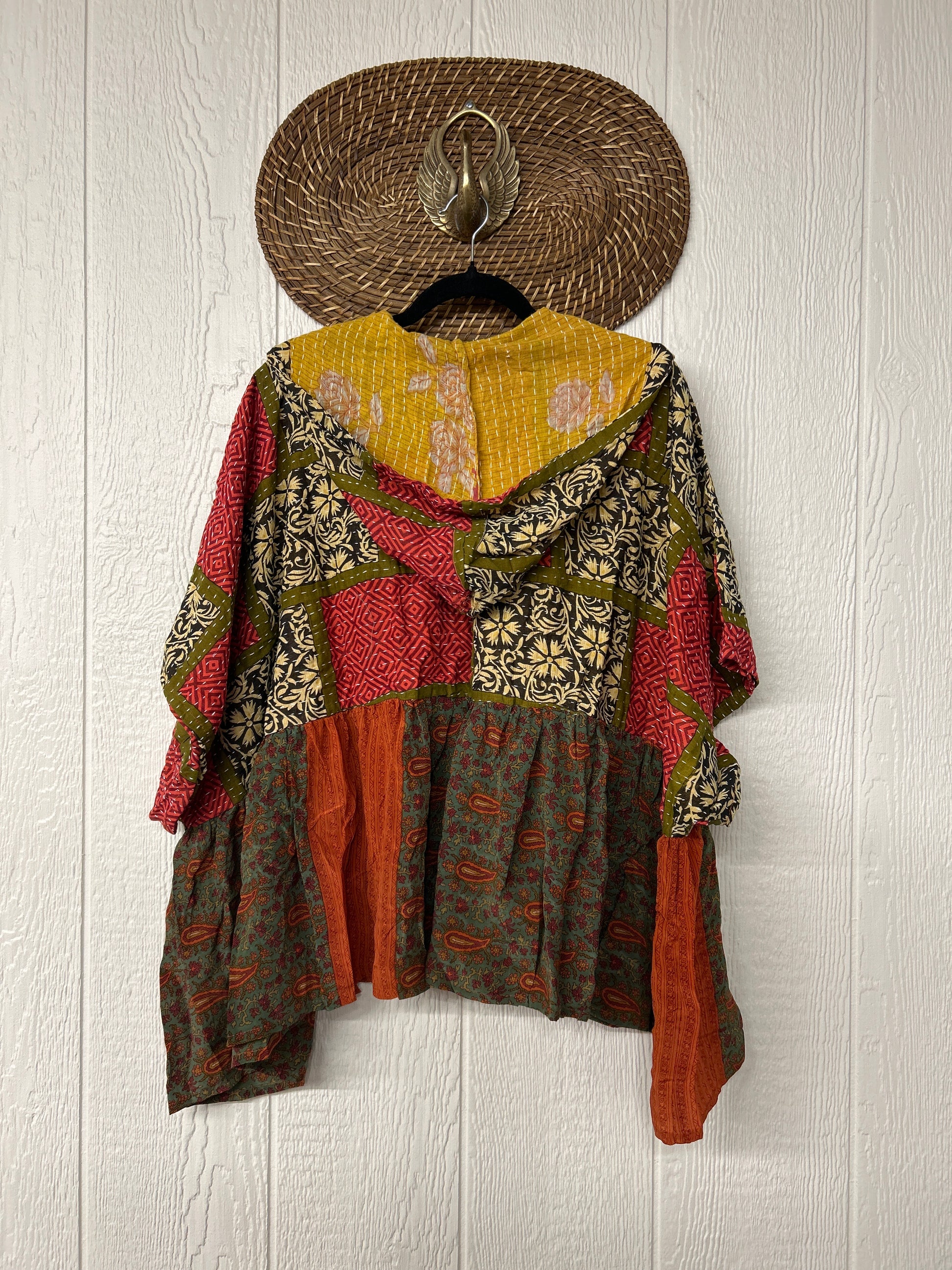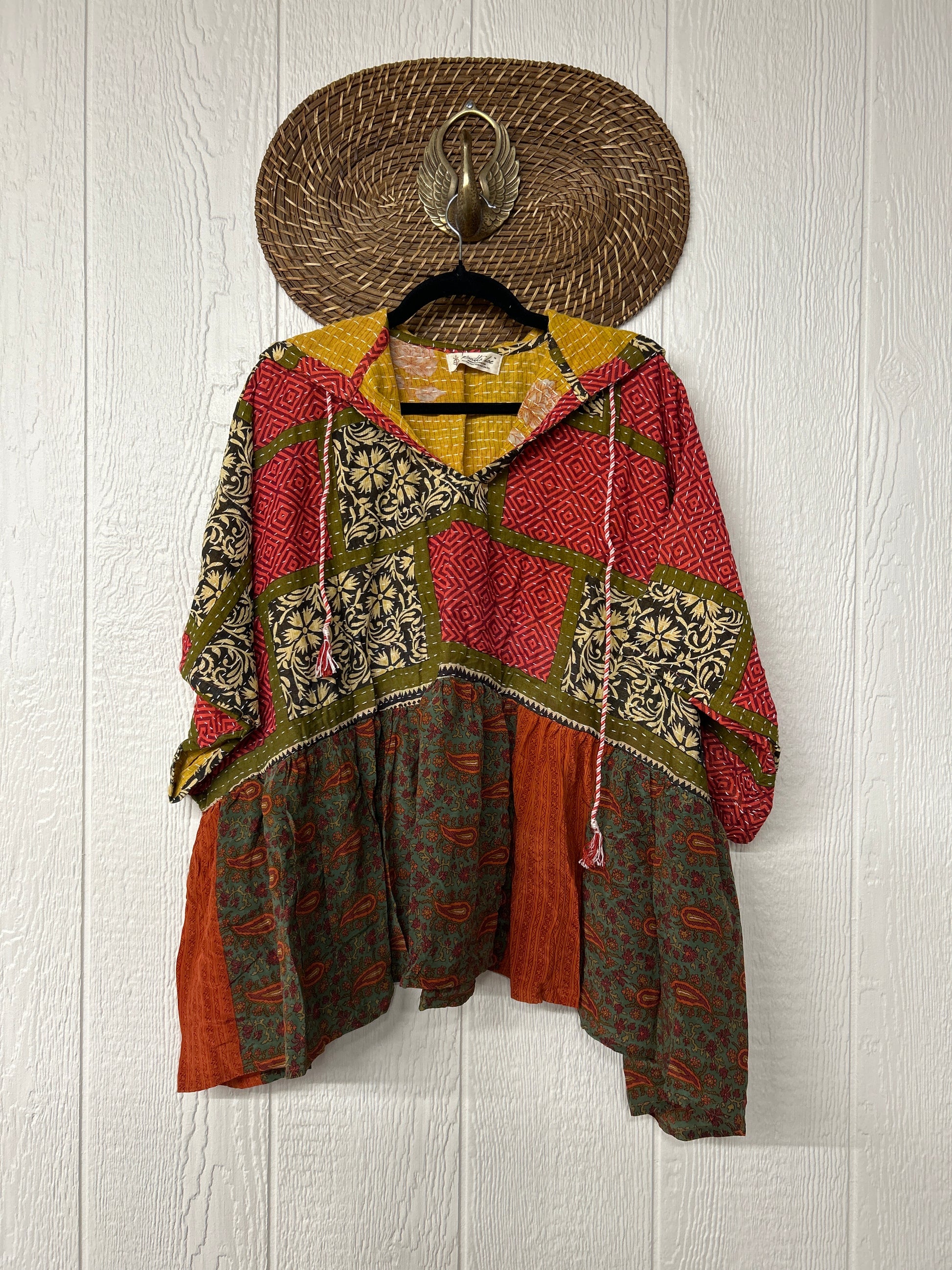 Your favorite throw on and go piece is made out of our vintage kantha embroidered sari with a crepe sari flounce. This poncho like silhouette is a flowy floaty dream.