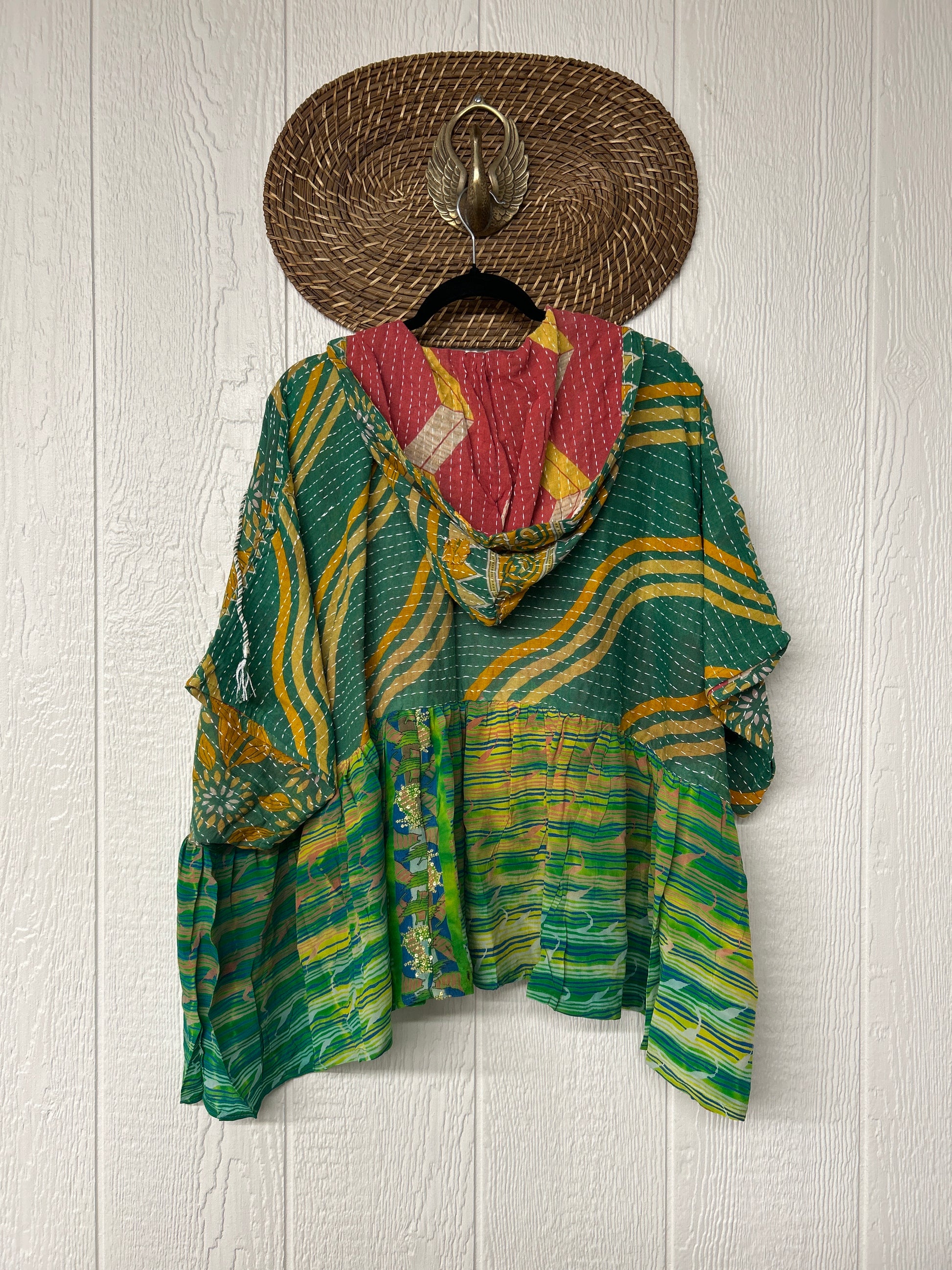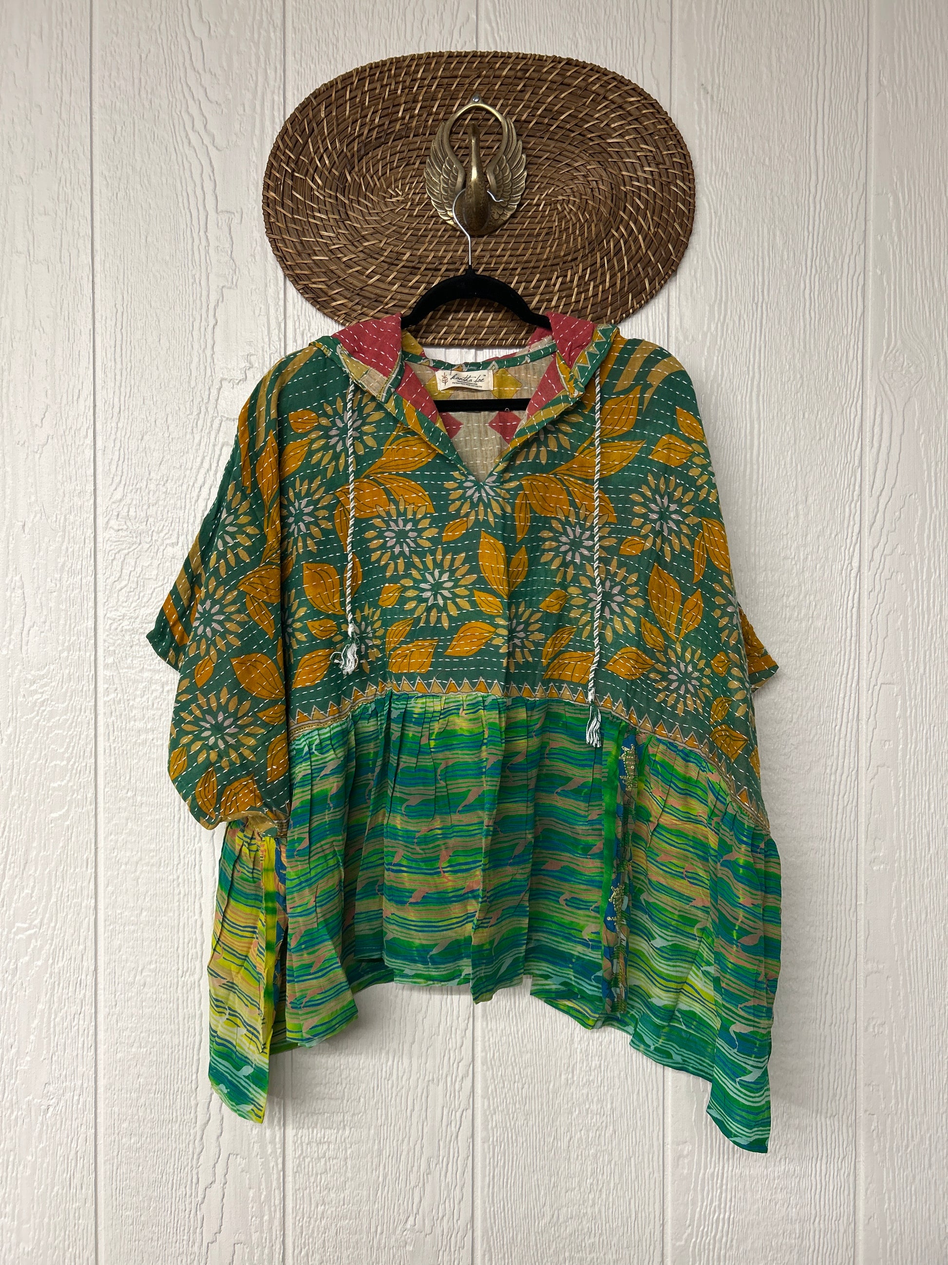 Your favorite throw on and go piece is made out of our vintage kantha embroidered sari with a crepe sari flounce. This poncho like silhouette is a flowy floaty dream.