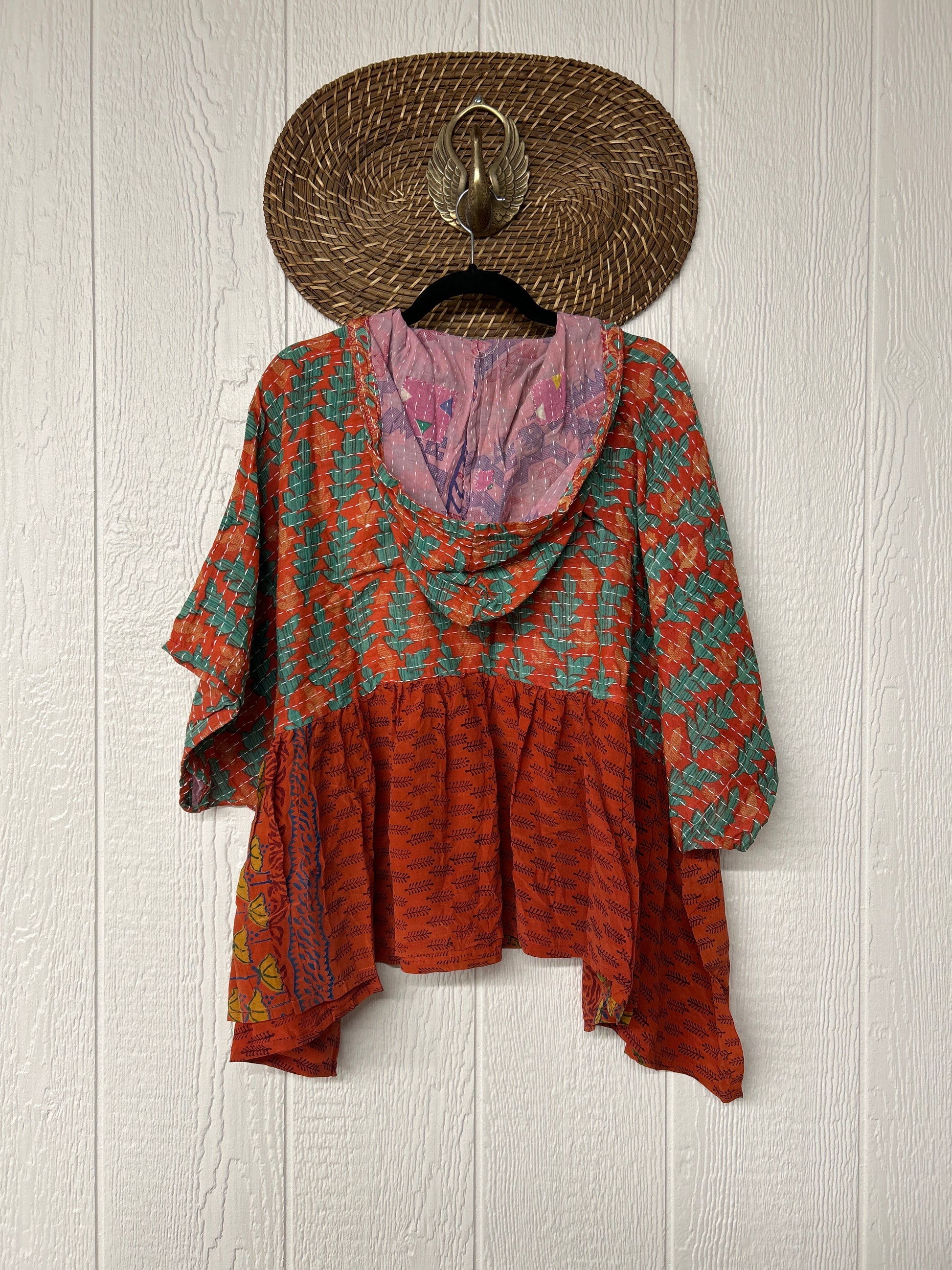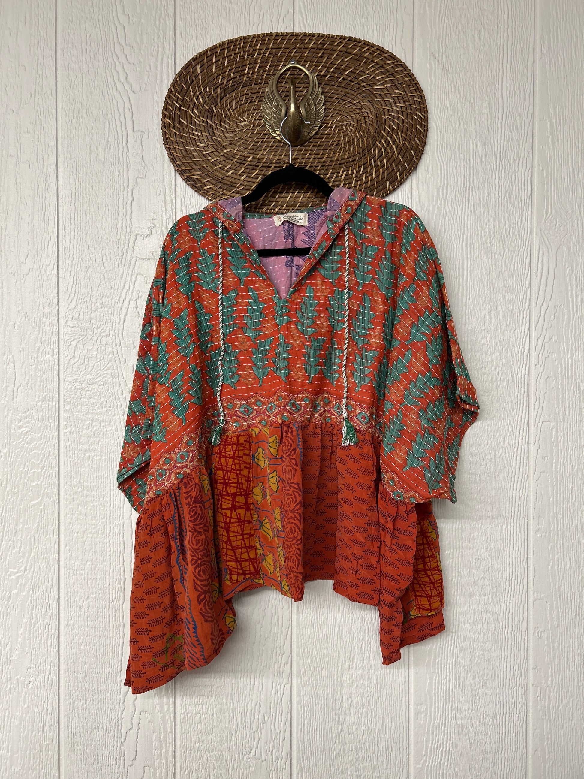 Your favorite throw on and go piece is made out of our vintage kantha embroidered sari with a crepe sari flounce. This poncho like silhouette is a flowy floaty dream.
