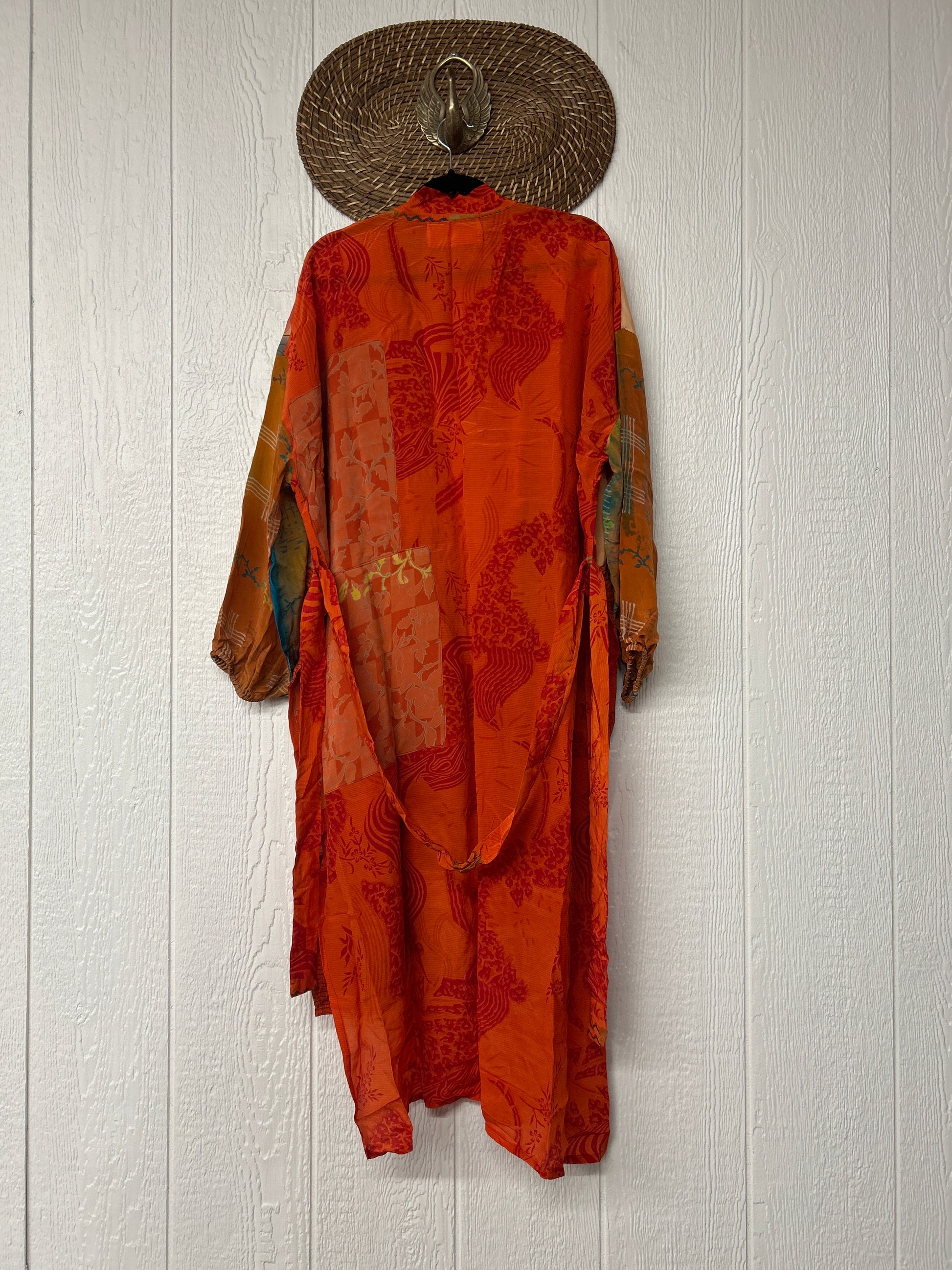 Crepe Dusters are beautiful, flowy, midi-length kimonos made from our ultra lux vintage crepe sari. They feature balloon sleeves with elastic at the wrist, 2 slouchy pockets, and a sash. They are one of our favorite layering pieces EVER.