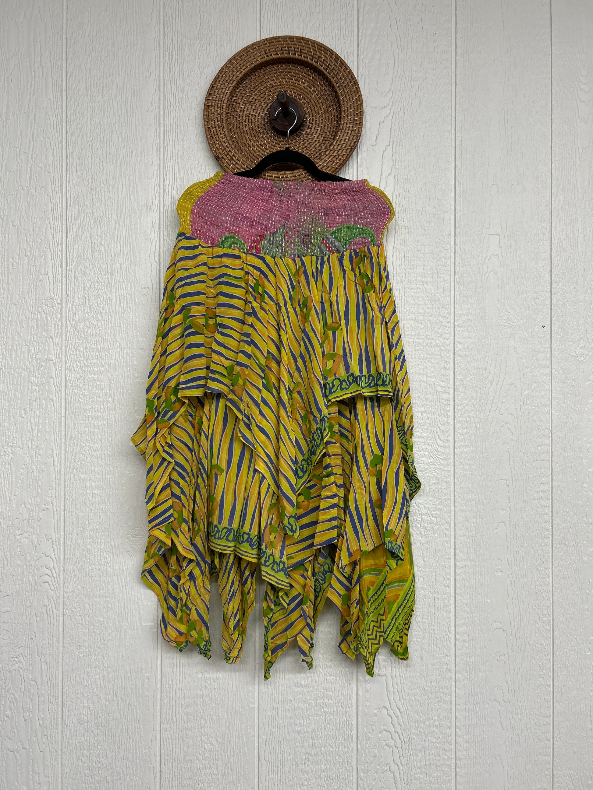 crafted from our ultra lux vintage crepe sari. Features a rock star asymmetrical hem and stretchy waistband. This versatile piece can be pulled up to be worn as a tunic!