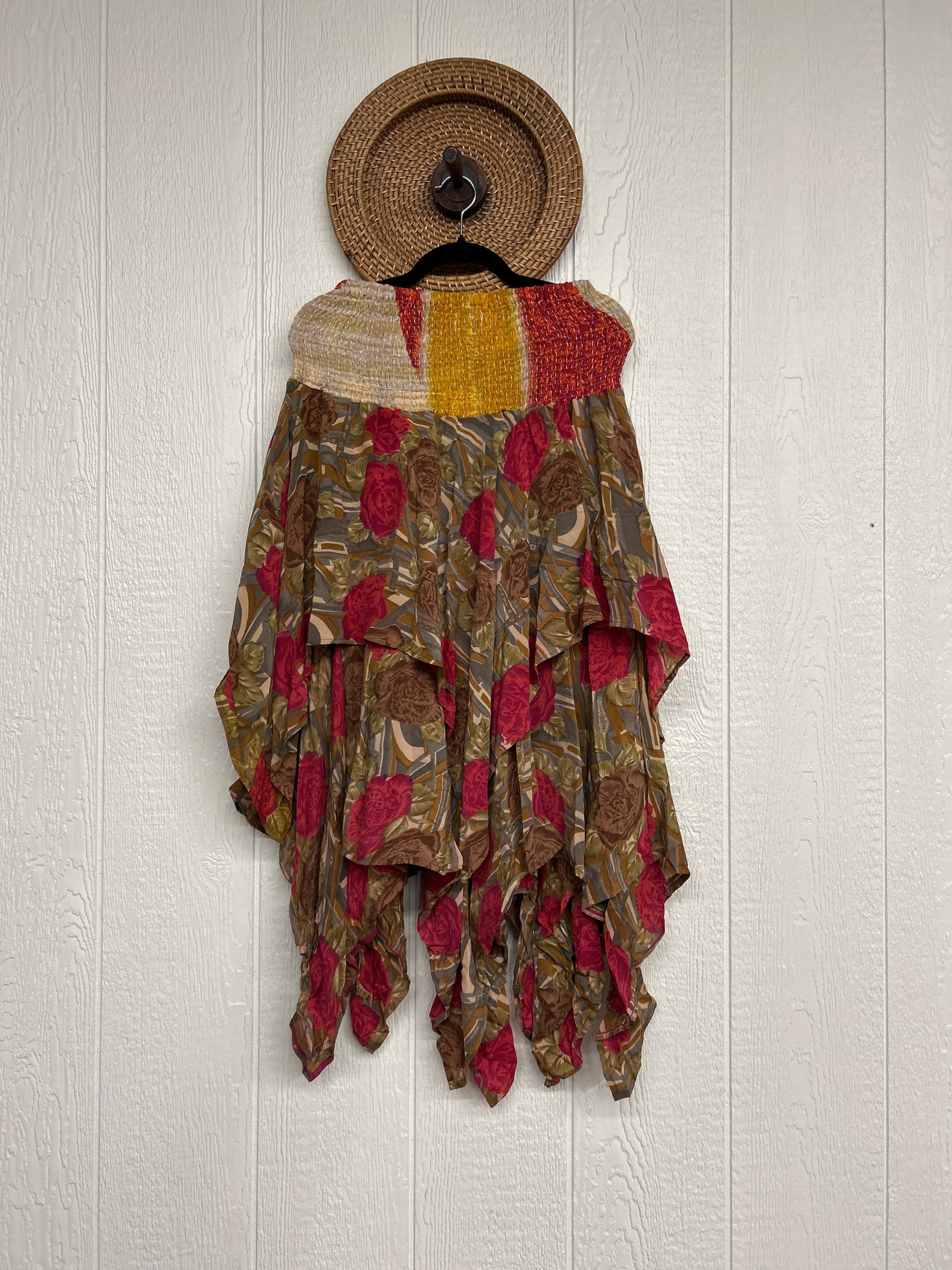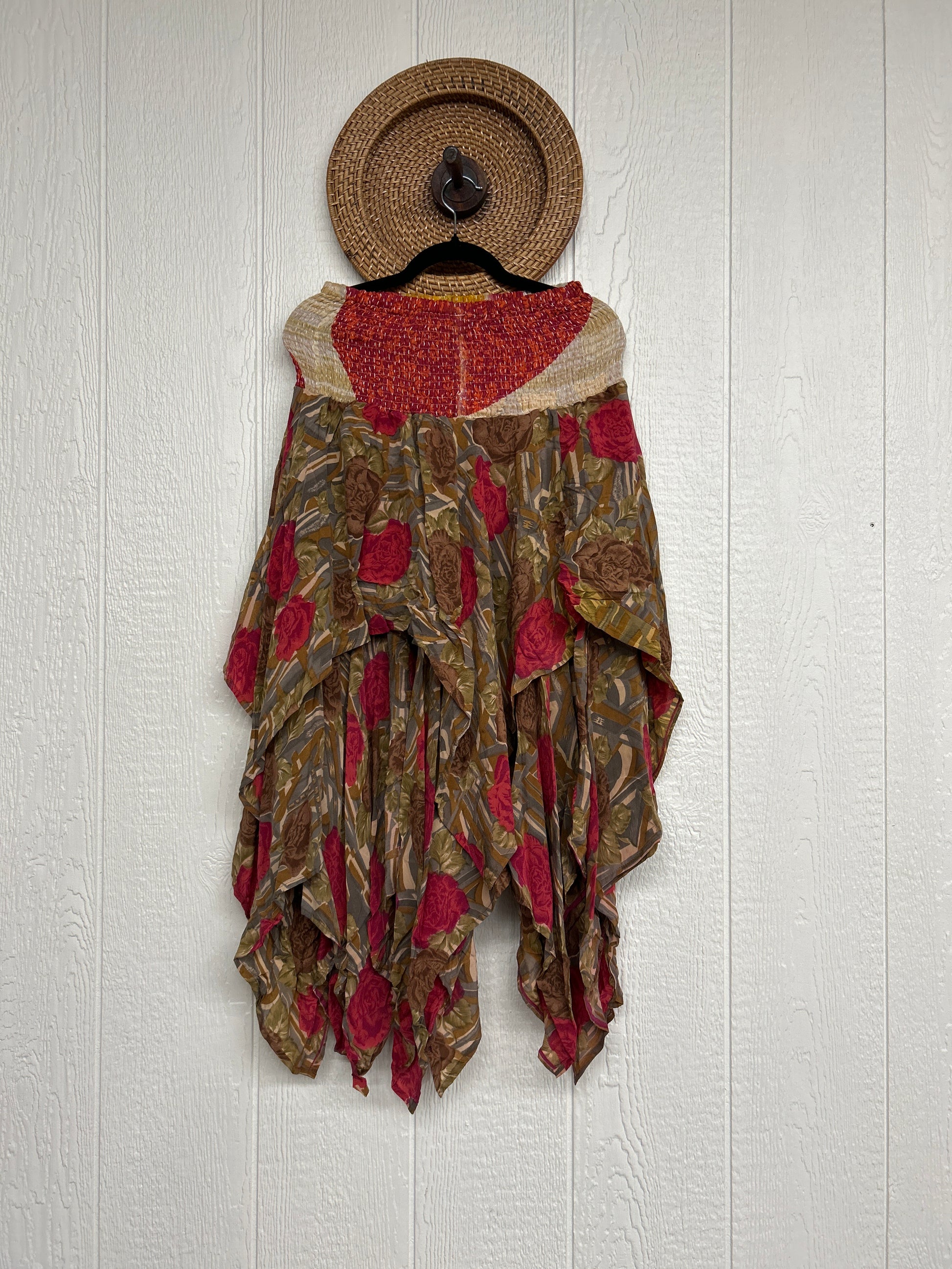 crafted from our ultra lux vintage crepe sari. Features a rock star asymmetrical hem and stretchy waistband. This versatile piece can be pulled up to be worn as a tunic!