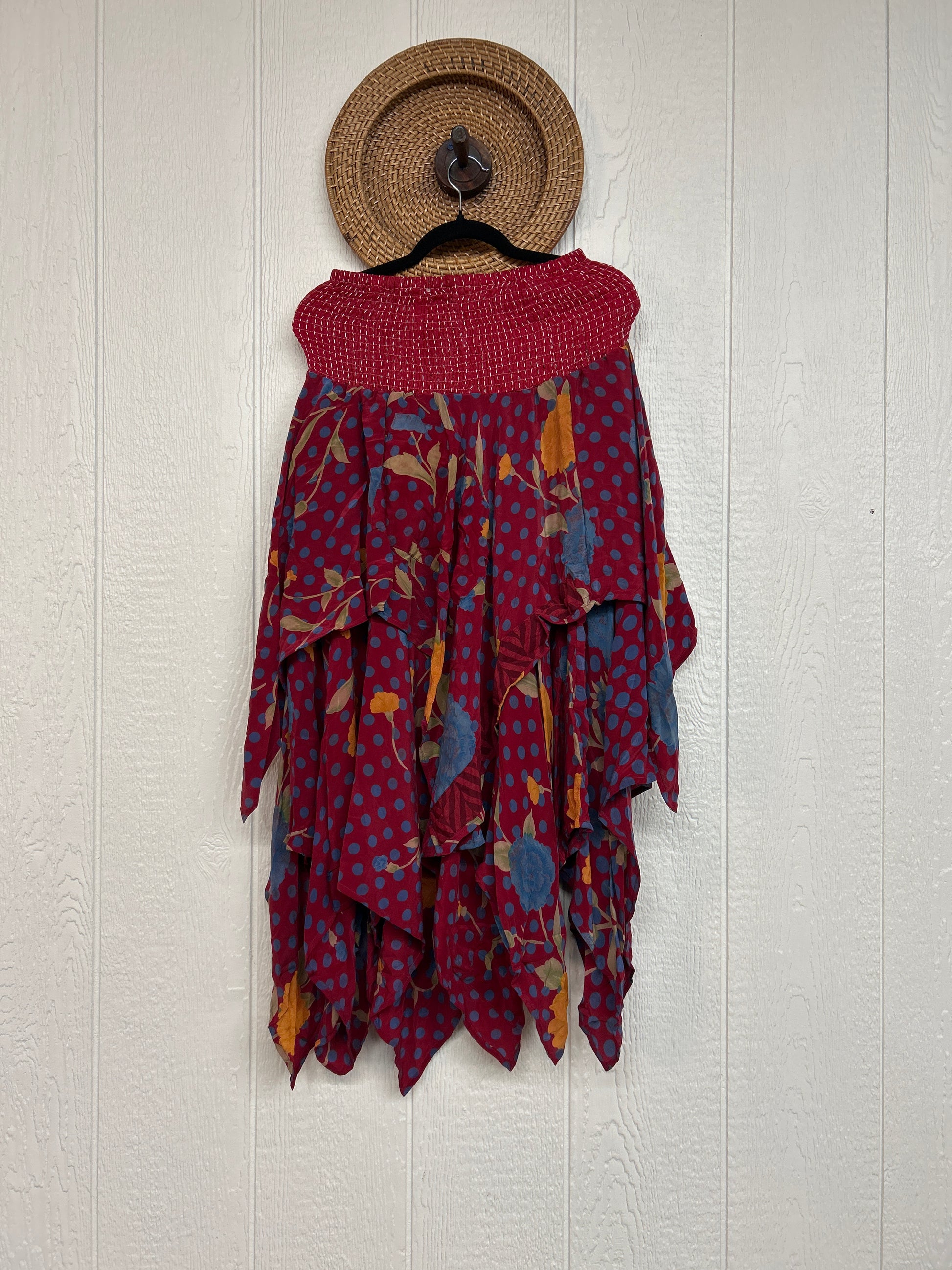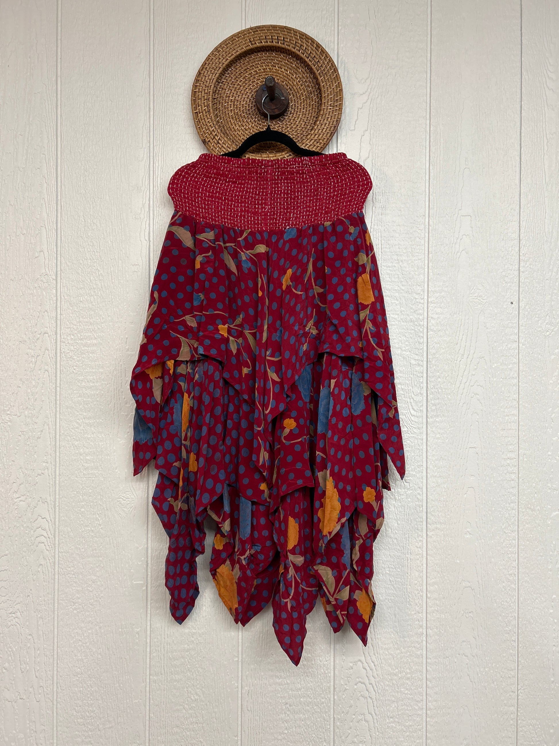 crafted from our ultra lux vintage crepe sari. Features a rock star asymmetrical hem and stretchy waistband. This versatile piece can be pulled up to be worn as a tunic!