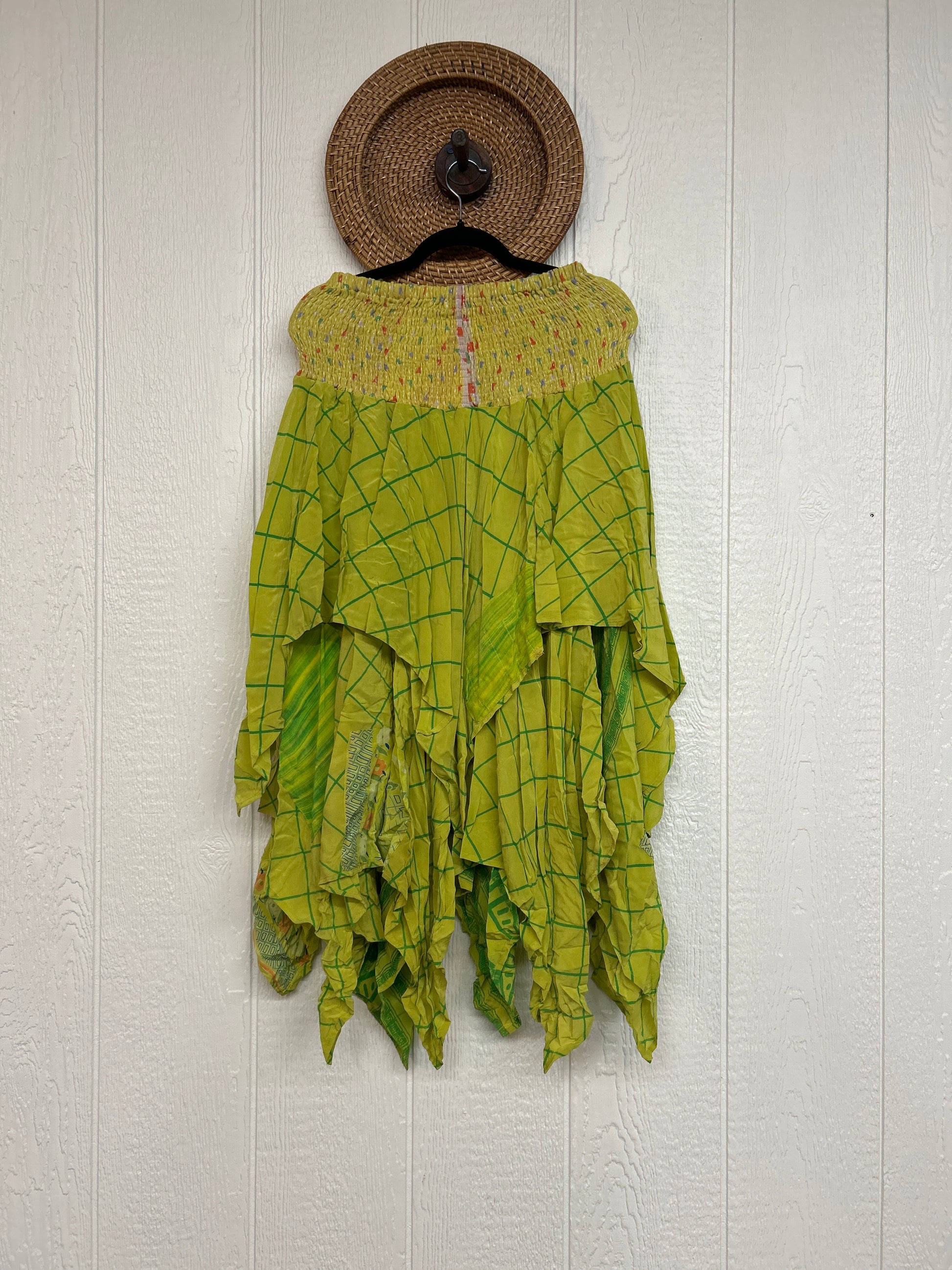 crafted from our ultra lux vintage crepe sari. Features a rock star asymmetrical hem and stretchy waistband. This versatile piece can be pulled up to be worn as a tunic!