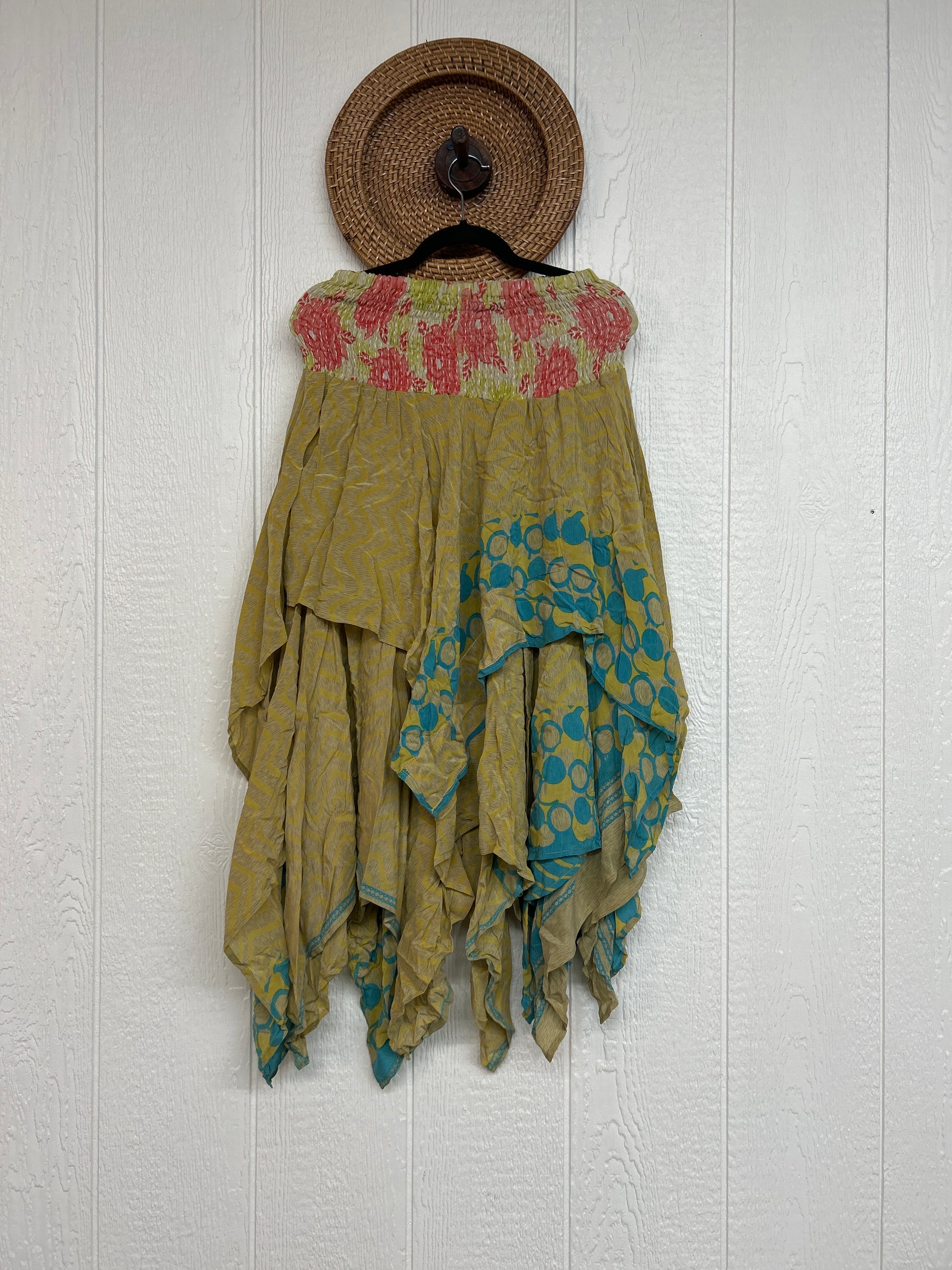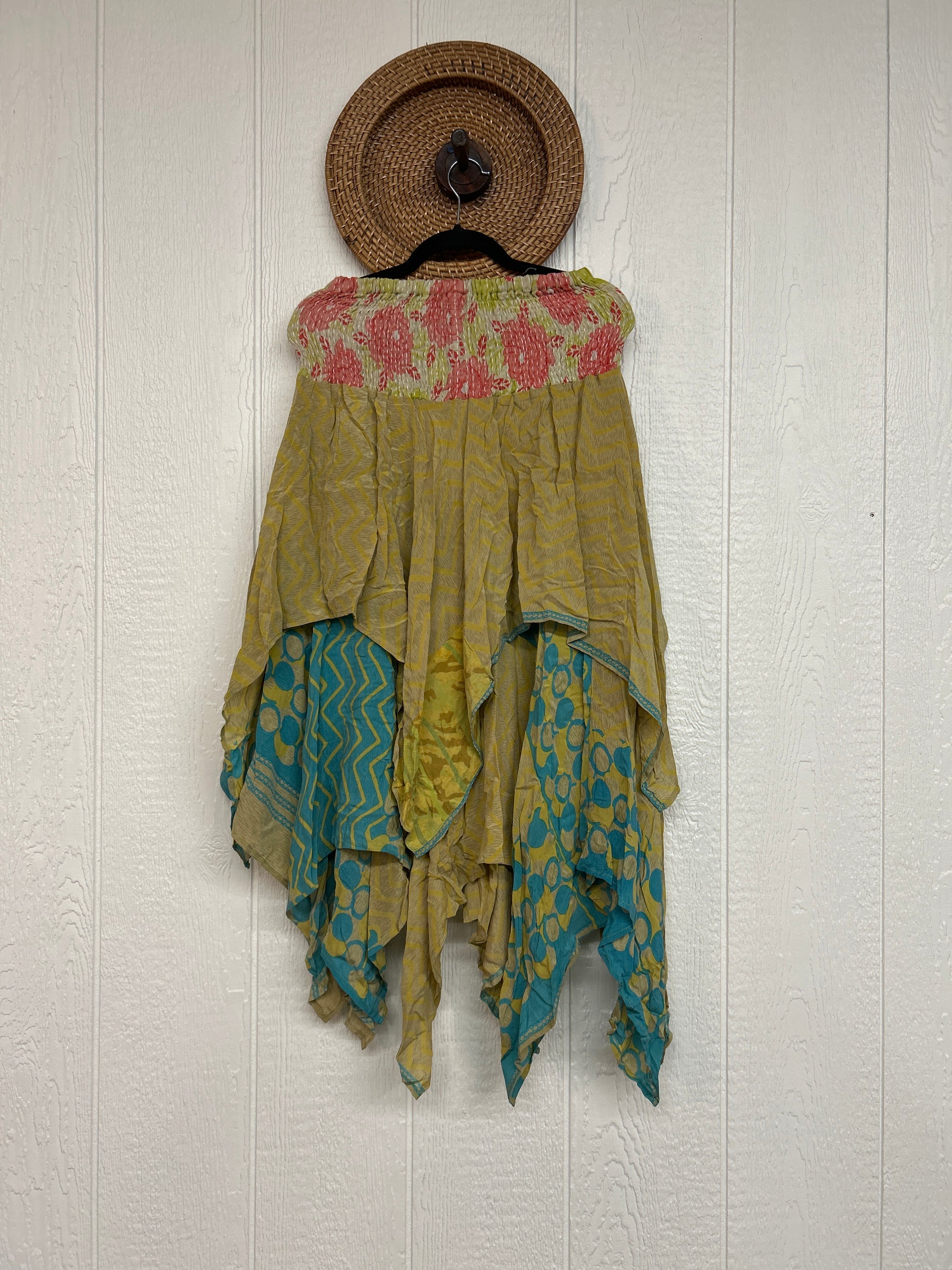 crafted from our ultra lux vintage crepe sari. Features a rock star asymmetrical hem and stretchy waistband. This versatile piece can be pulled up to be worn as a tunic!