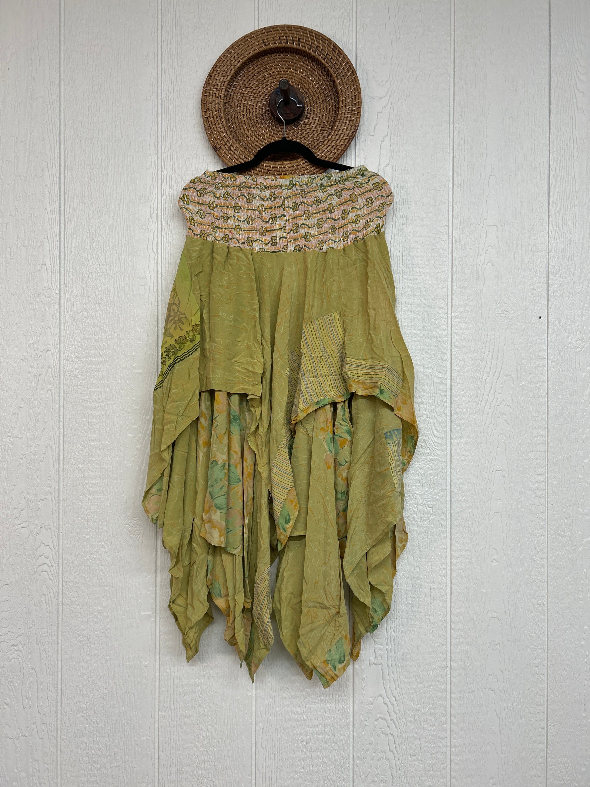 crafted from our ultra lux vintage crepe sari. Features a rock star asymmetrical hem and stretchy waistband. This versatile piece can be pulled up to be worn as a tunic!