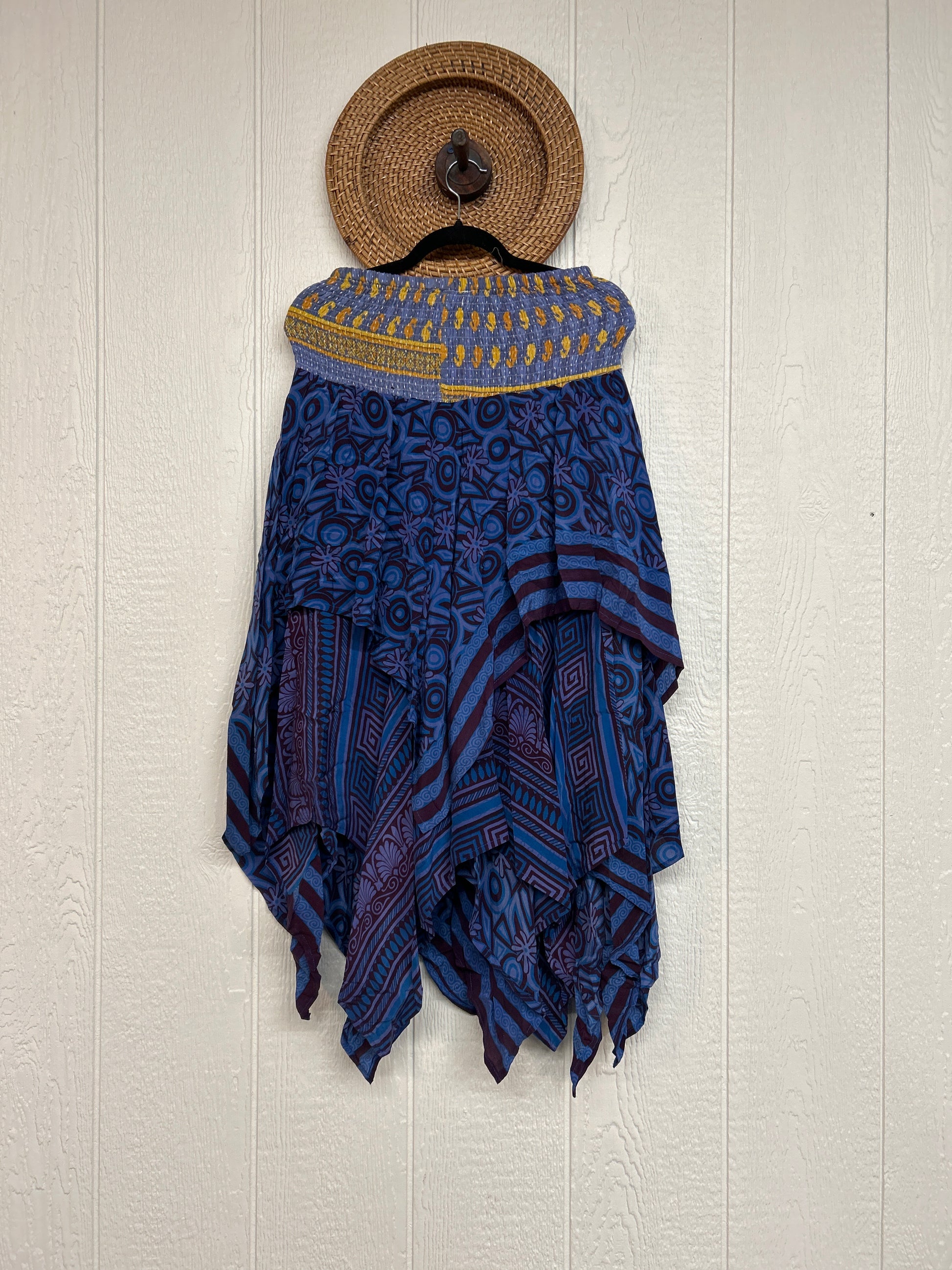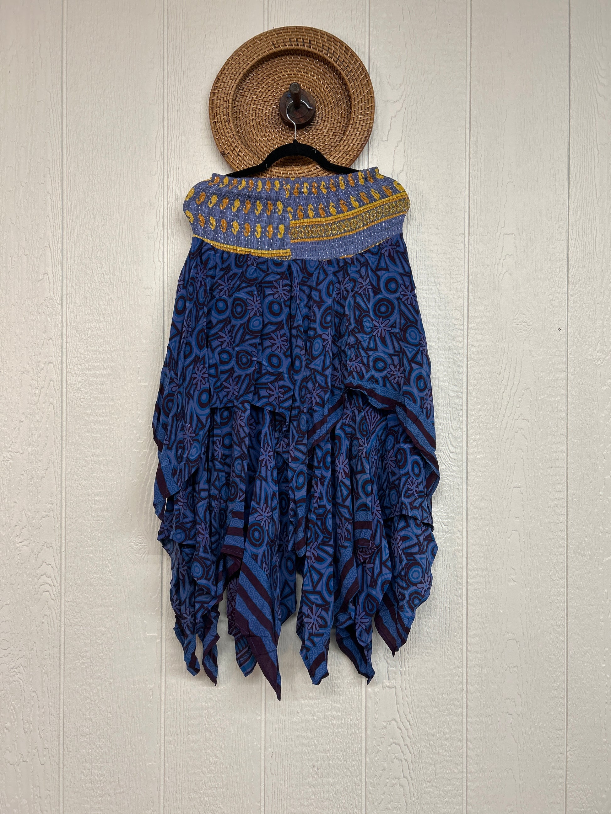 crafted from our ultra lux vintage crepe sari. Features a rock star asymmetrical hem and stretchy waistband. This versatile piece can be pulled up to be worn as a tunic!