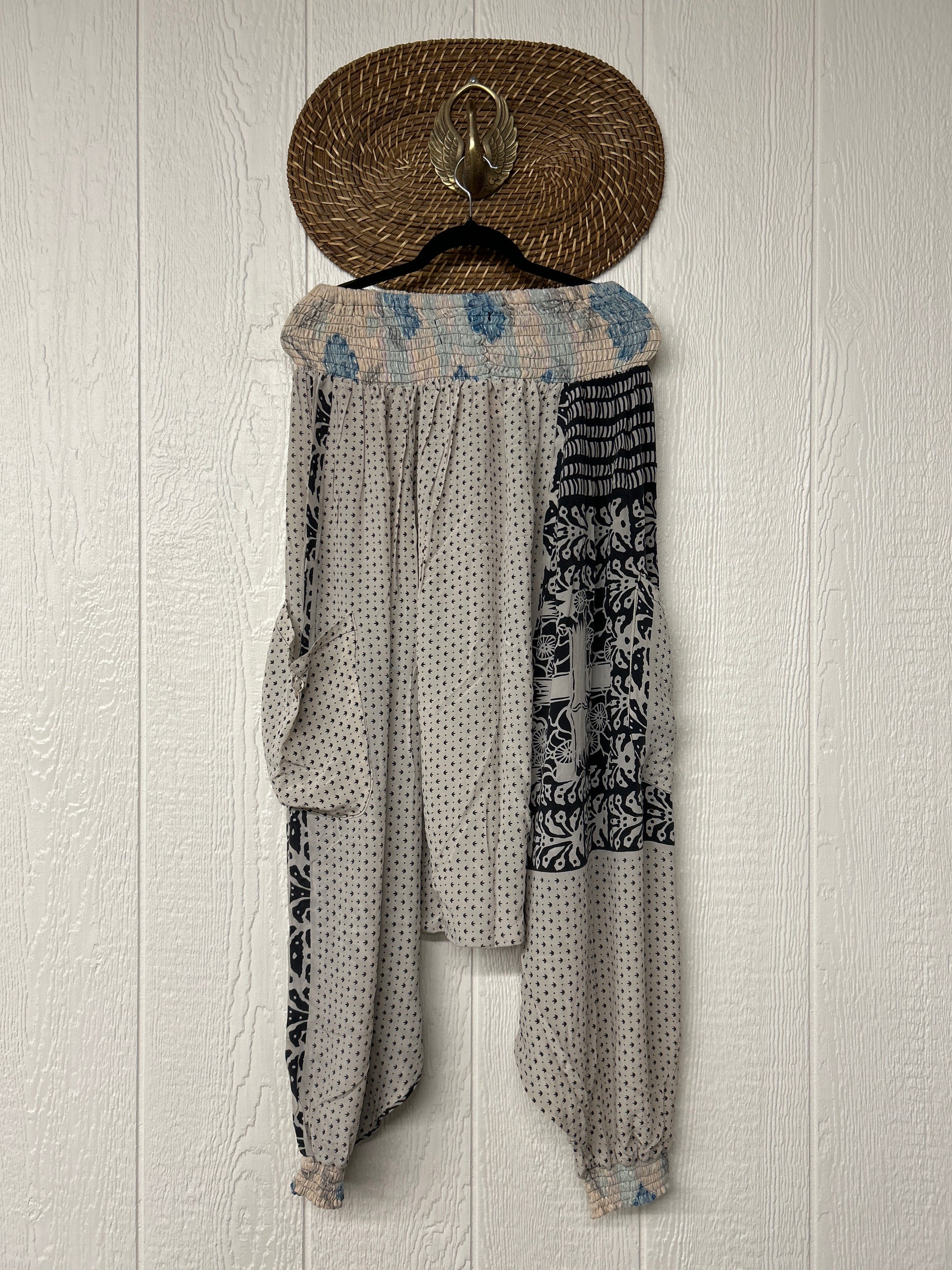 Made from vintage crepe sari, these are perfectly slouchy with a low harem drop for that effortless, flowy feel. Featuring deep side pockets, kantha stretch at the ankles, and a kantha smocked waistband that feels smooth and soft on the skin.