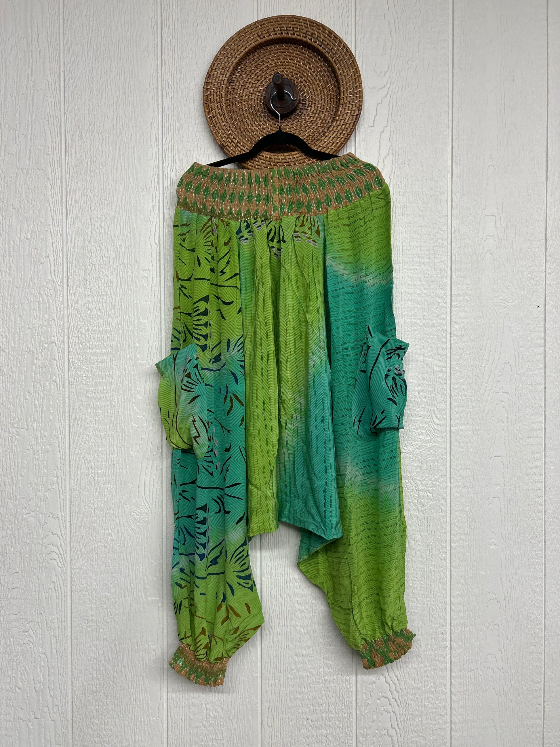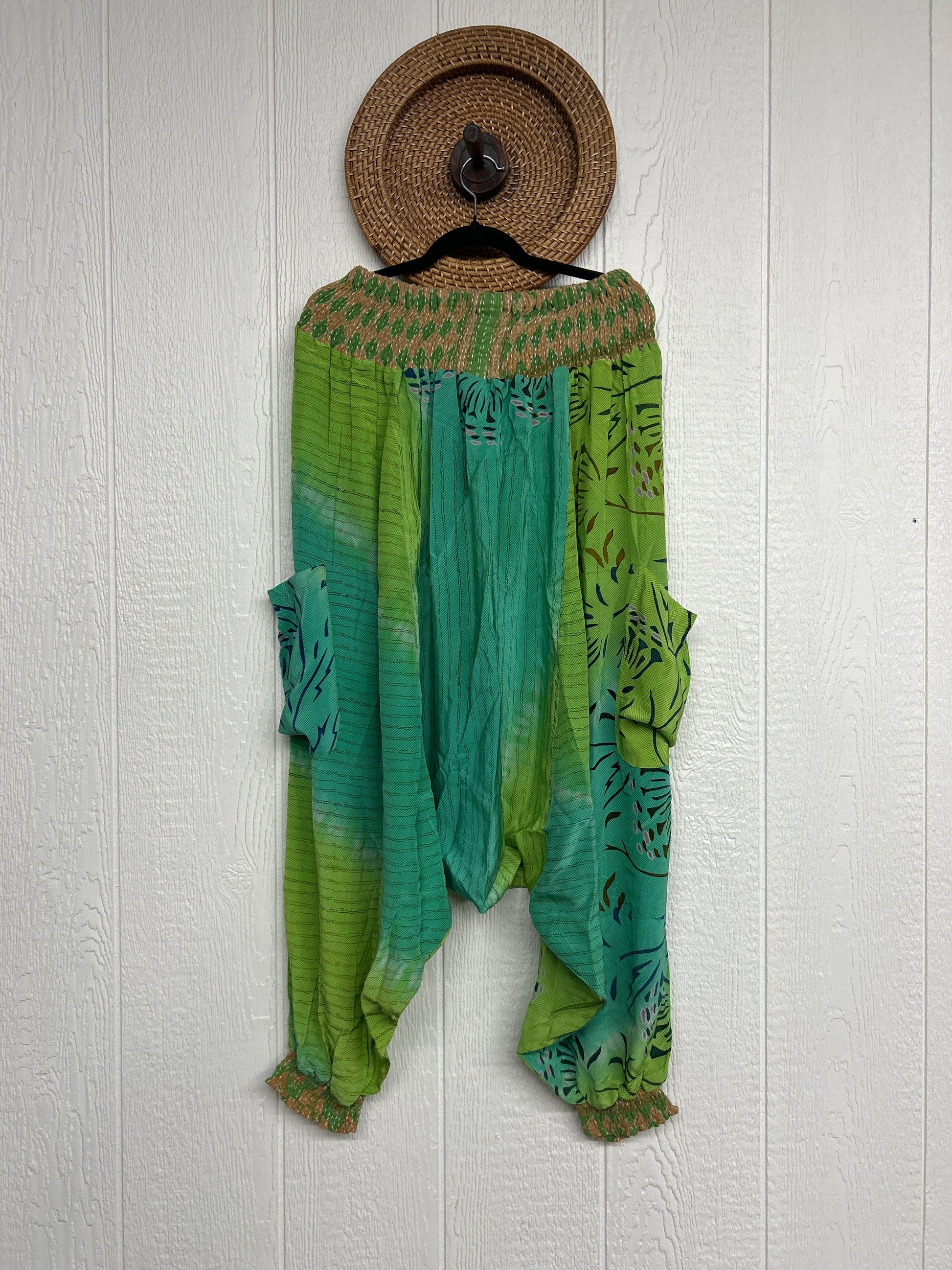 Made from vintage crepe sari, these are perfectly slouchy with a low harem drop for that effortless, flowy feel. Featuring deep side pockets, kantha stretch at the ankles, and a kantha smocked waistband that feels smooth and soft on the skin.