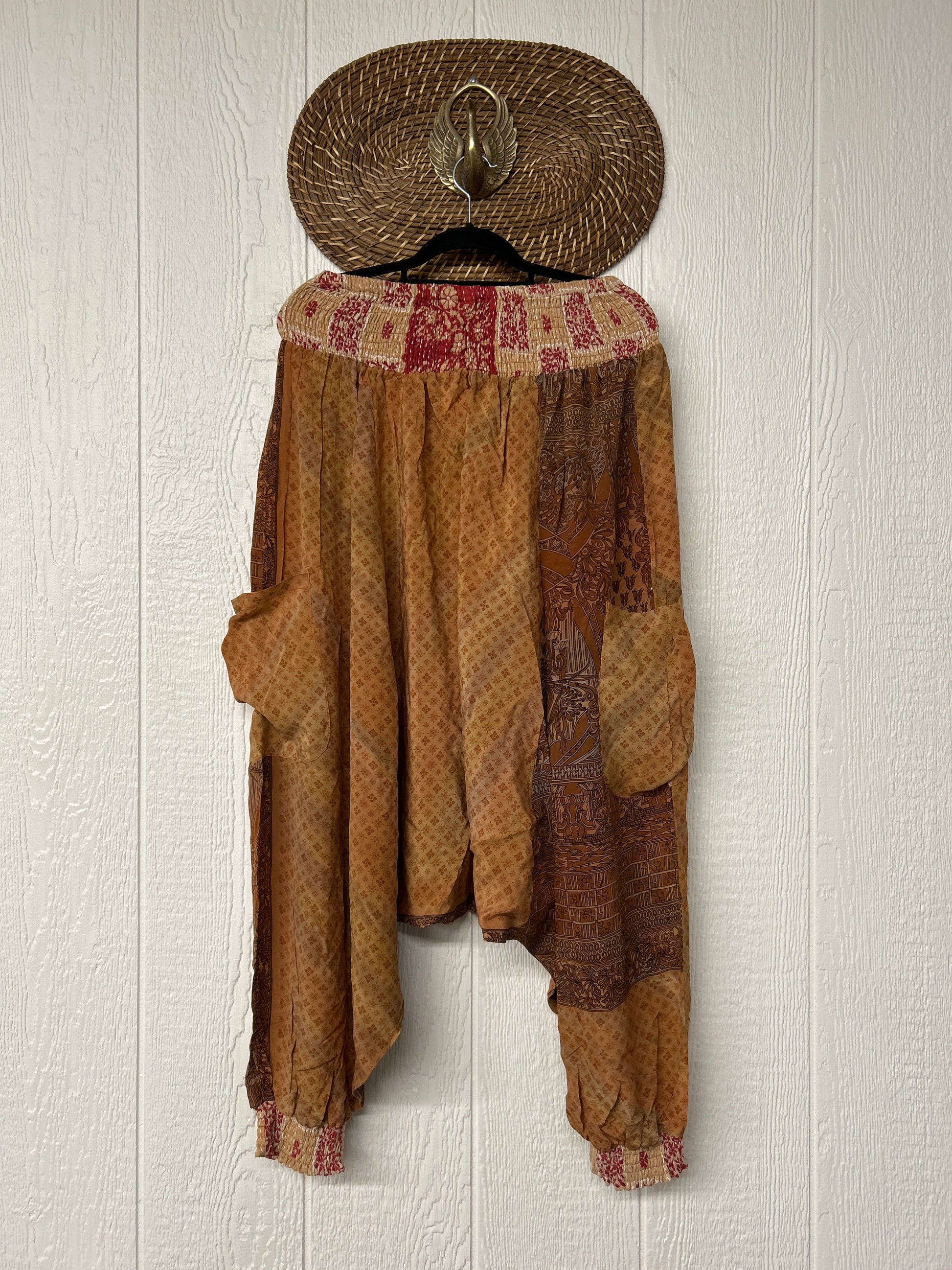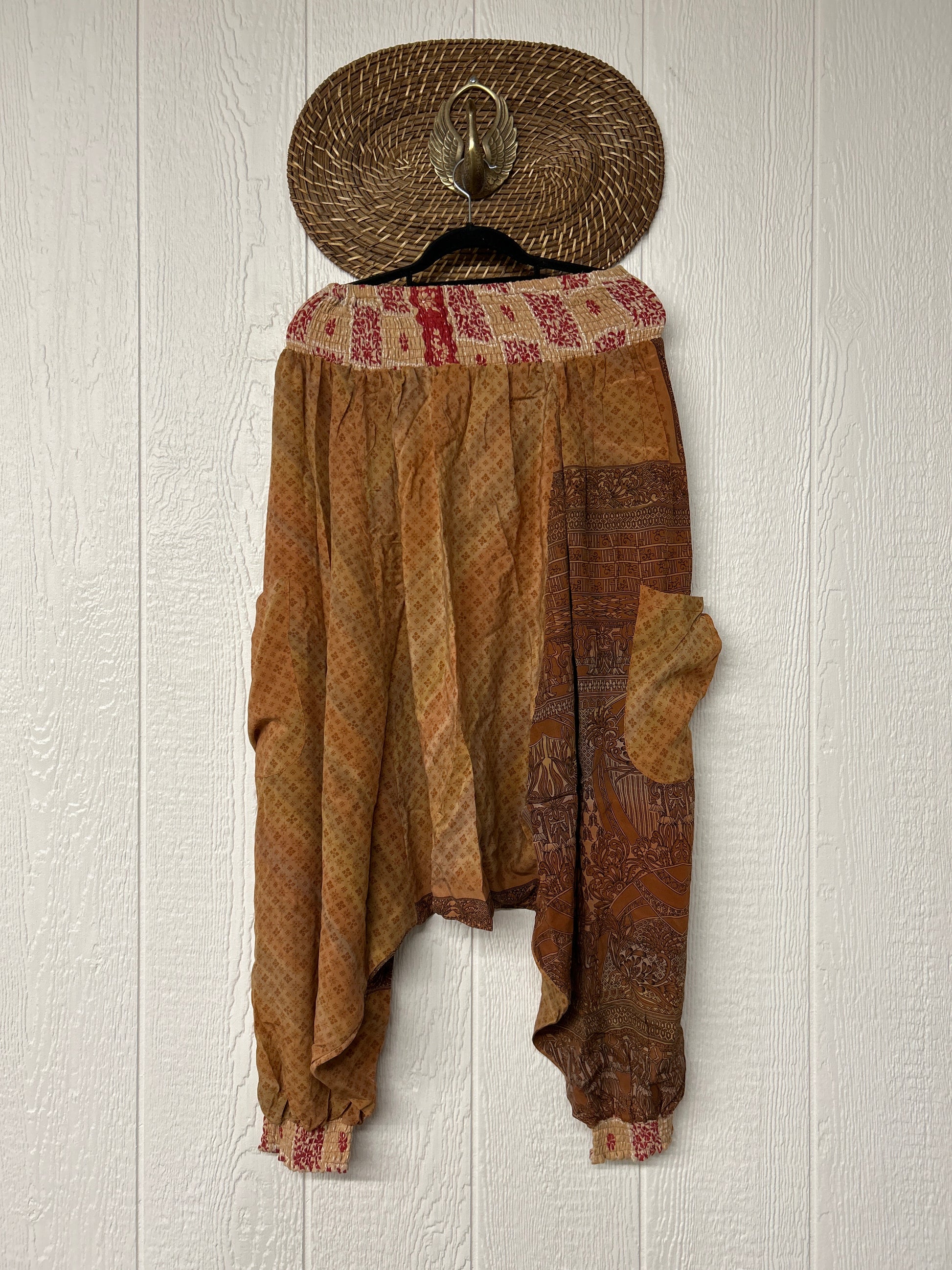 Made from vintage crepe sari, these are perfectly slouchy with a low harem drop for that effortless, flowy feel. Featuring deep side pockets, kantha stretch at the ankles, and a kantha smocked waistband that feels smooth and soft on the skin.
