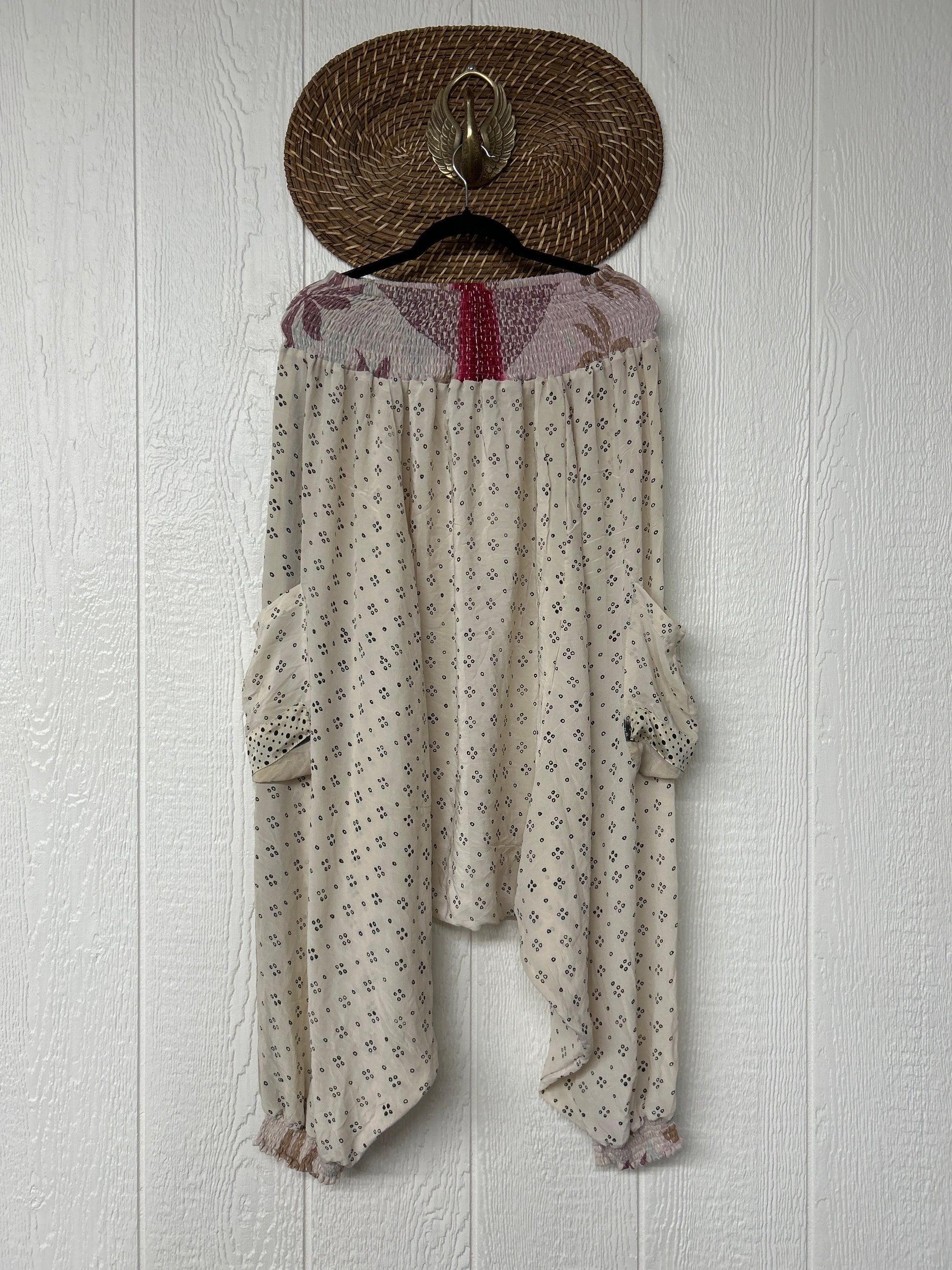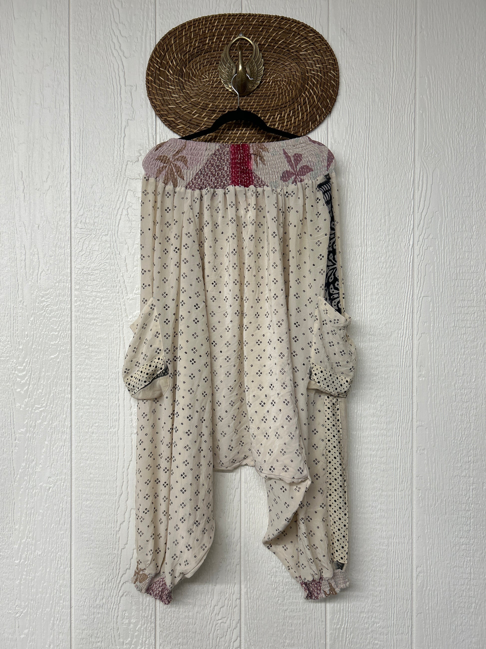 Made from vintage crepe sari, these are perfectly slouchy with a low harem drop for that effortless, flowy feel. Featuring deep side pockets, kantha stretch at the ankles, and a kantha smocked waistband that feels smooth and soft on the skin.