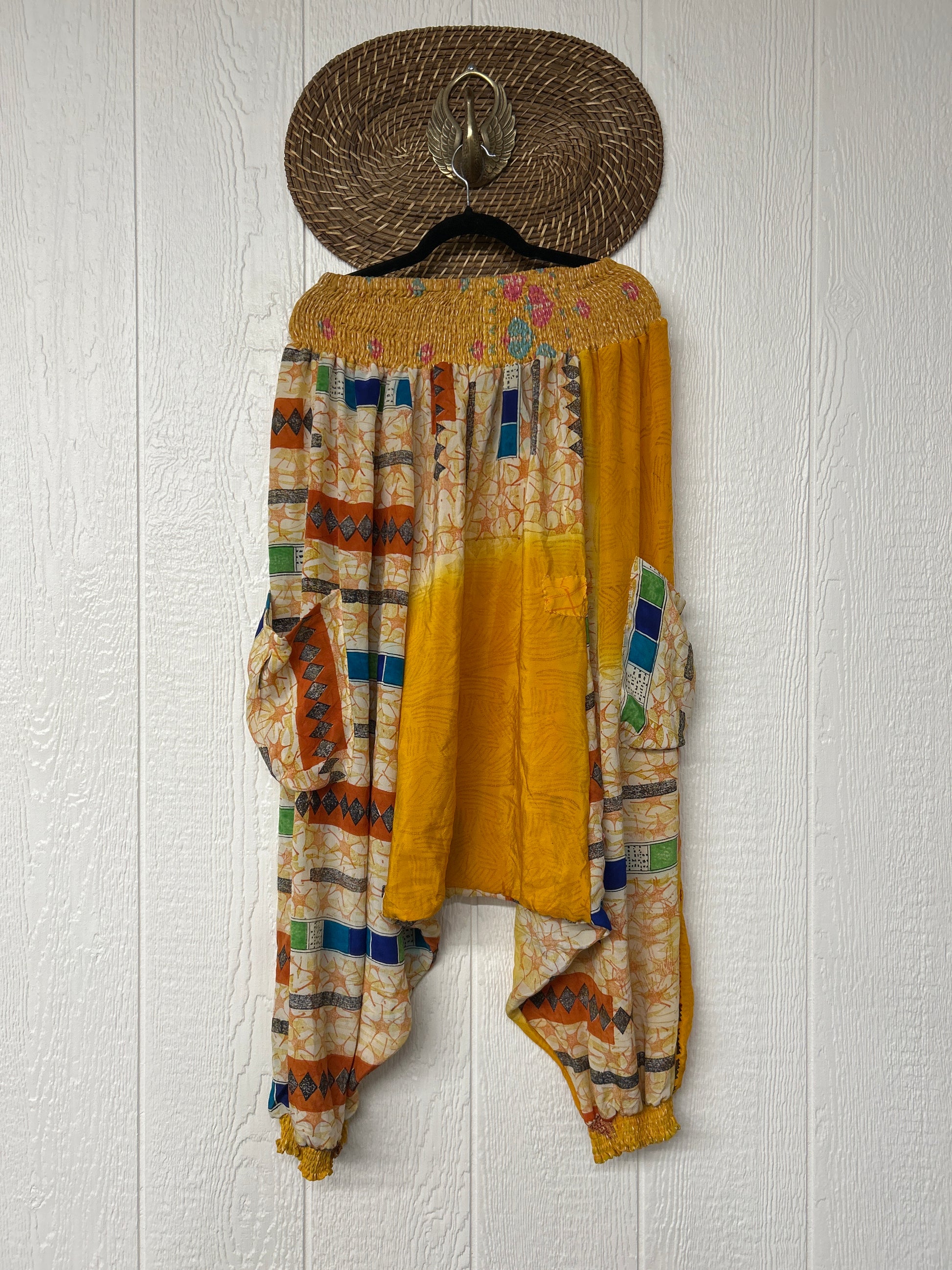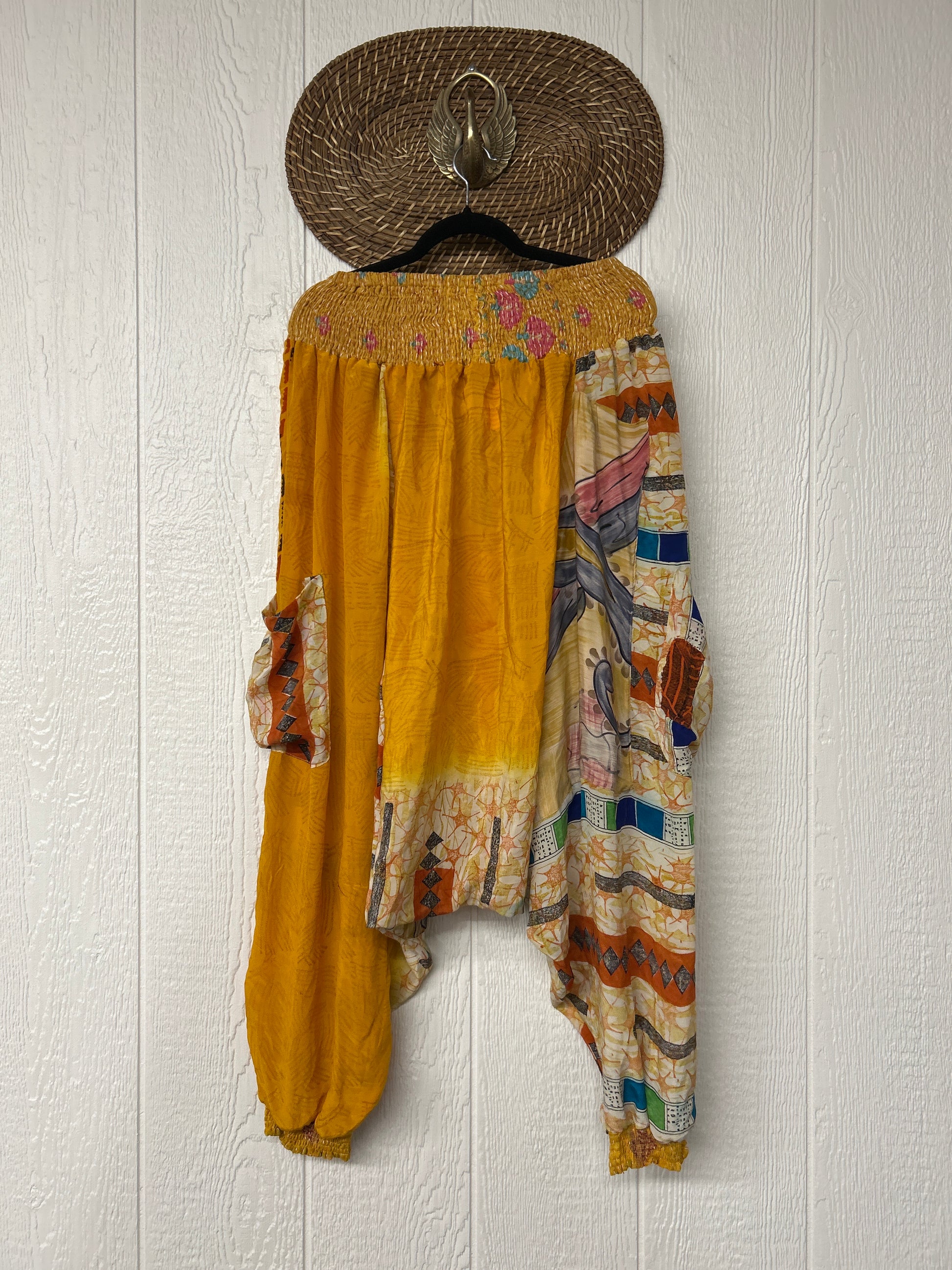 Made from vintage crepe sari, these are perfectly slouchy with a low harem drop for that effortless, flowy feel. Featuring deep side pockets, kantha stretch at the ankles, and a kantha smocked waistband that feels smooth and soft on the skin.