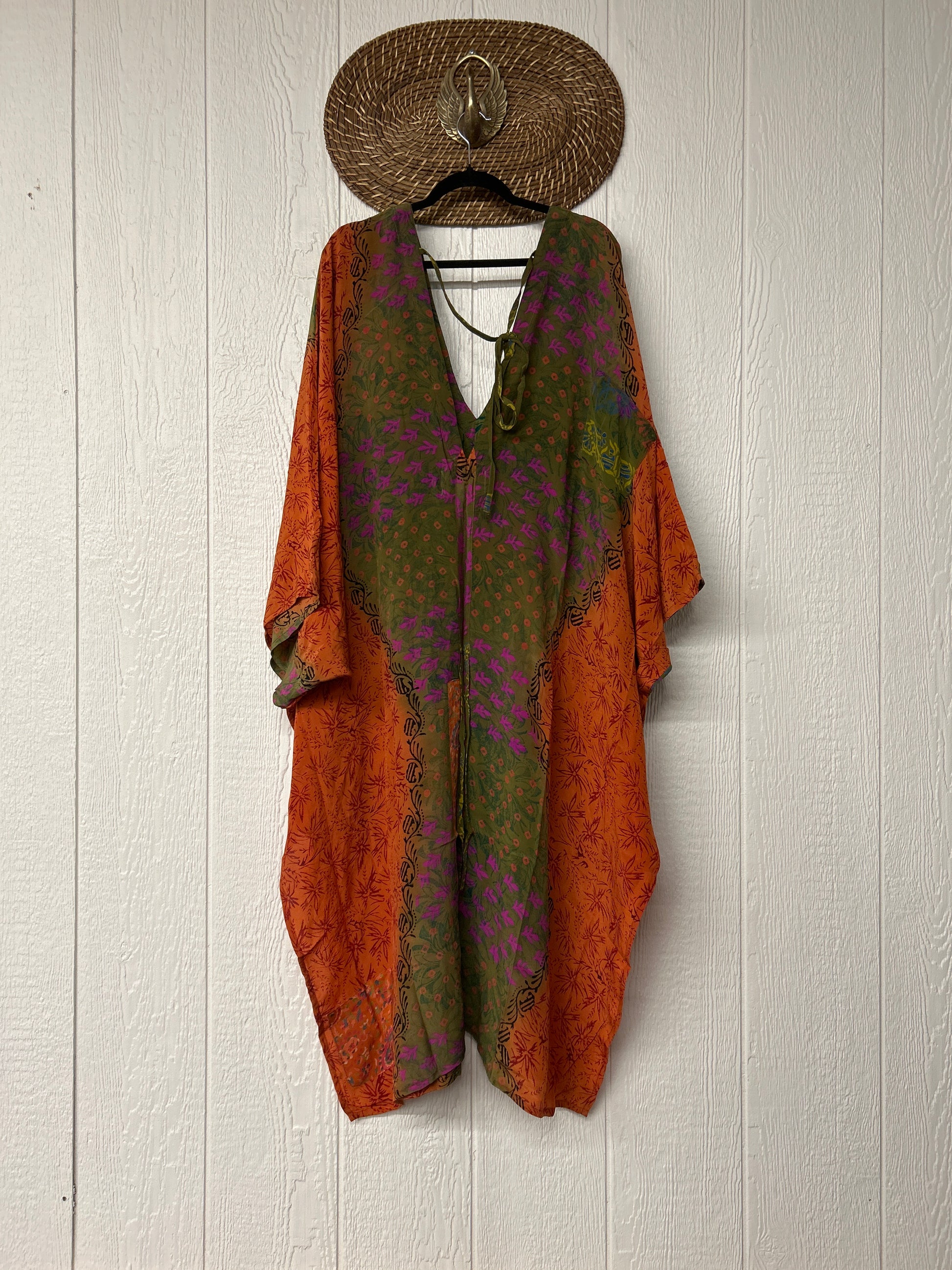 Fabrics may have small threads or holes in the layers. Color inconsistency or small stains may be present. The saris are sewn together and extend the life of each design. Imperfections should be celebrated.