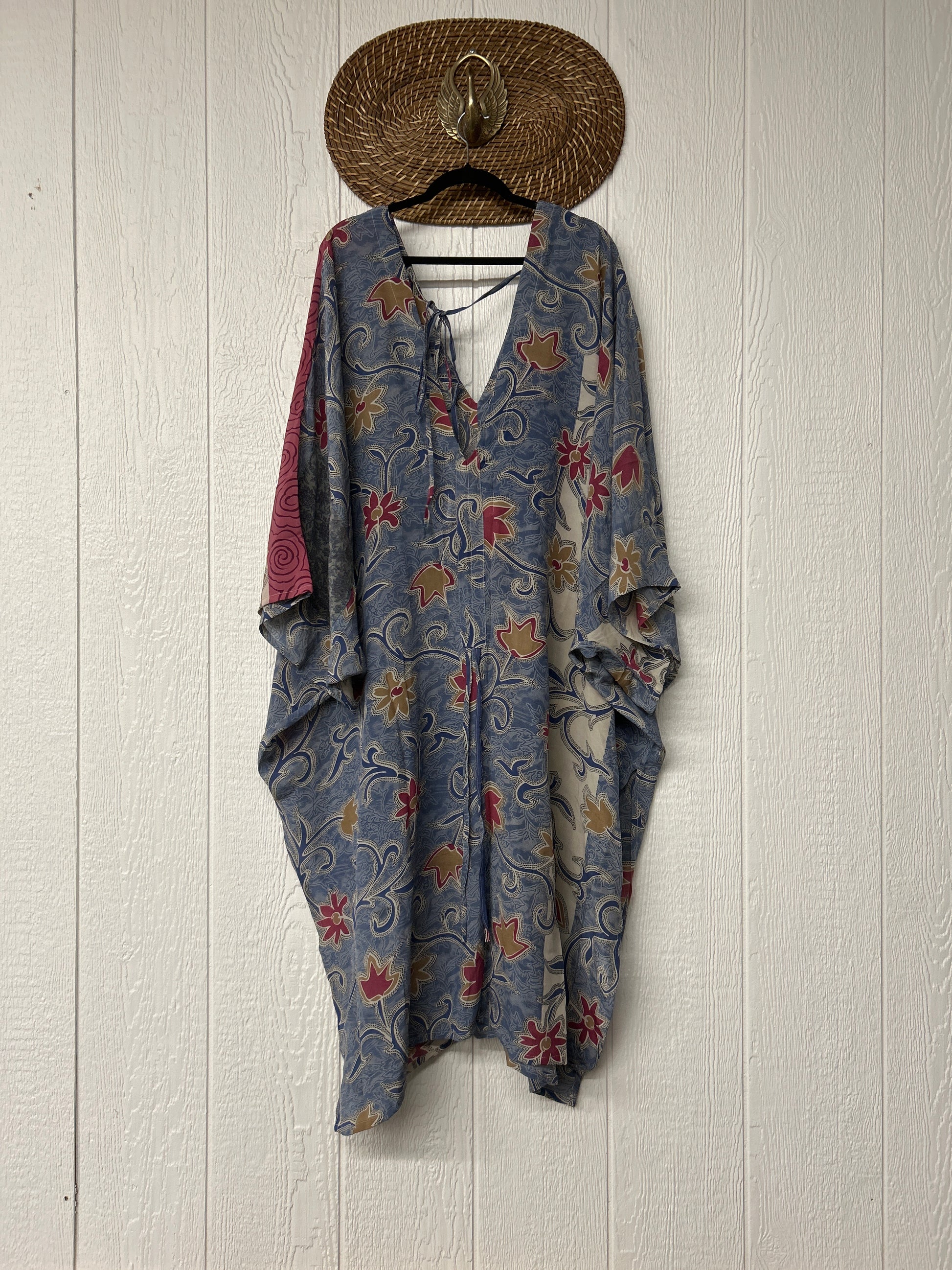 Fabrics may have small threads or holes in the layers. Color inconsistency or small stains may be present. The saris are sewn together and extend the life of each design. Imperfections should be celebrated.