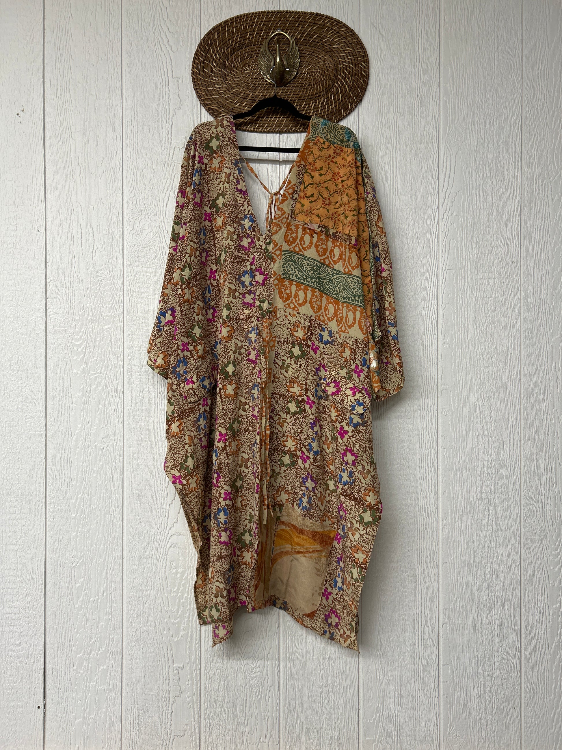Fabrics may have small threads or holes in the layers. Color inconsistency or small stains may be present. The saris are sewn together and extend the life of each design. Imperfections should be celebrated.