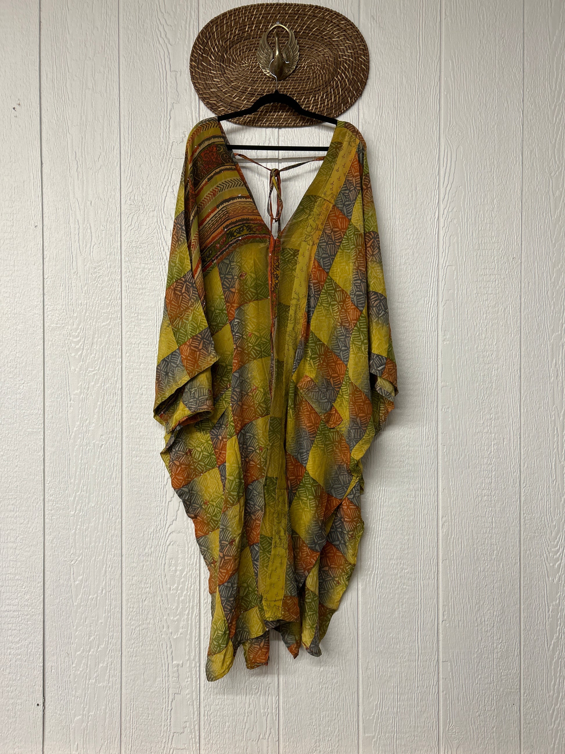Fabrics may have small threads or holes in the layers. Color inconsistency or small stains may be present. The saris are sewn together and extend the life of each design. Imperfections should be celebrated.