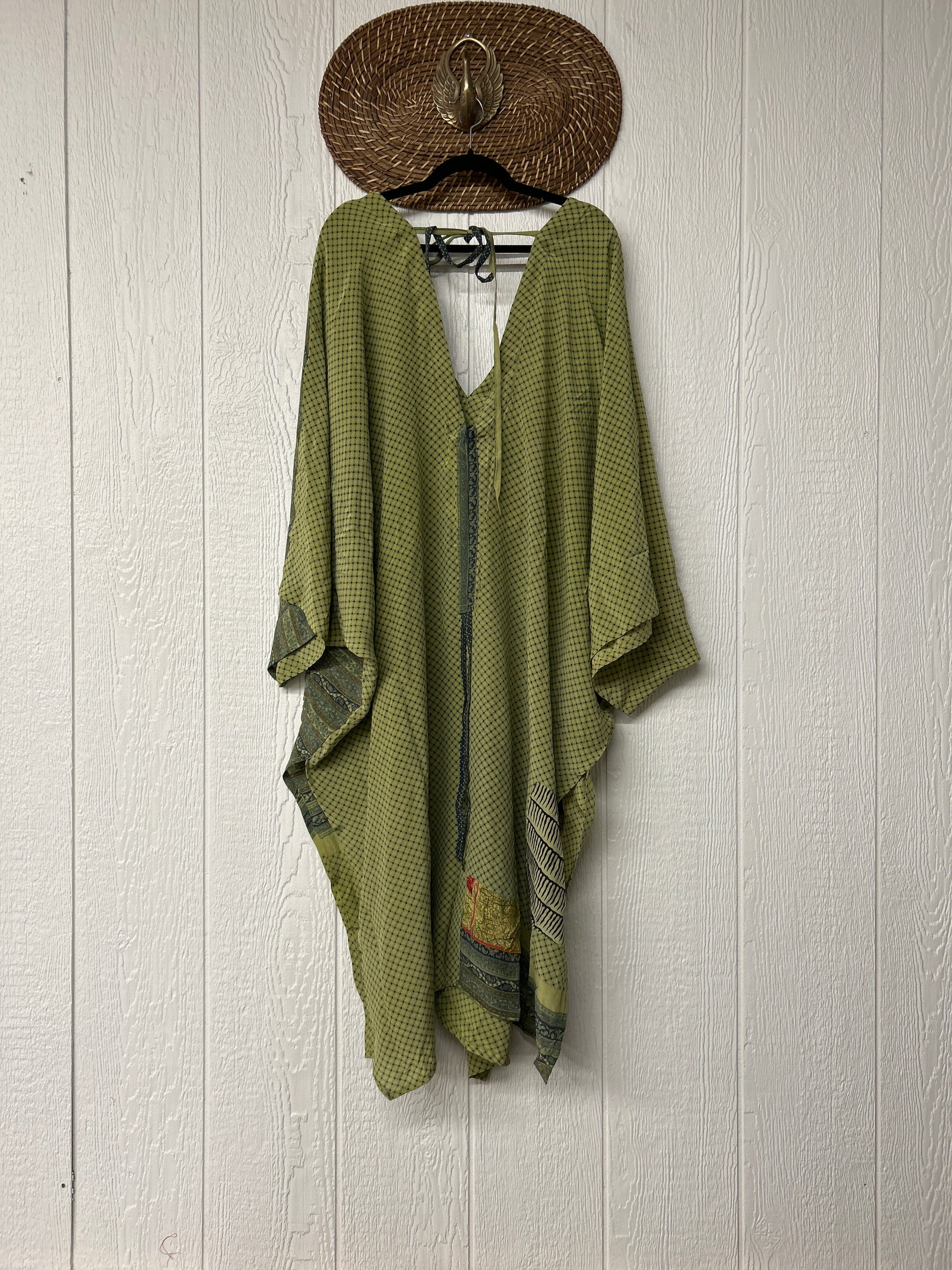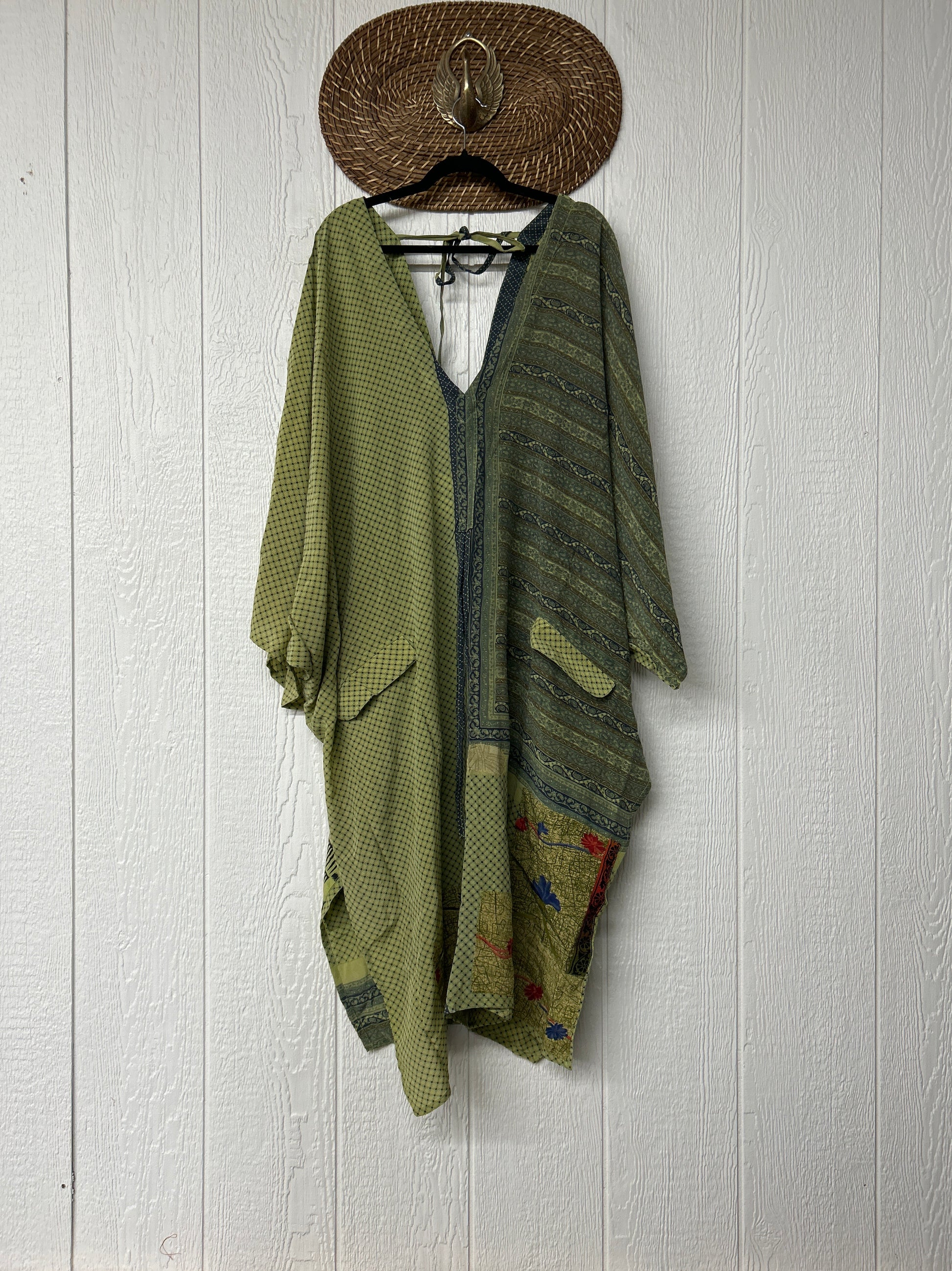 Fabrics may have small threads or holes in the layers. Color inconsistency or small stains may be present. The saris are sewn together and extend the life of each design. Imperfections should be celebrated.