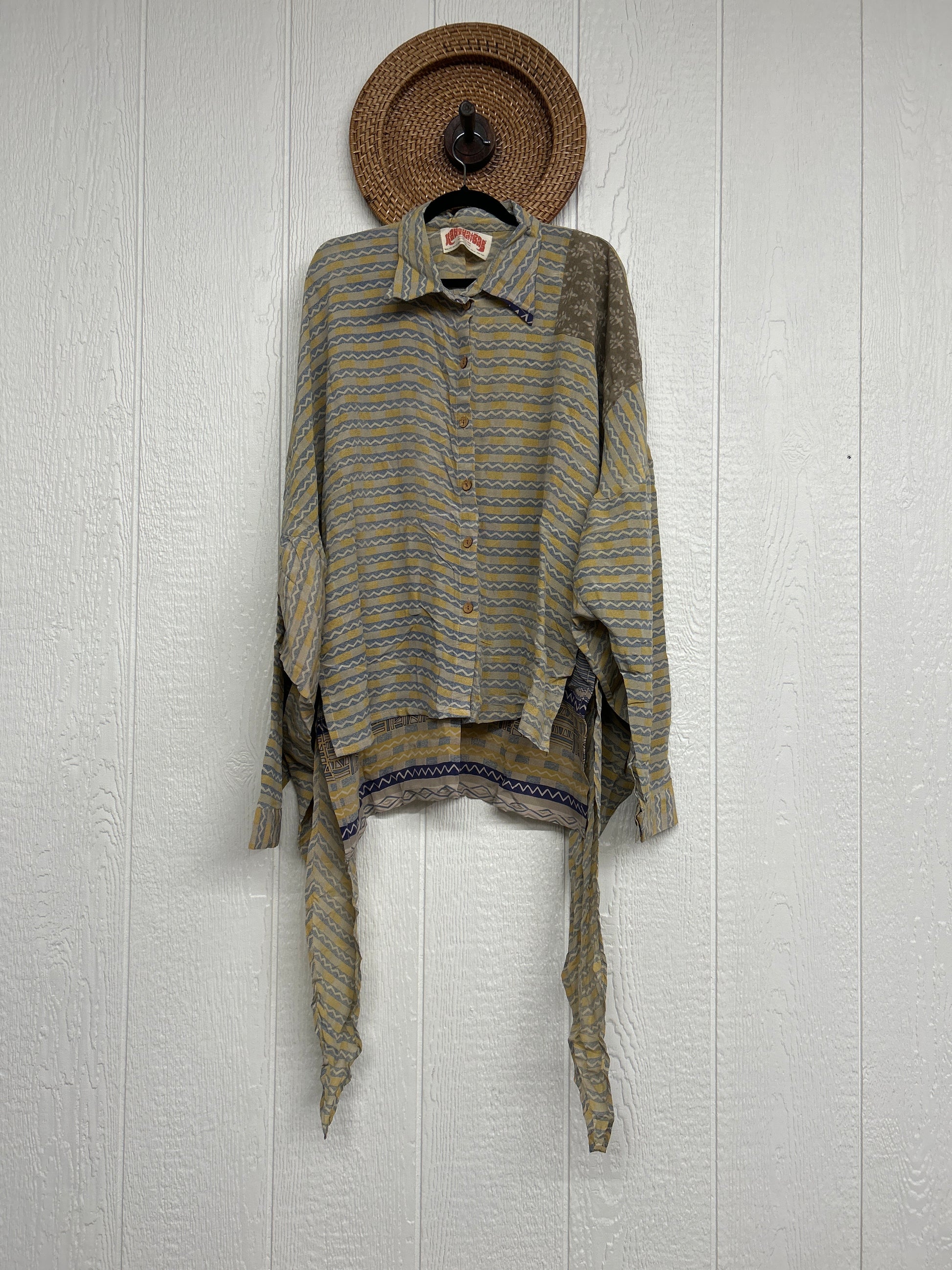 Crafted from our ultra lux vintage crepe sari this floaty dream features a Button-down placket with a high low hem, collar, and button cuffs.