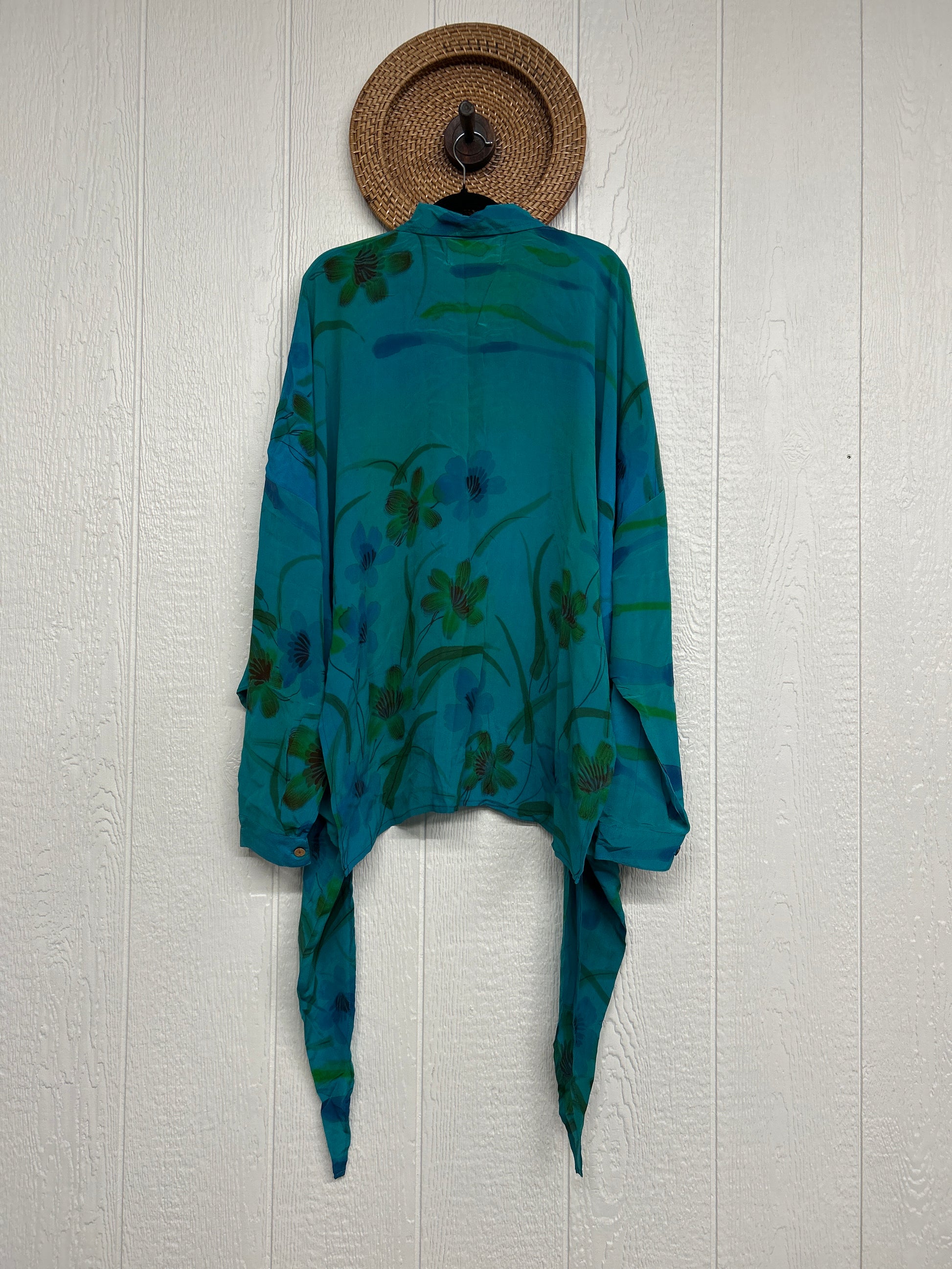 Crafted from our ultra lux vintage crepe sari this floaty dream features a Button-down placket with a high low hem, collar, and button cuffs.