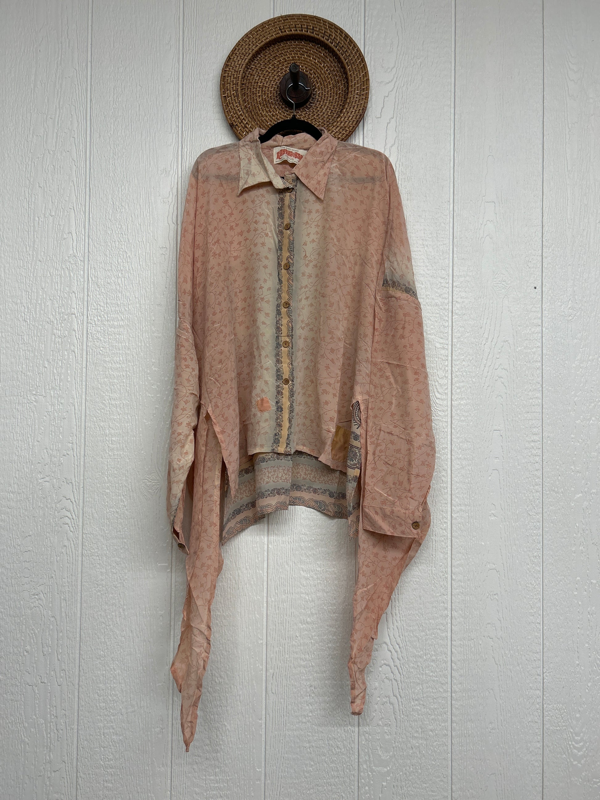 Crafted from our ultra lux vintage crepe sari this floaty dream features a Button-down placket with a high low hem, collar, and button cuffs.