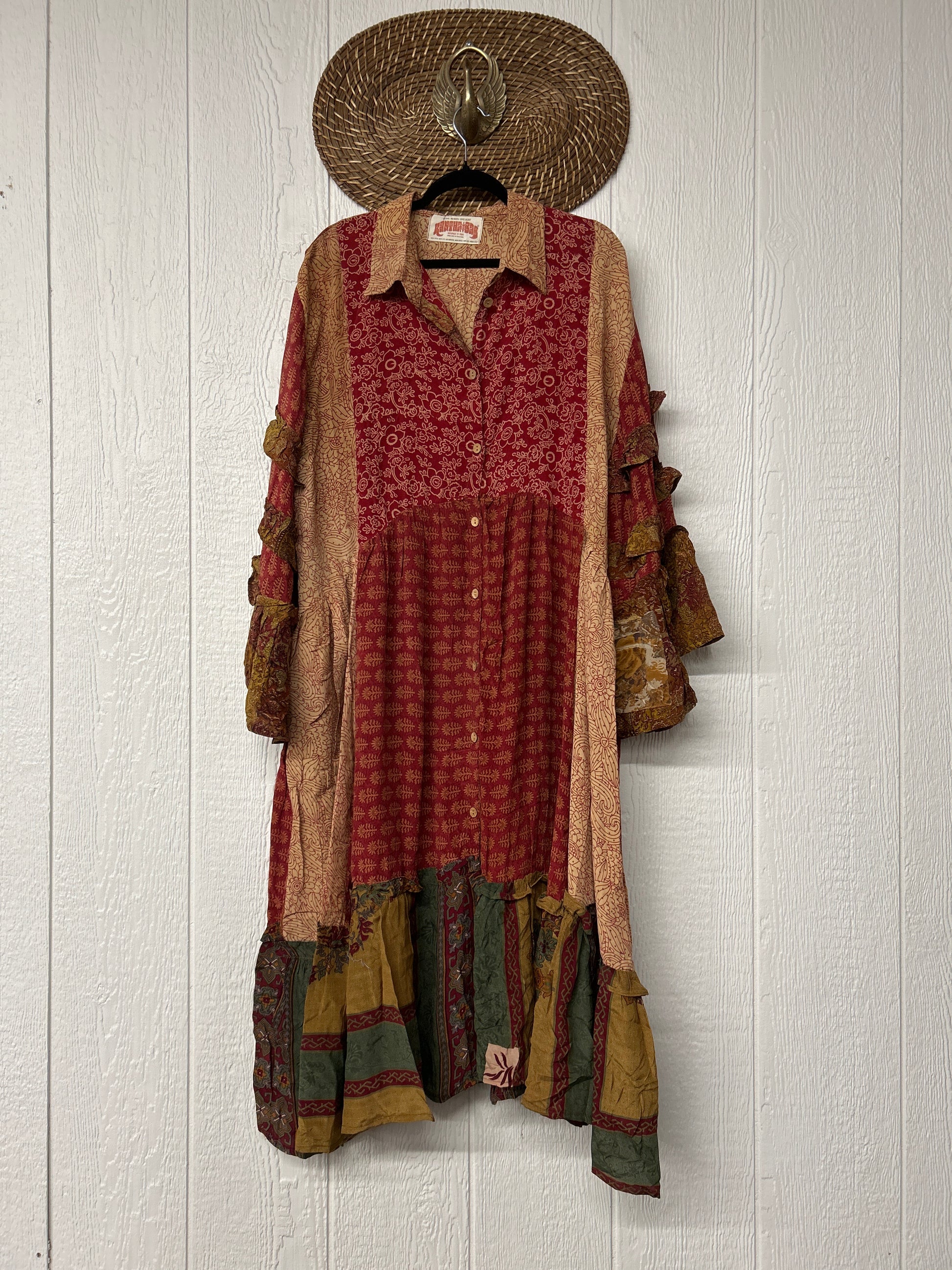 Made from our ultra lux vintage crepe sari this dreamy piece features ruffle bell sleeves, button down front, collar, mixed prints throughout and a fabulous ruffle hem.
