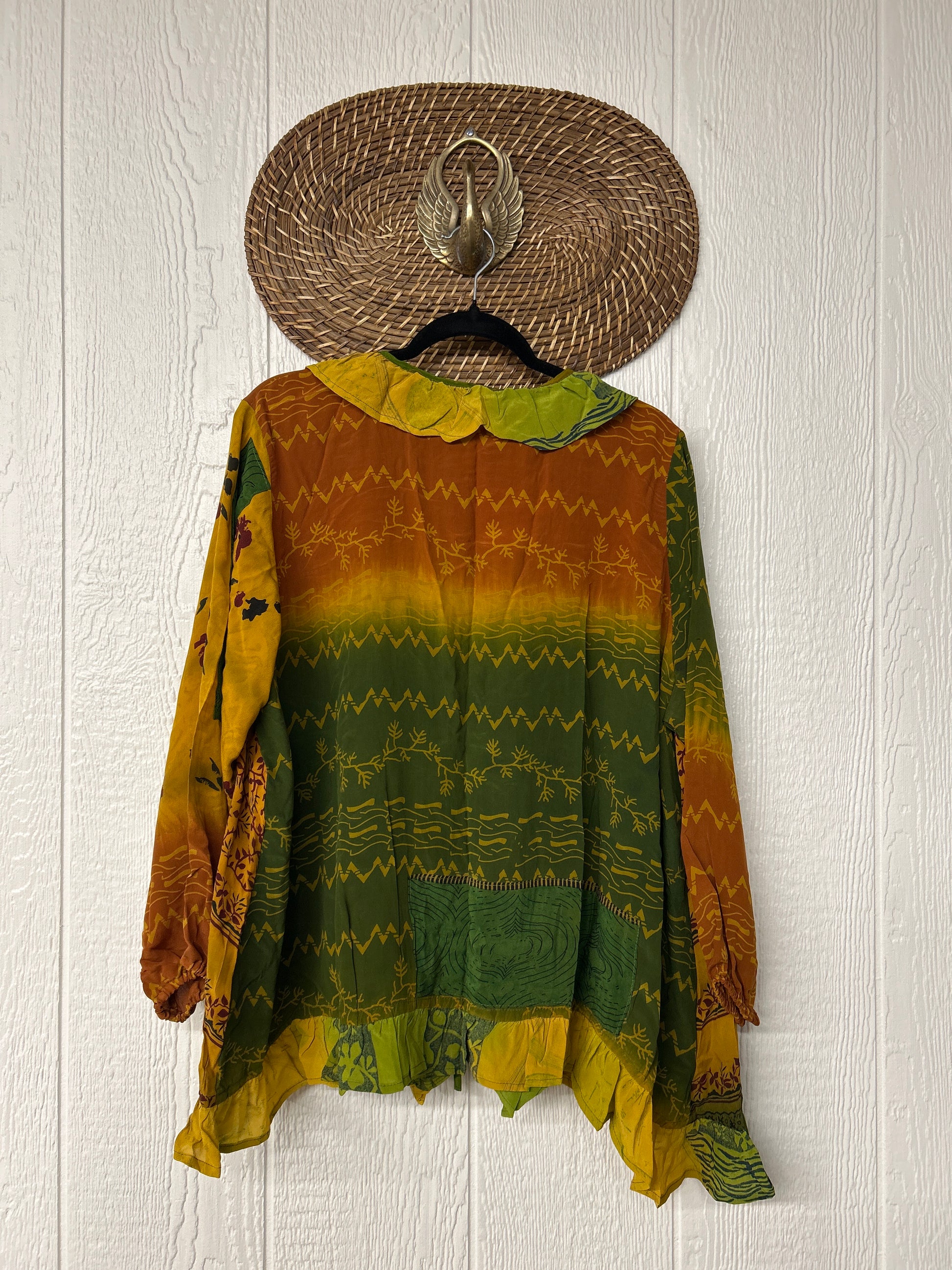 Disclosure: Our vintage styles have lived a full life before becoming the designs in our shop. Fabrics may have small threads or holes in the layers. Color inconsistency or small stains may be present. The saris are sewn together and extend the life of each design. Imperfections should be celebrated