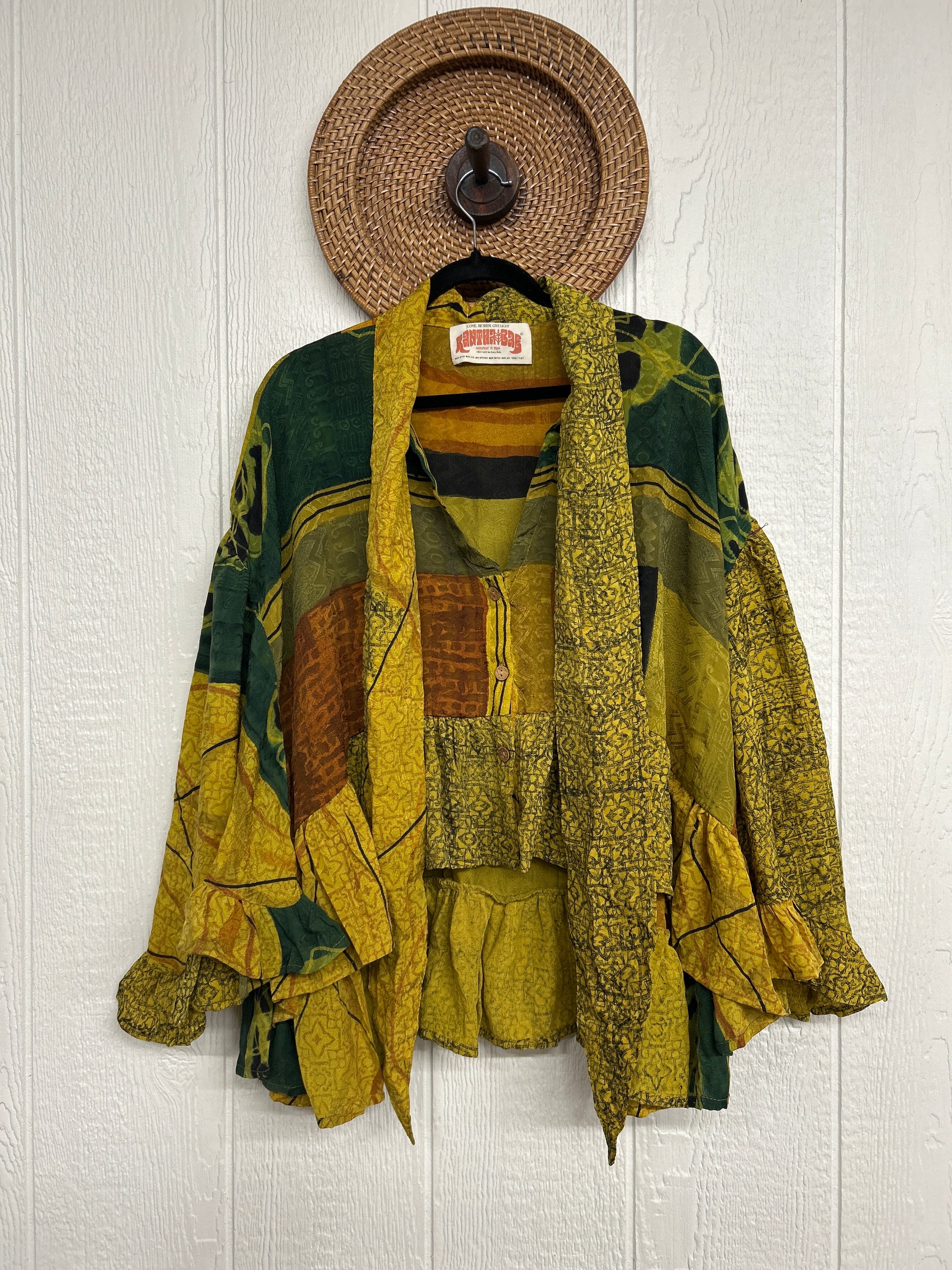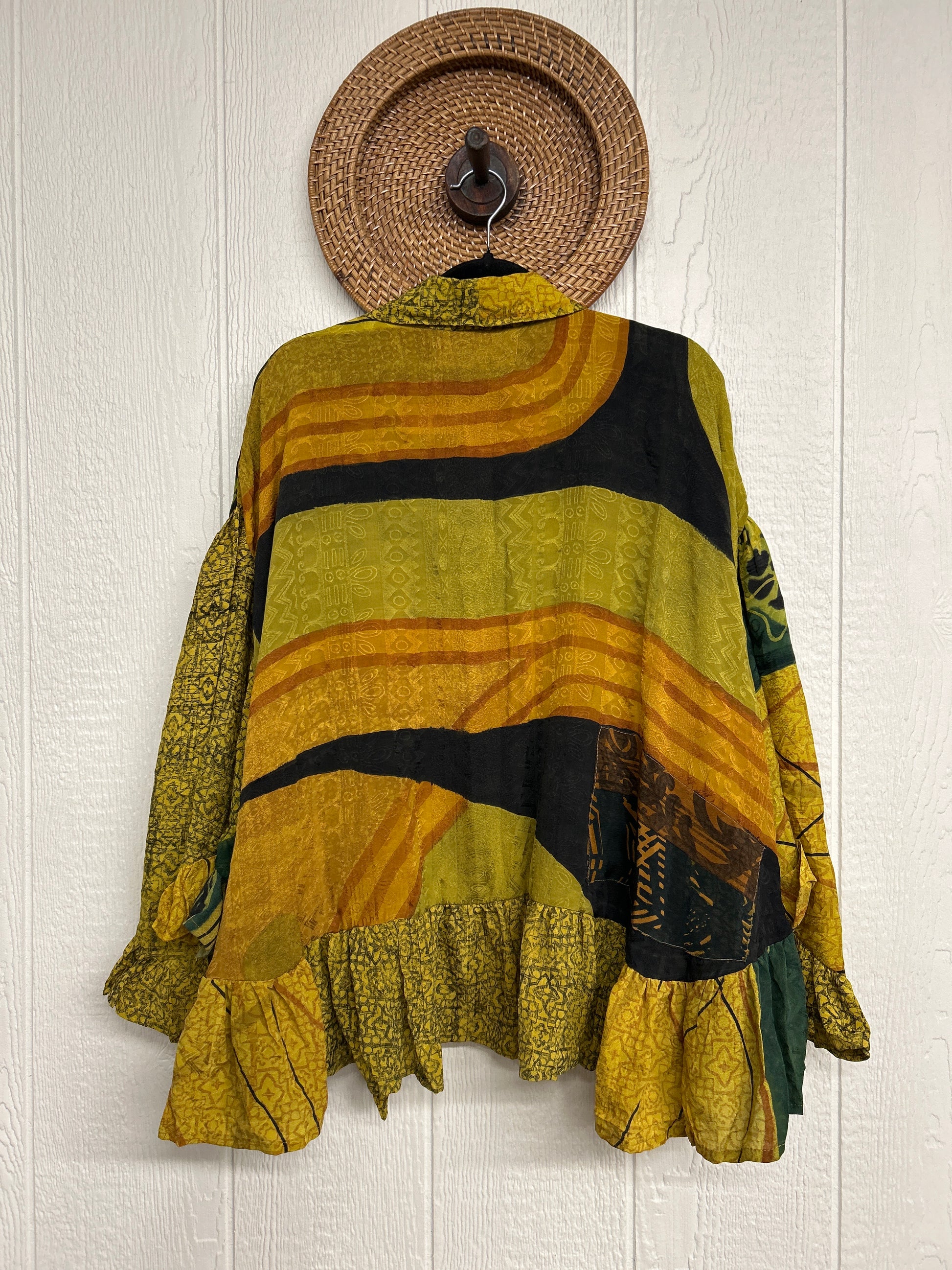 Crafted from vintage crepe sari this romantic piece features ruffles throughout, tie closure on the neck that can be opened or closed, fully functional button placket, high low hem, bell sleeve.