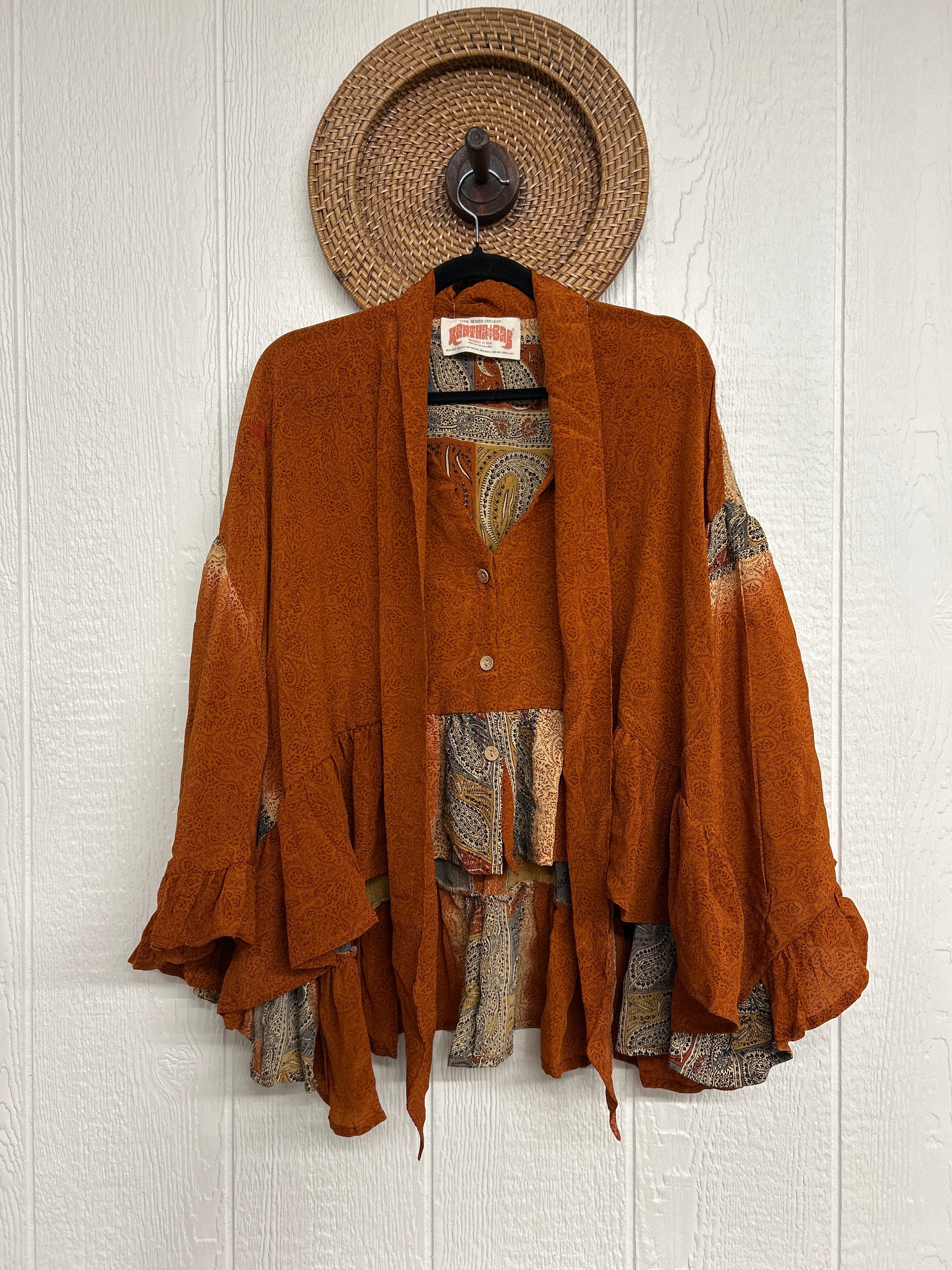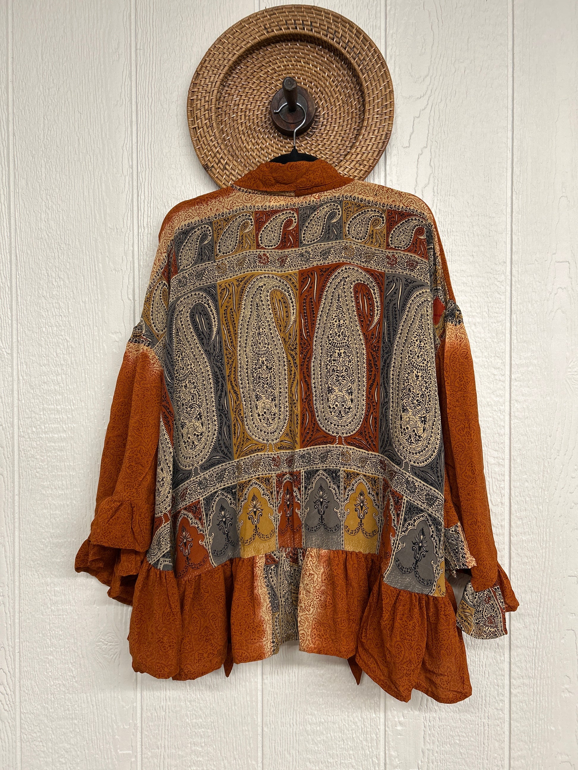 Crafted from vintage crepe sari this romantic piece features ruffles throughout, tie closure on the neck that can be opened or closed, fully functional button placket, high low hem, bell sleeve.
