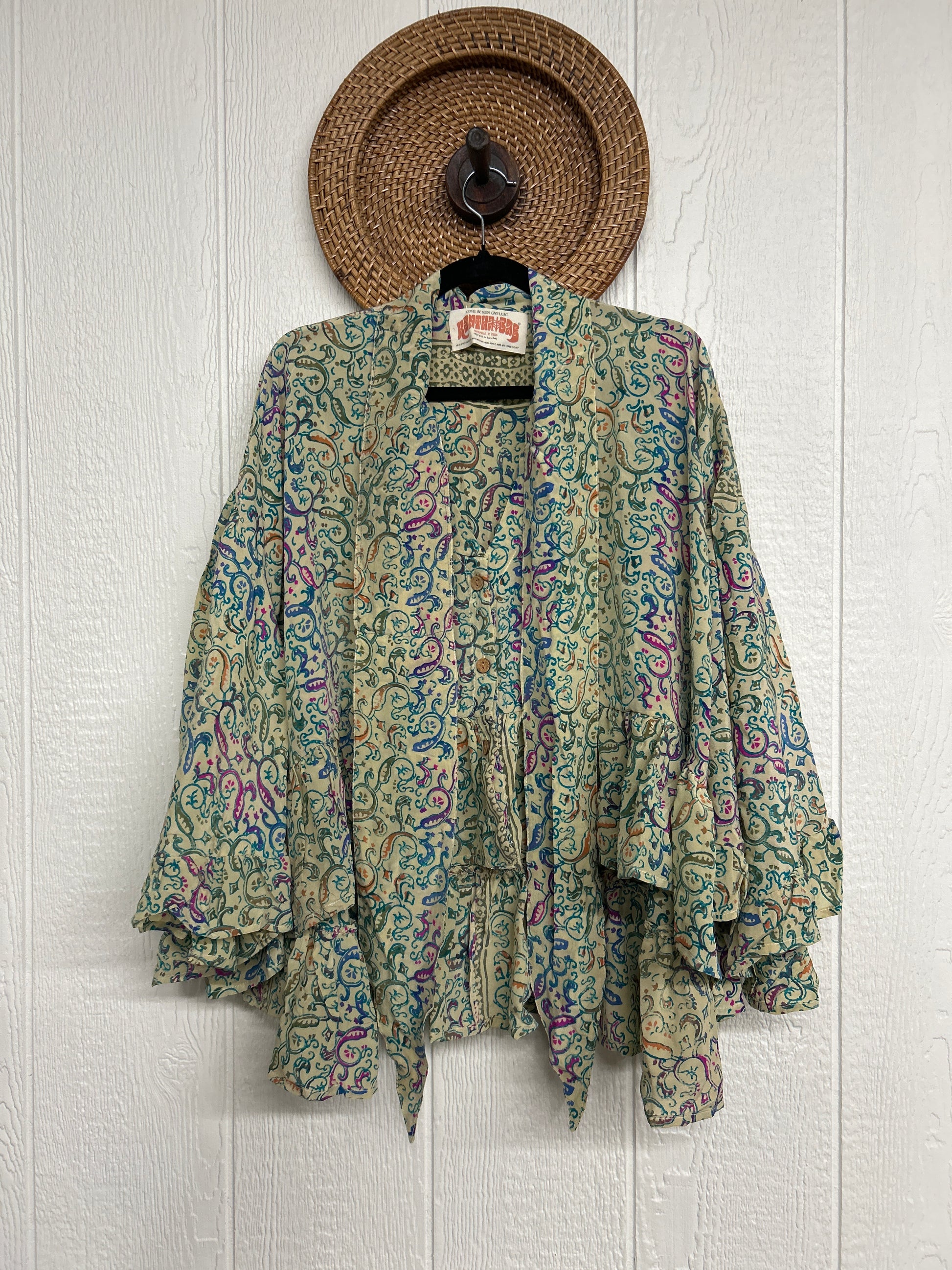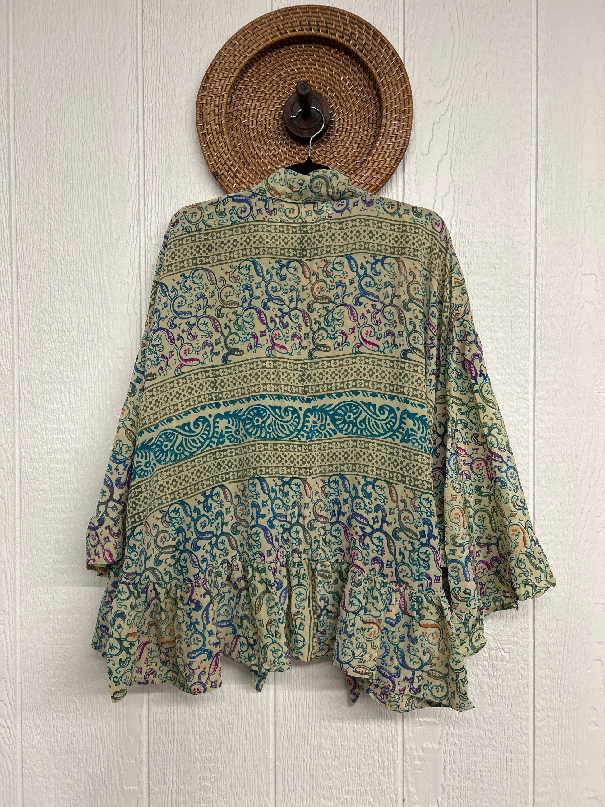 Crafted from vintage crepe sari this romantic piece features ruffles throughout, tie closure on the neck that can be opened or closed, fully functional button placket, high low hem, bell sleeve.