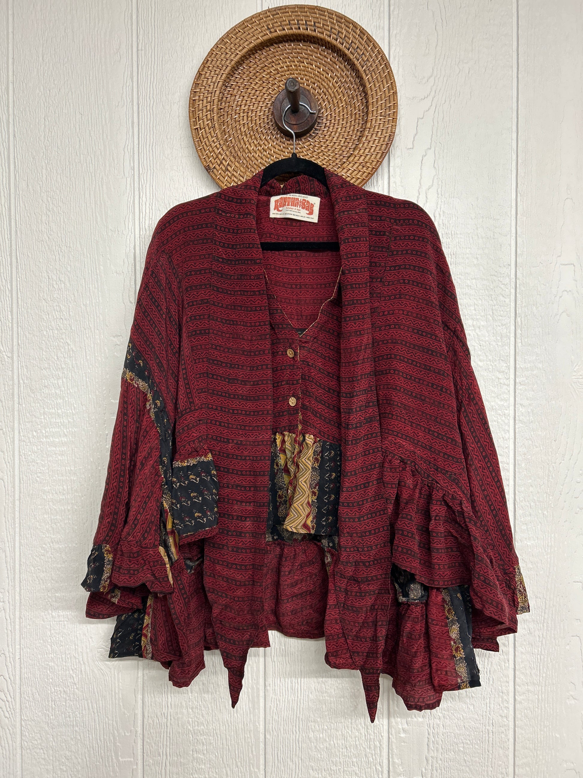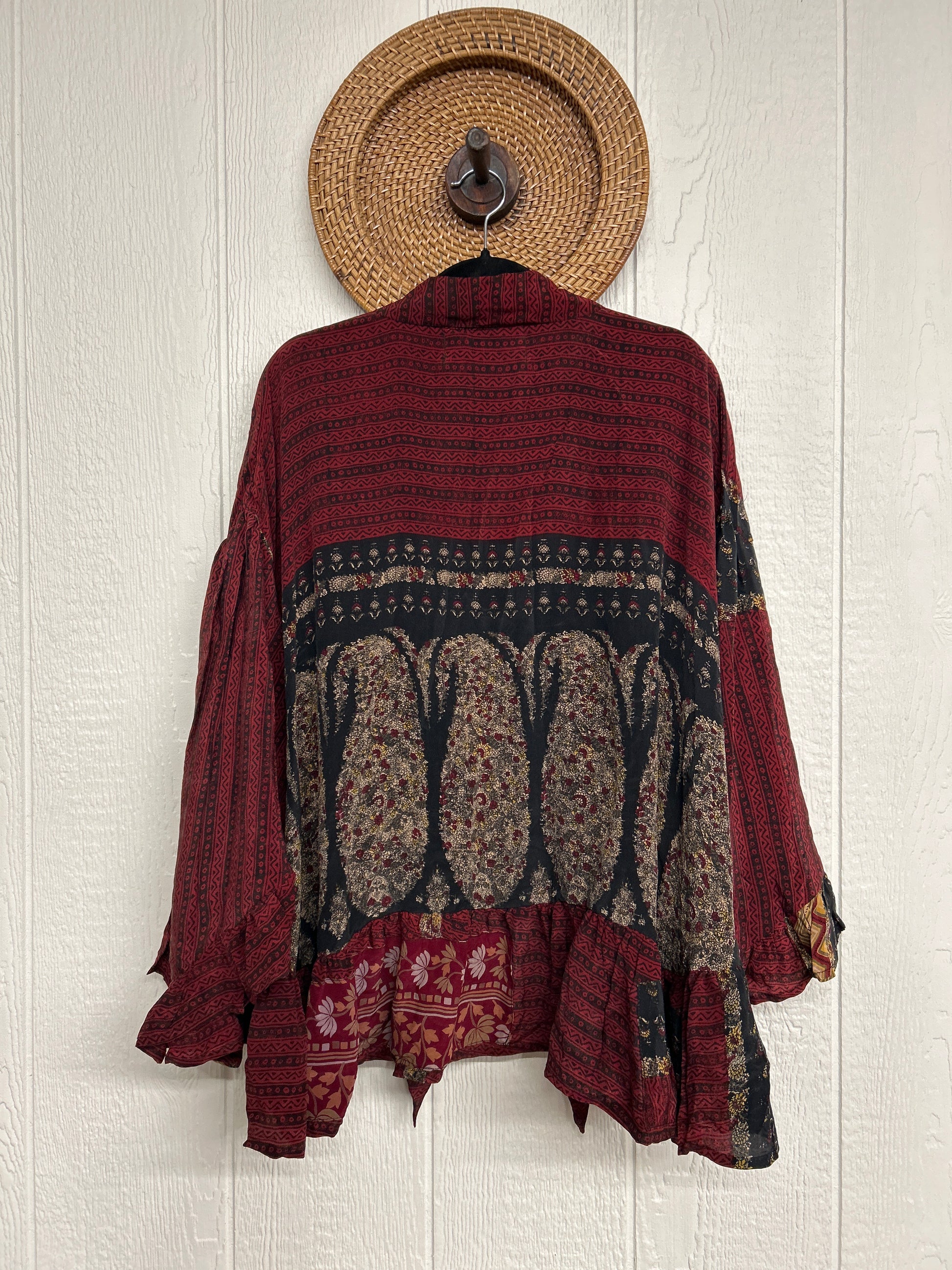 Crafted from vintage crepe sari this romantic piece features ruffles throughout, tie closure on the neck that can be opened or closed, fully functional button placket, high low hem, bell sleeve.