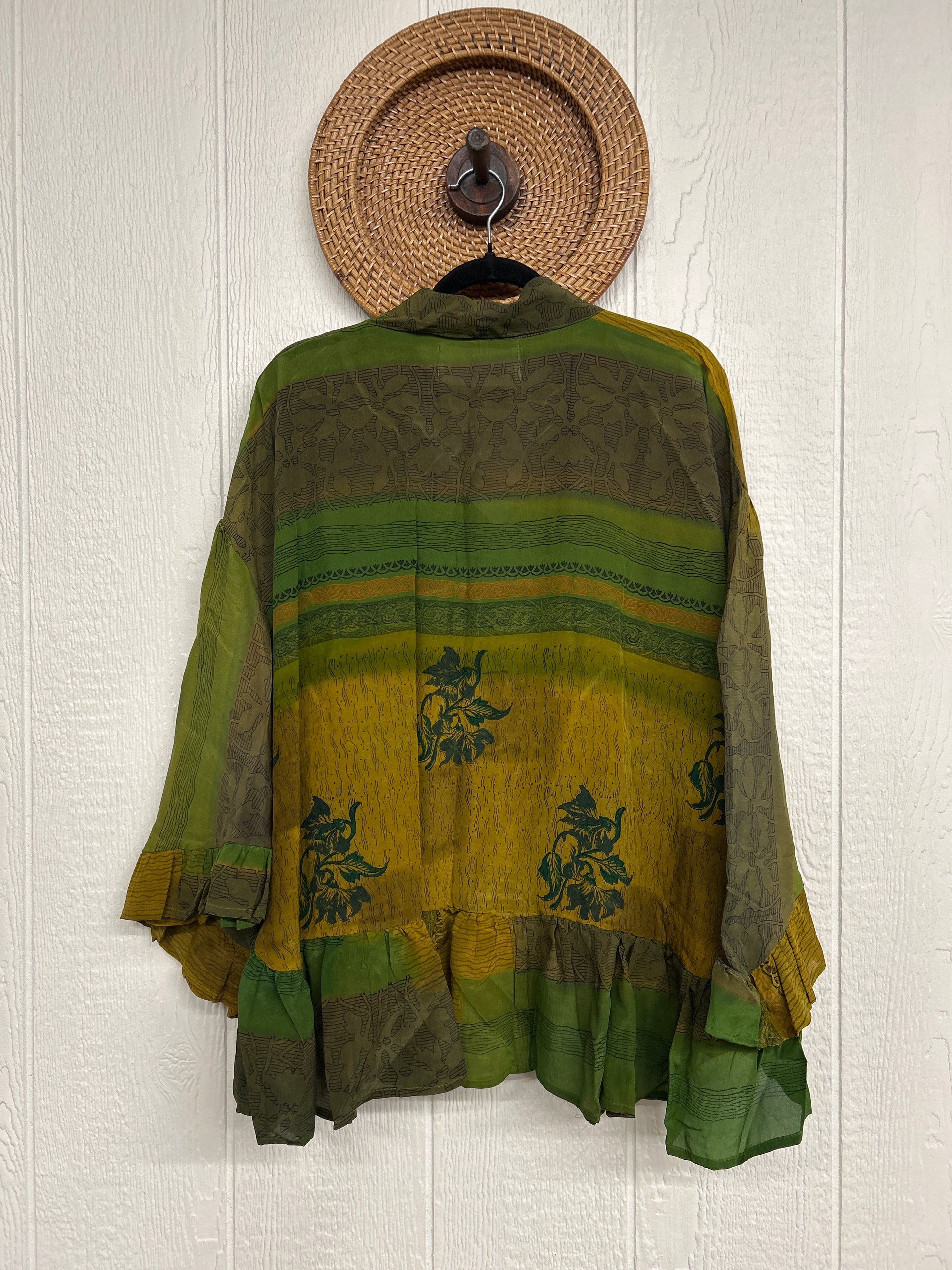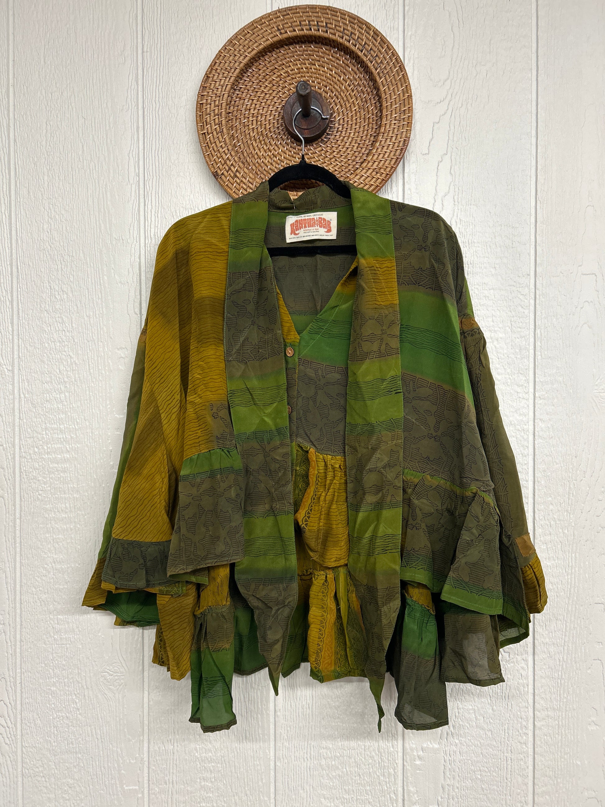 Crafted from vintage crepe sari this romantic piece features ruffles throughout, tie closure on the neck that can be opened or closed, fully functional button placket, high low hem, bell sleeve.