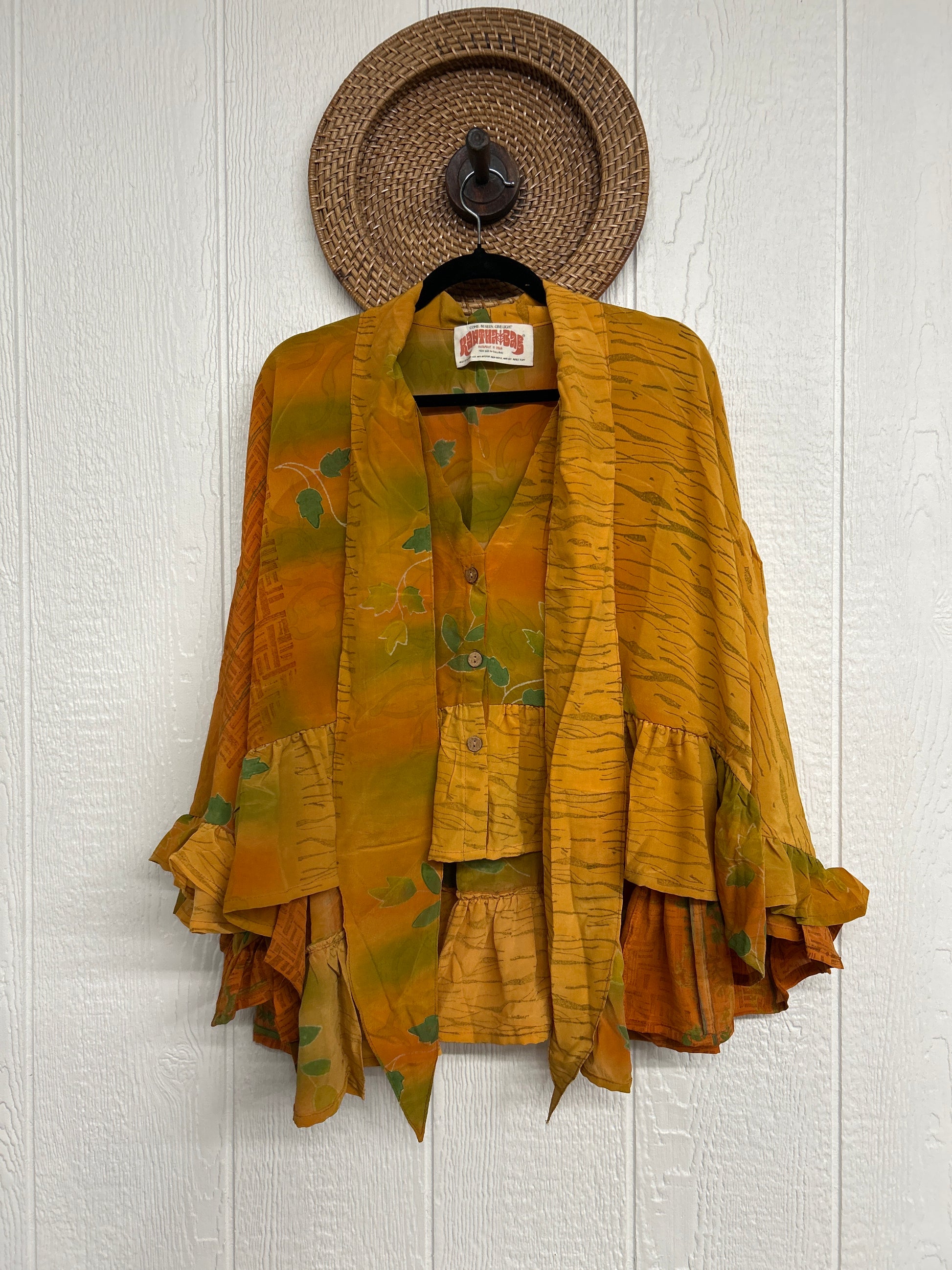 Crafted from vintage crepe sari this romantic piece features ruffles throughout, tie closure on the neck that can be opened or closed, fully functional button placket, high low hem, bell sleeve.
