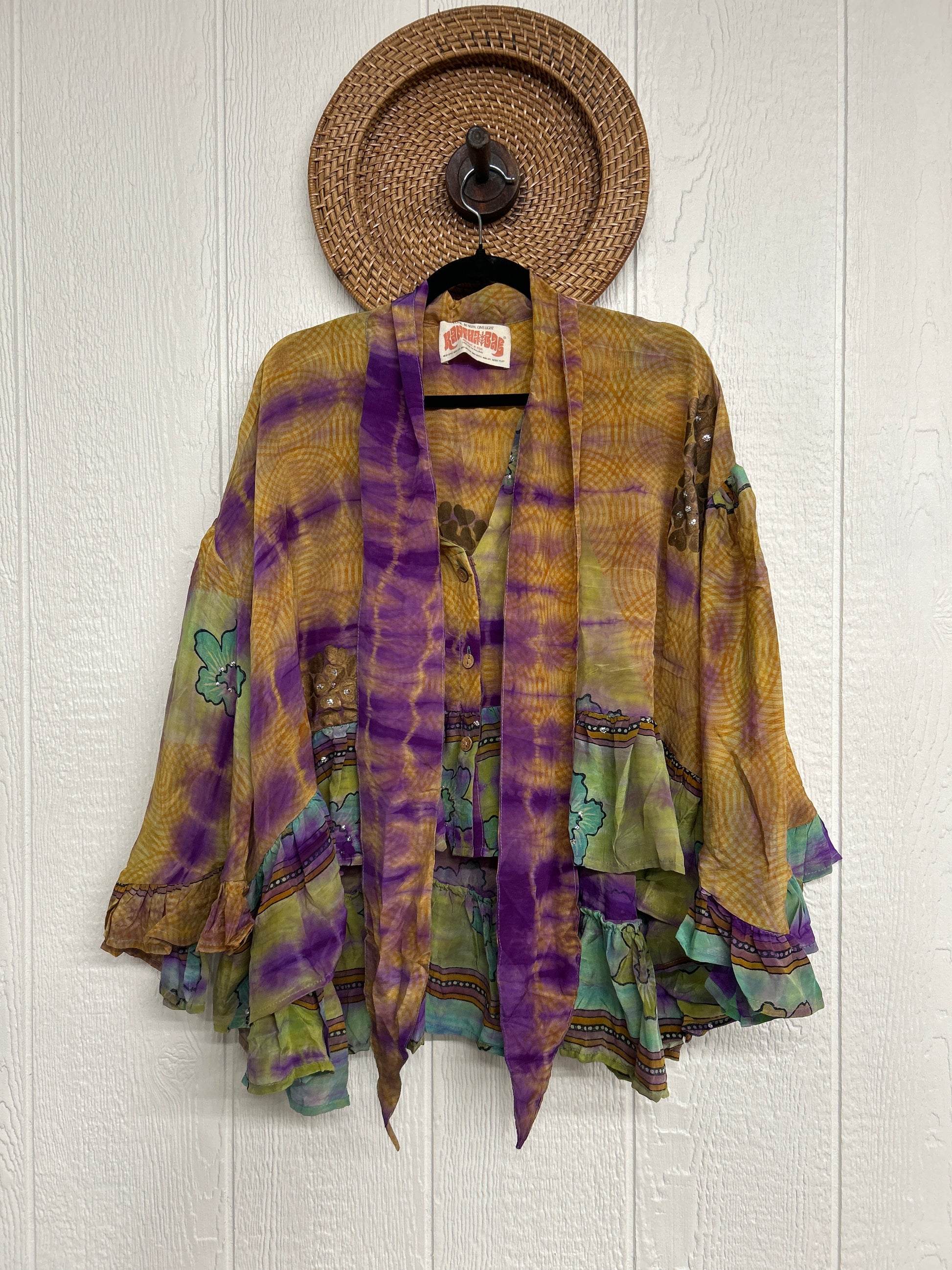 Crafted from vintage crepe sari this romantic piece features ruffles throughout, tie closure on the neck that can be opened or closed, fully functional button placket, high low hem, bell sleeve.