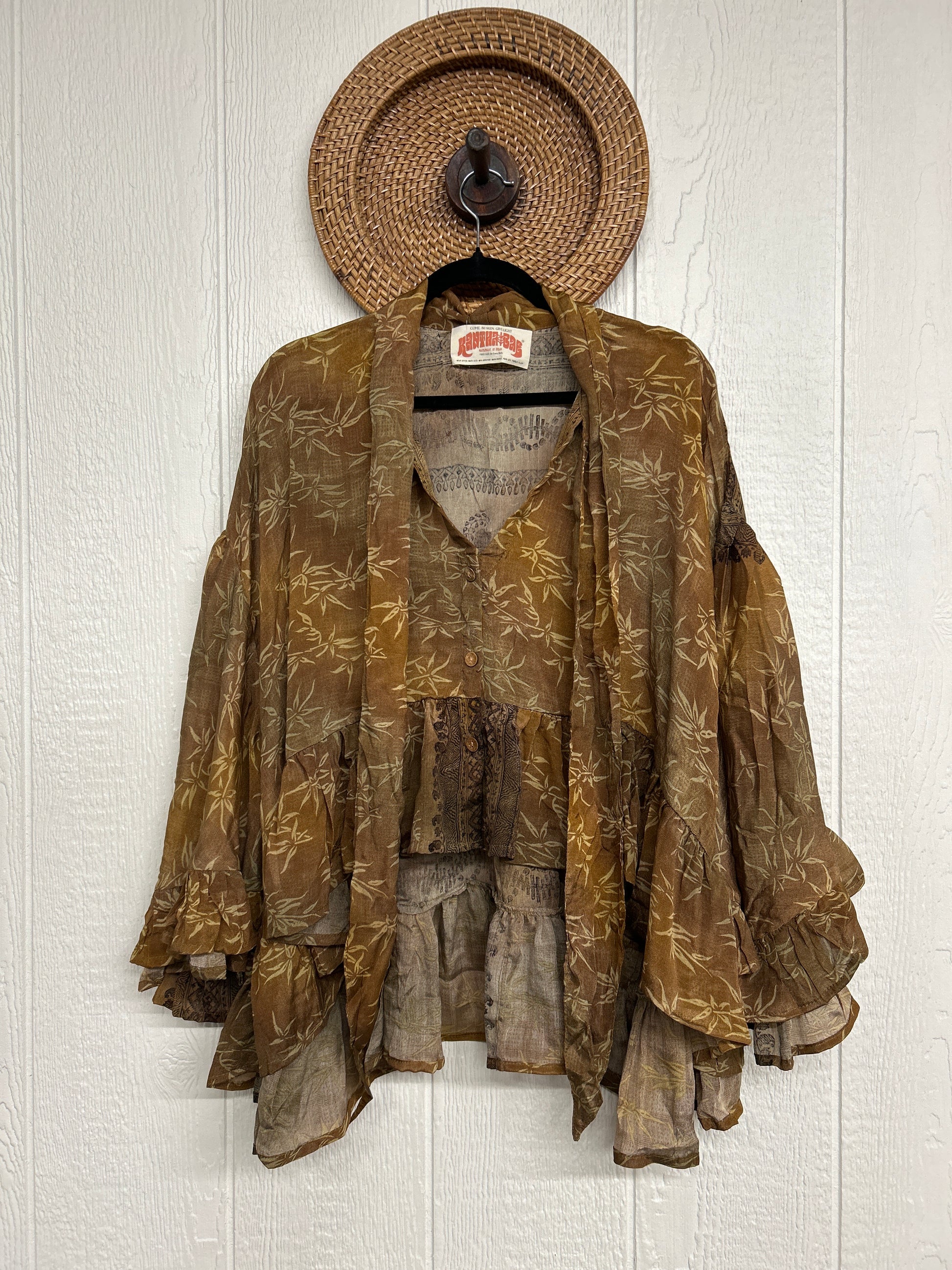 Crafted from vintage crepe sari this romantic piece features ruffles throughout, tie closure on the neck that can be opened or closed, fully functional button placket, high low hem, bell sleeve.