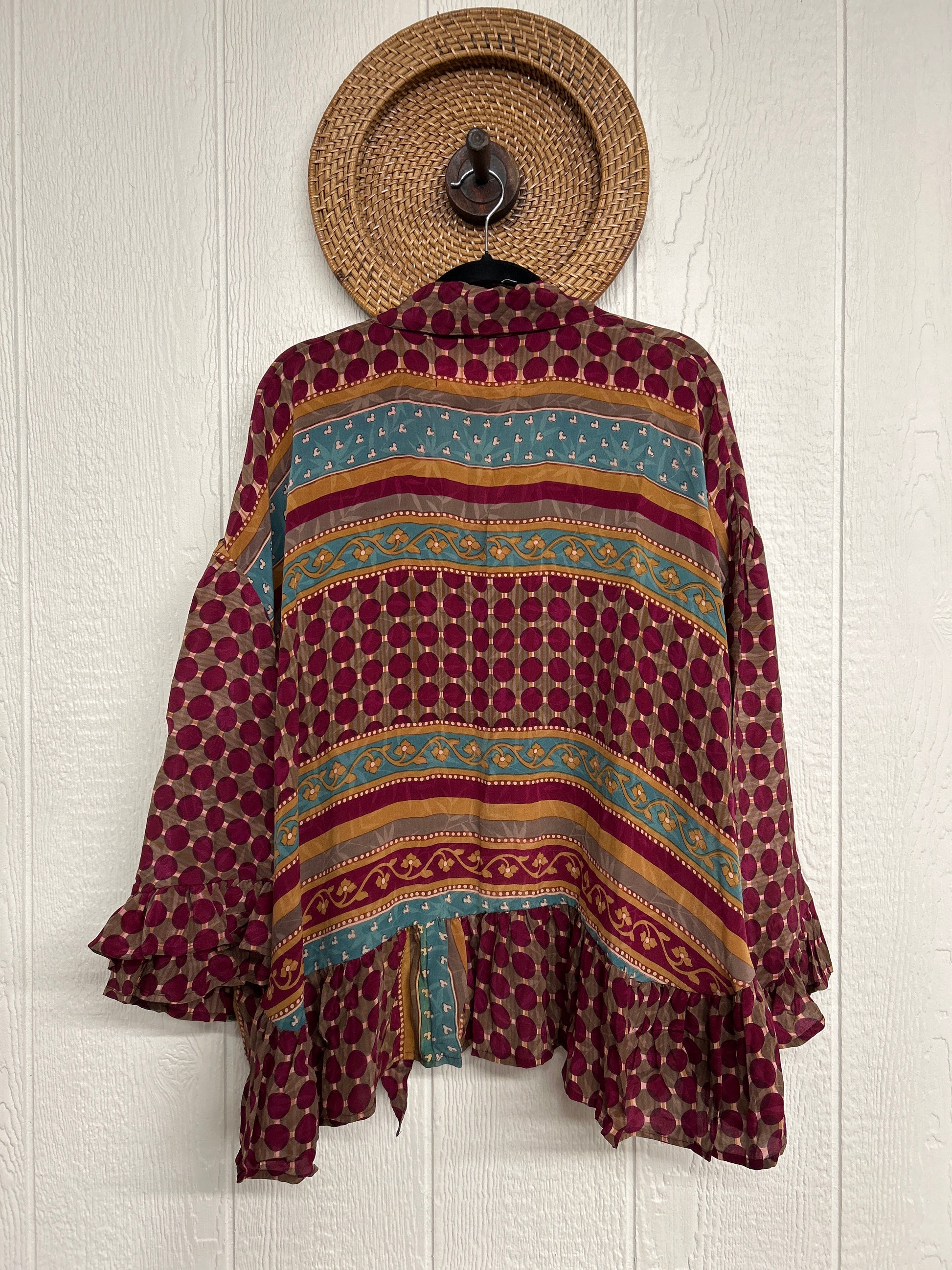Crafted from vintage crepe sari this romantic piece features ruffles throughout, tie closure on the neck that can be opened or closed, fully functional button placket, high low hem, bell sleeve.