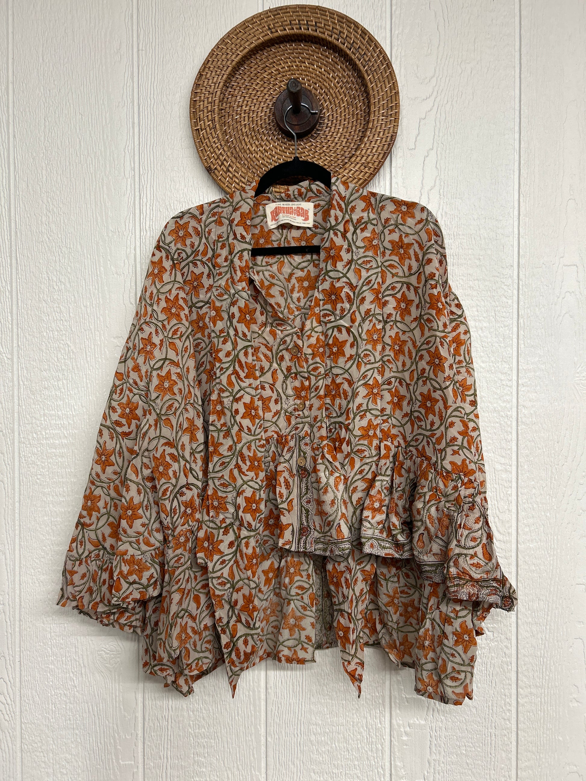 Crafted from vintage crepe sari this romantic piece features ruffles throughout, tie closure on the neck that can be opened or closed, fully functional button placket, high low hem, bell sleeve.