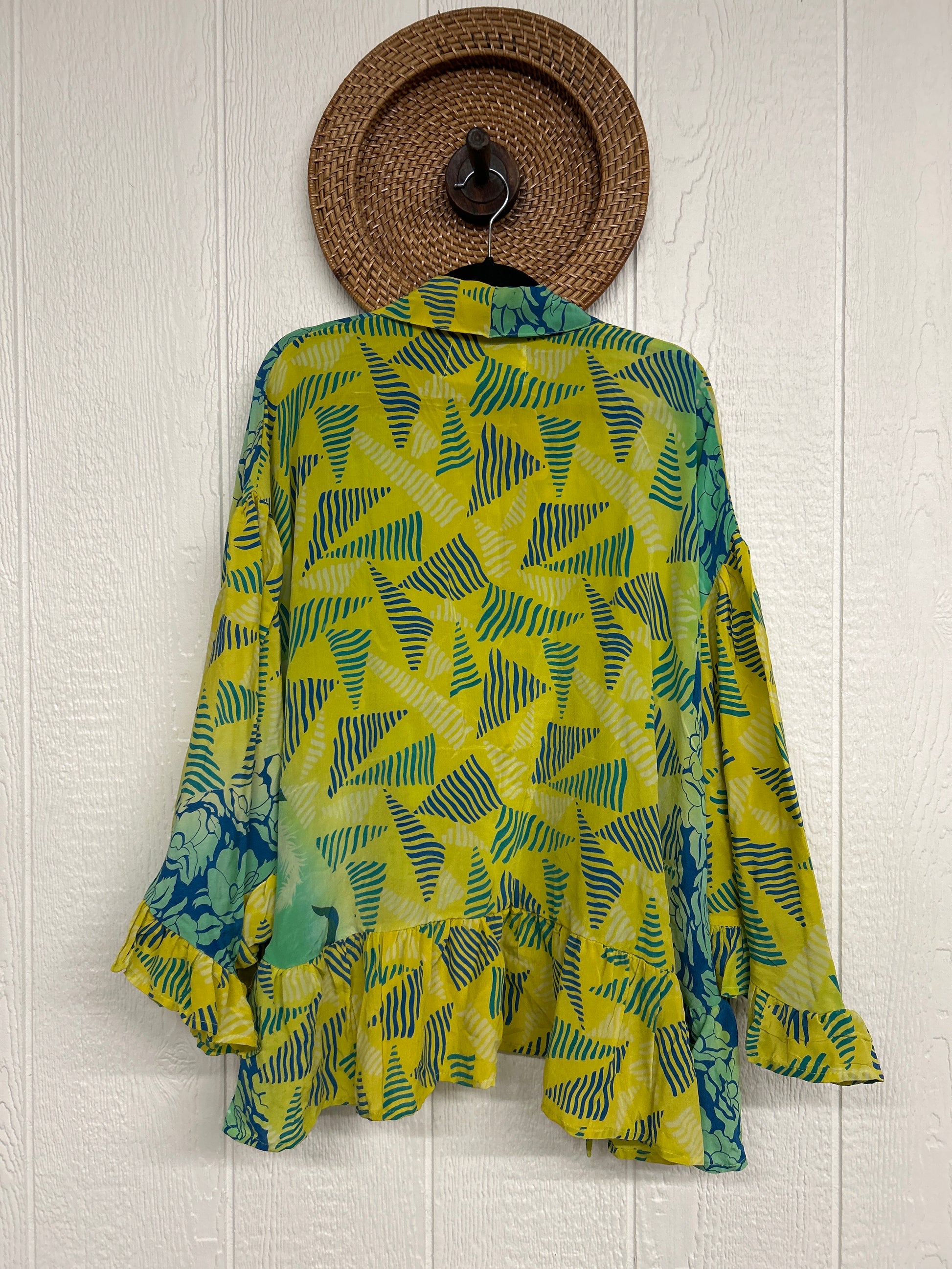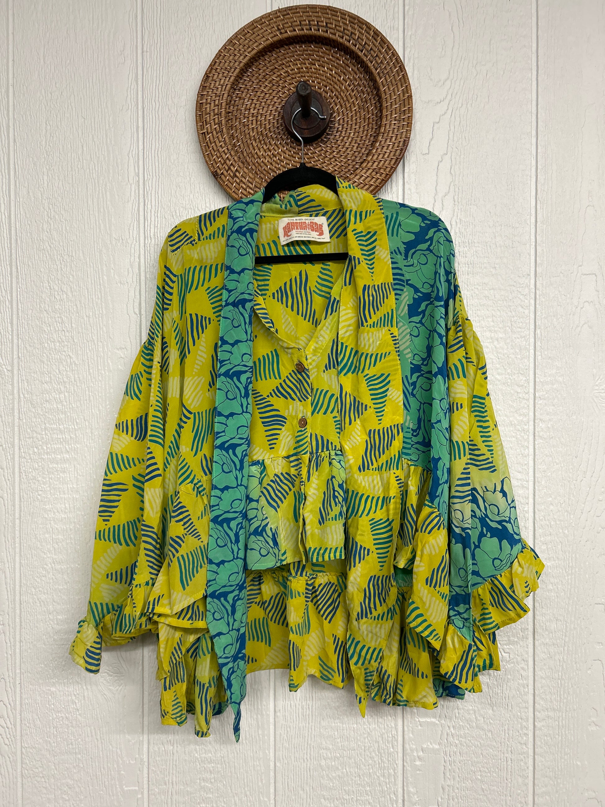 Crafted from vintage crepe sari this romantic piece features ruffles throughout, tie closure on the neck that can be opened or closed, fully functional button placket, high low hem, bell sleeve.
