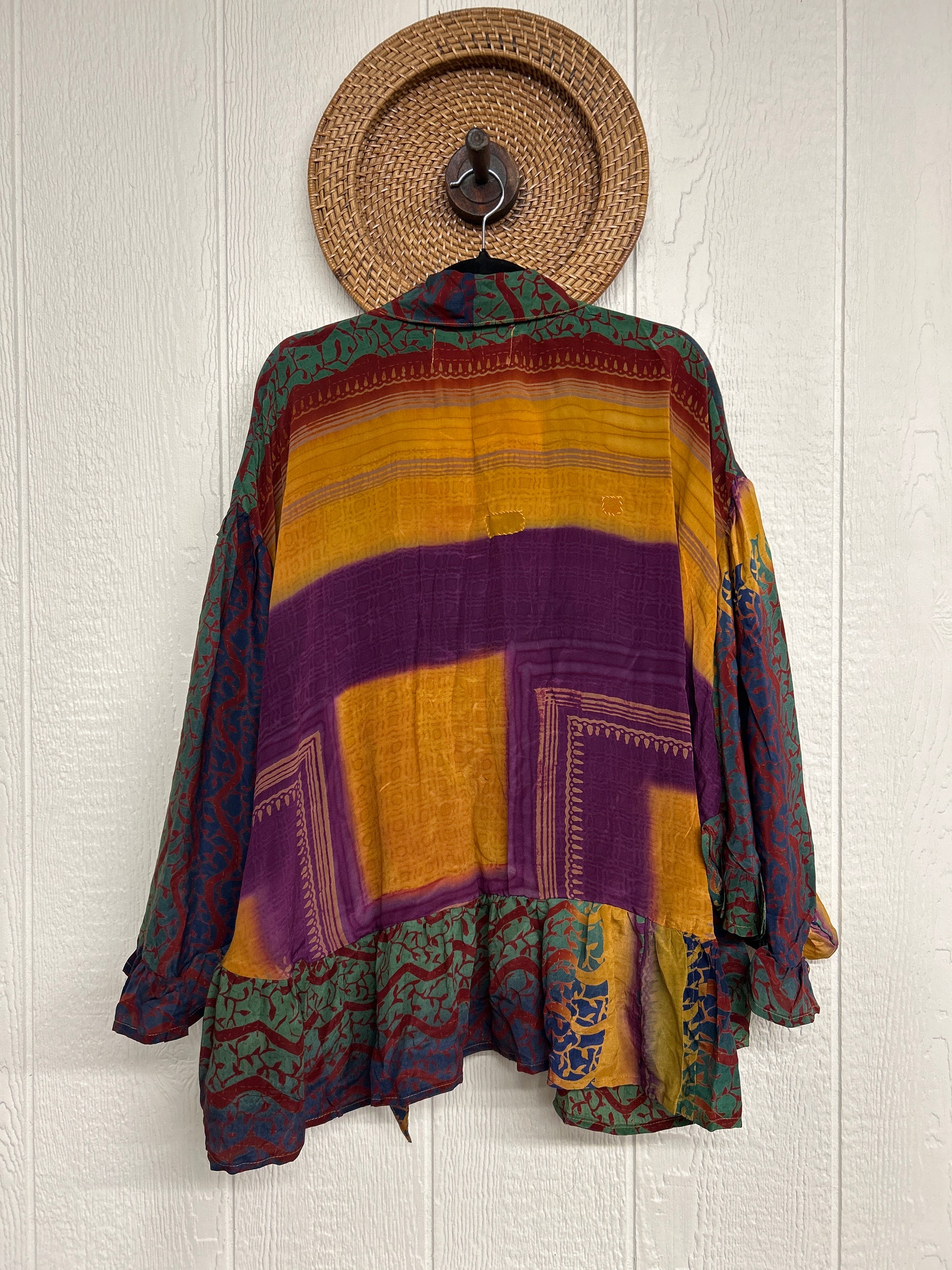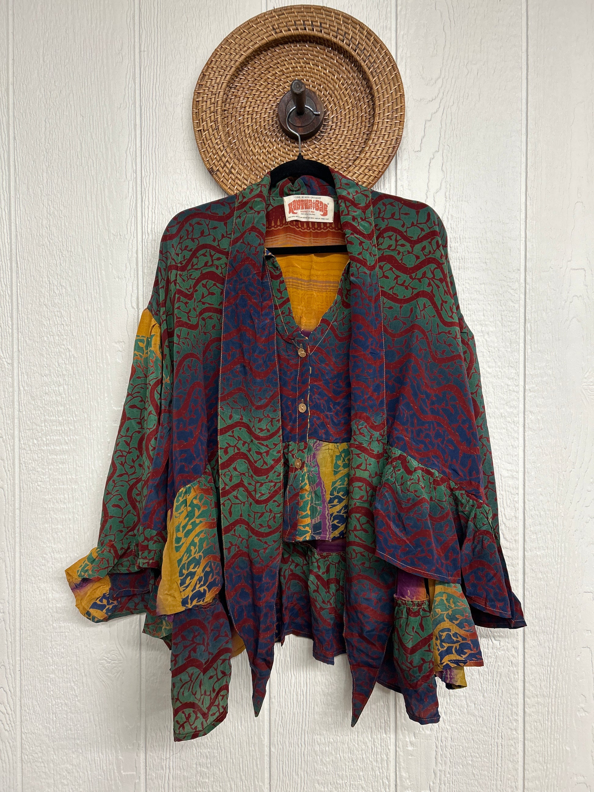 Crafted from vintage crepe sari this romantic piece features ruffles throughout, tie closure on the neck that can be opened or closed, fully functional button placket, high low hem, bell sleeve.