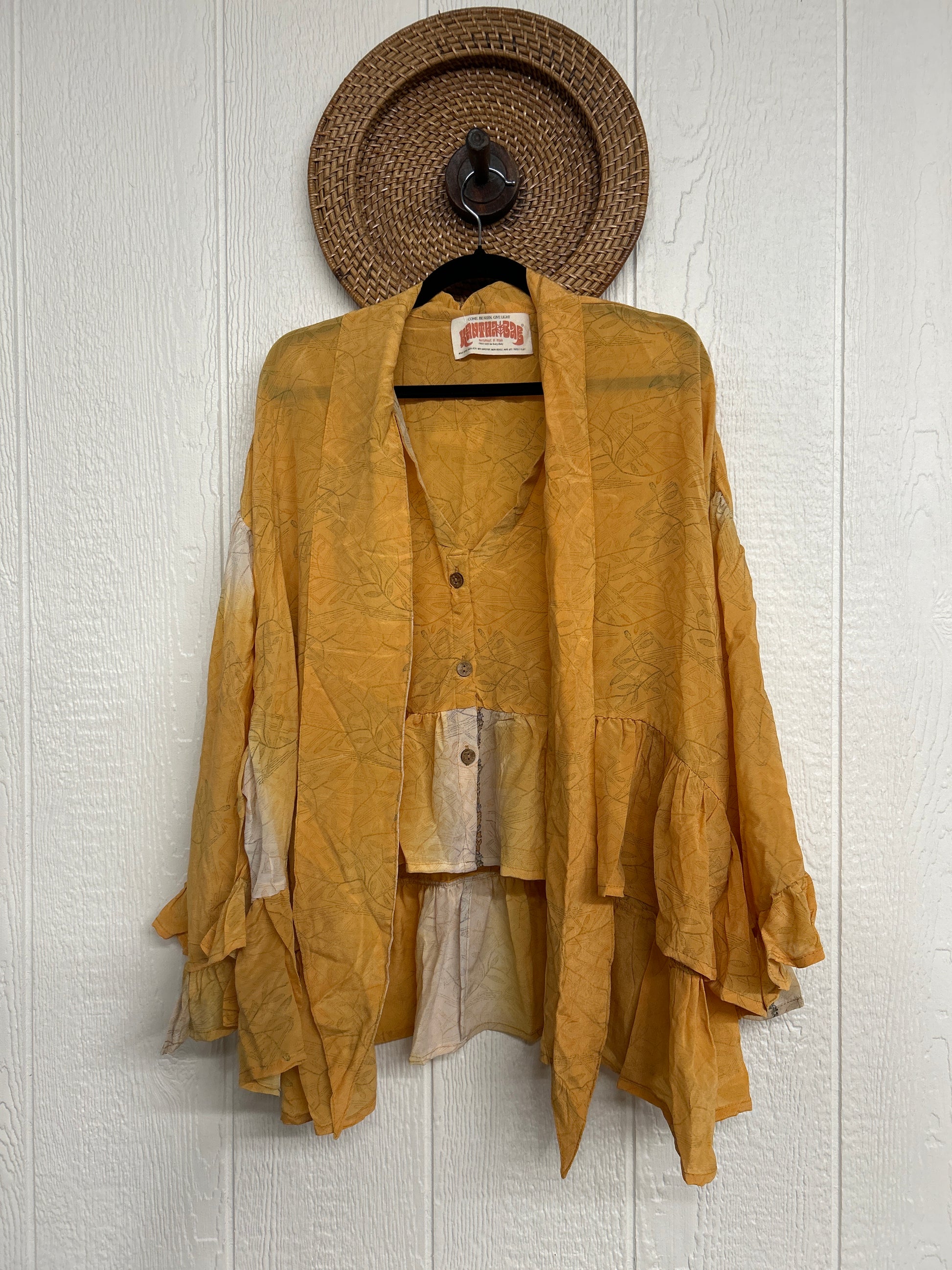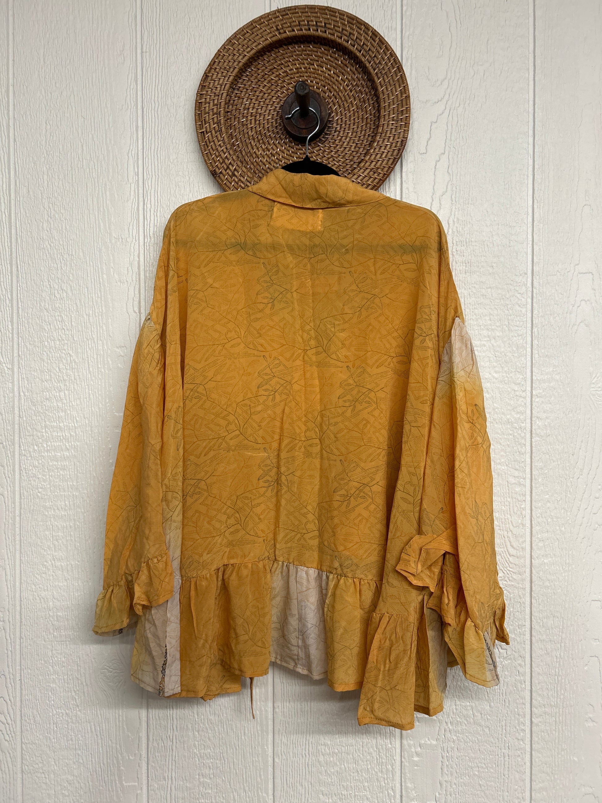 Crafted from vintage crepe sari this romantic piece features ruffles throughout, tie closure on the neck that can be opened or closed, fully functional button placket, high low hem, bell sleeve.