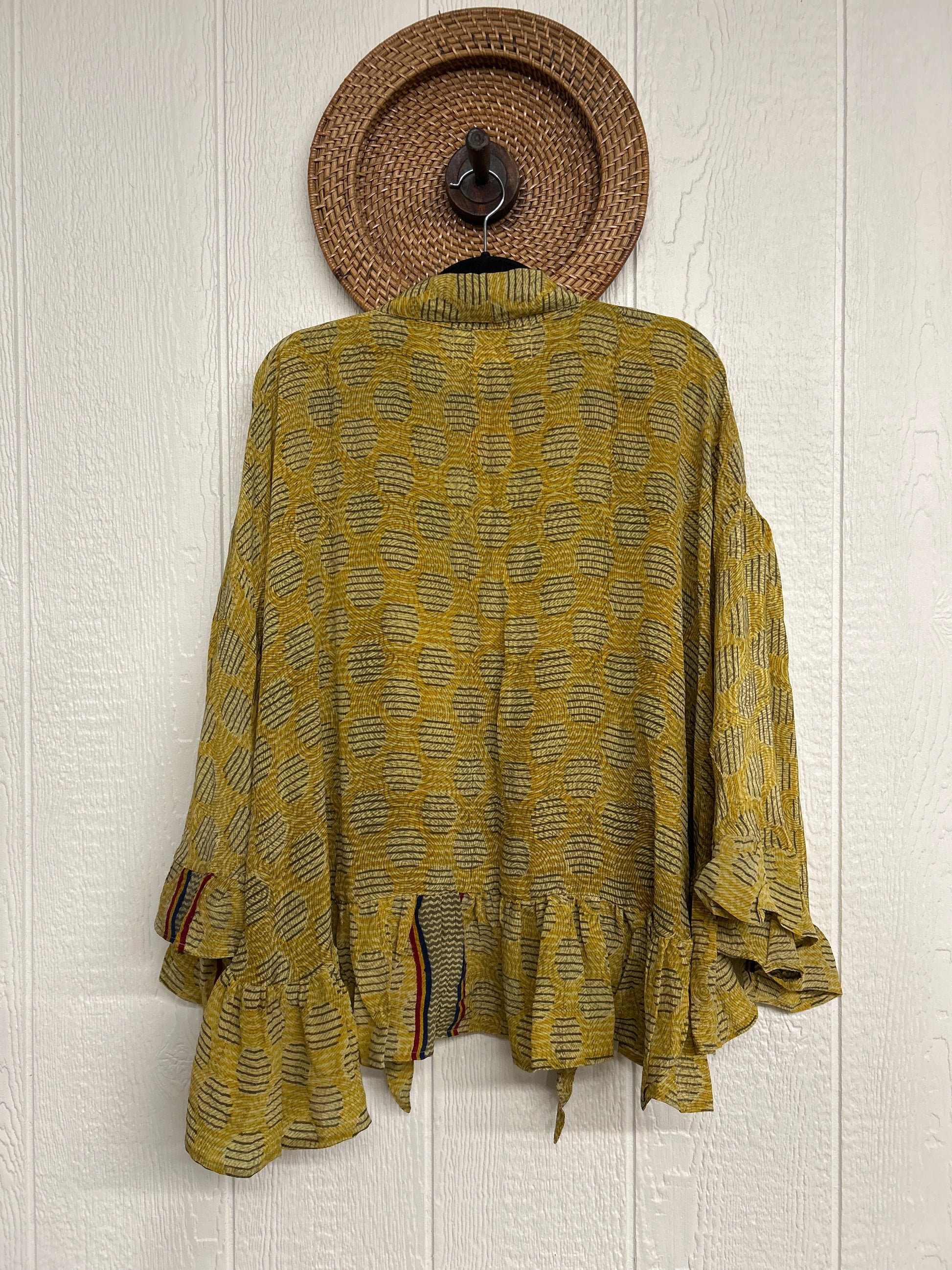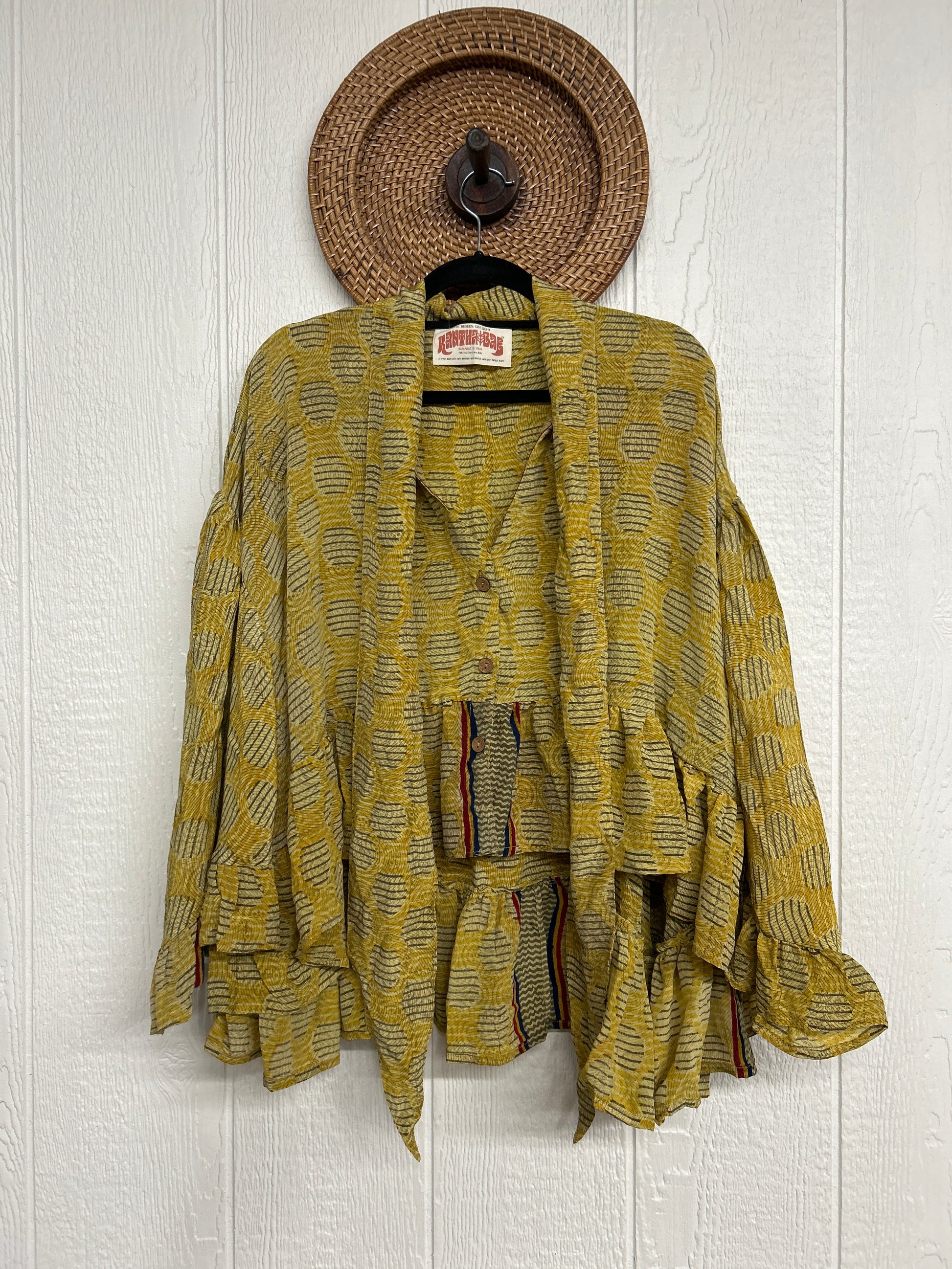 Crafted from vintage crepe sari this romantic piece features ruffles throughout, tie closure on the neck that can be opened or closed, fully functional button placket, high low hem, bell sleeve.