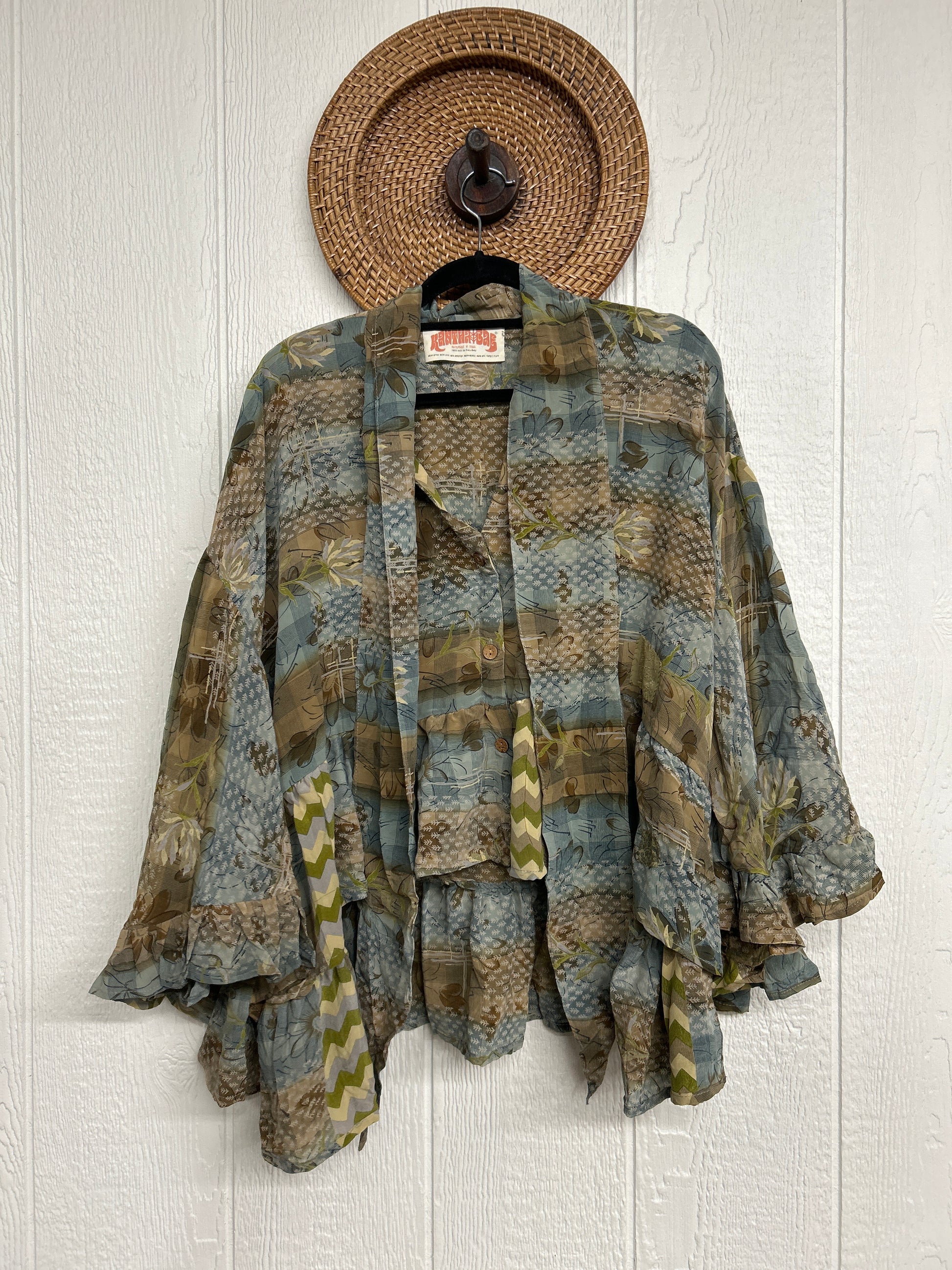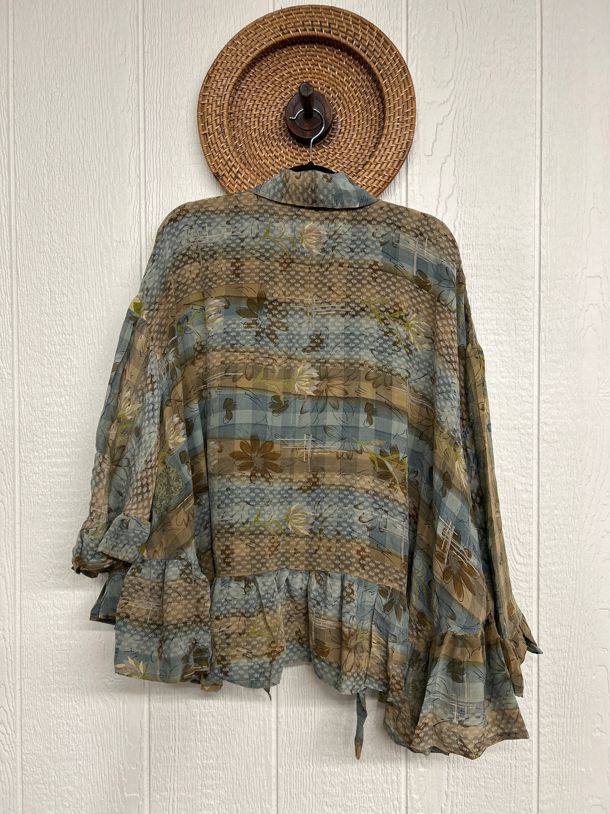 Crafted from vintage crepe sari this romantic piece features ruffles throughout, tie closure on the neck that can be opened or closed, fully functional button placket, high low hem, bell sleeve.