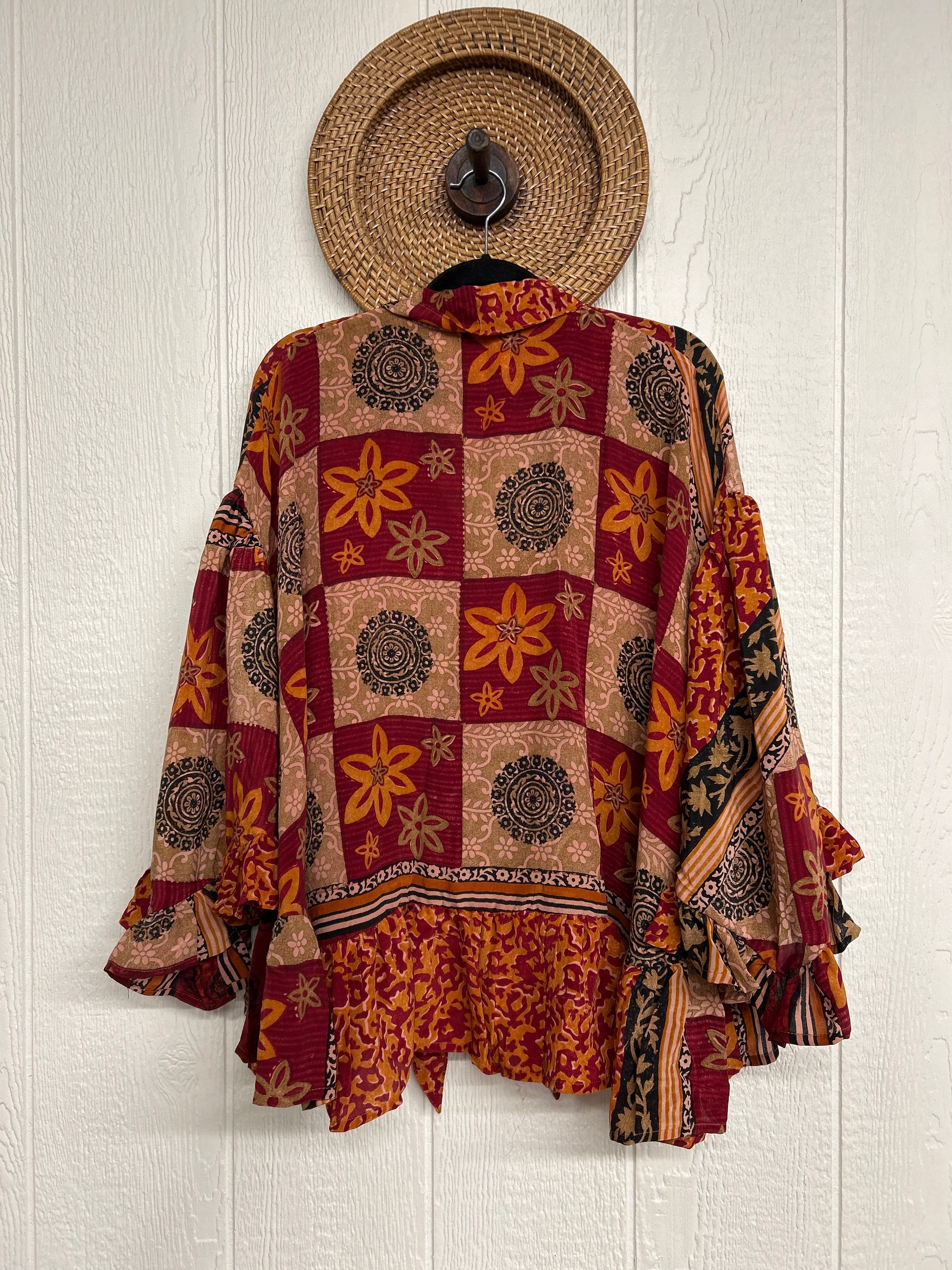 Crafted from vintage crepe sari this romantic piece features ruffles throughout, tie closure on the neck that can be opened or closed, fully functional button placket, high low hem, bell sleeve.